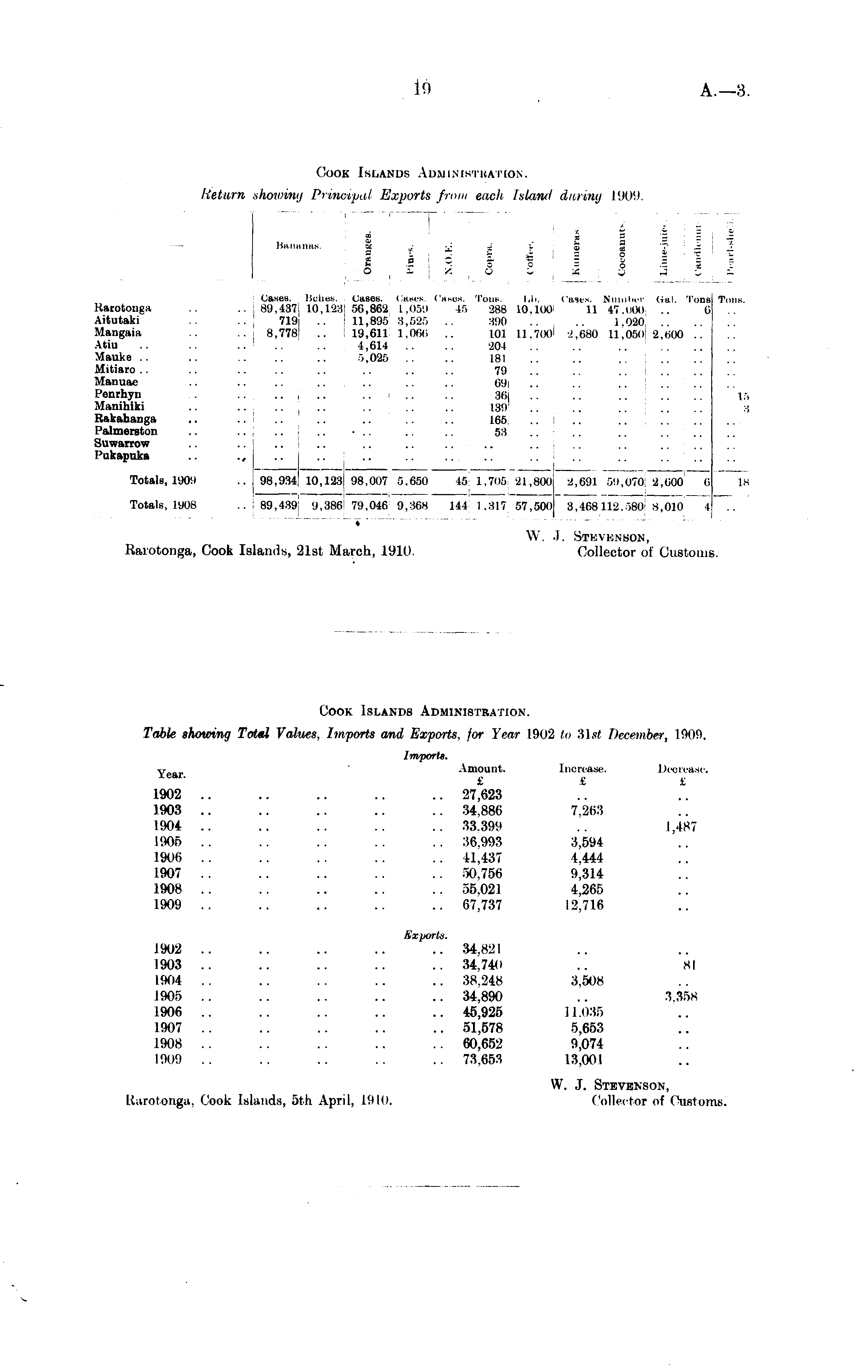 Cook Islands Administration. Table showing Total Values, Imports and Exports, for Year 1902 to 3lst December, 1909. Imports. Y Amount. Increase. Decrease. 1902 .. .. .. .. .. 27,623 1903 .. .. .. .. .. 34.886 7,263 1904 .. .. .. .. .. 33.399 .. 1,187 1905 .. .. .. .. .. 36.993 3,594 1906 .. .. .. .. .. 11,437 4,444 1907 .. .. .. 50.756 9,314 1908 .. .. .. .. .. 55.021 4,265 1909 .. .. .. .. .. 67,737 12,716 Kxporls. 1902 .. .. .. .. 34,821 1903 .. .. .. .. .. 34,740 .. 81 1904 .. .. .. .. 38.248 3,508 1905 .. .. .. .. .. 34,890 .. 3,358 1906 .. .. .. .. .. 45,925 11,035 1907 .. .. .. .. .. 51,578 5,653 1908 .. .. .. .. .. 60,652 9,074 1909 .. .. .. .. 73,653 13,001 W. J. Stevenson, Rarotonga, Cook Islands, sth April, 1910. Collector of Customs.