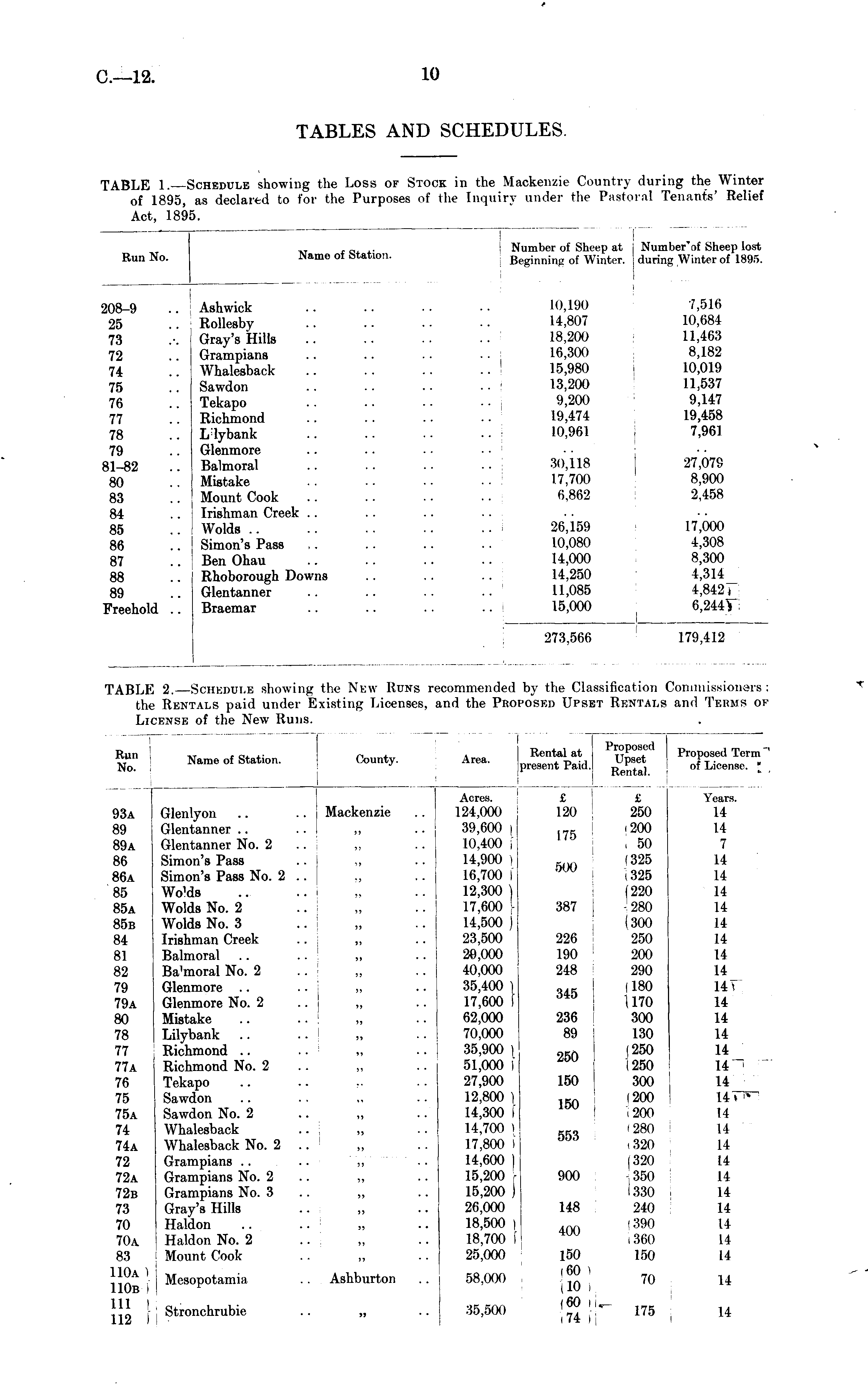 TABLE 1.—Schedule showing the Loss of Stock in the Mackenzie Country during the Winter of 1895, as declared to for the Purposes of the Inquiry under the Pastoral Tenants' Relief Act, 1895.