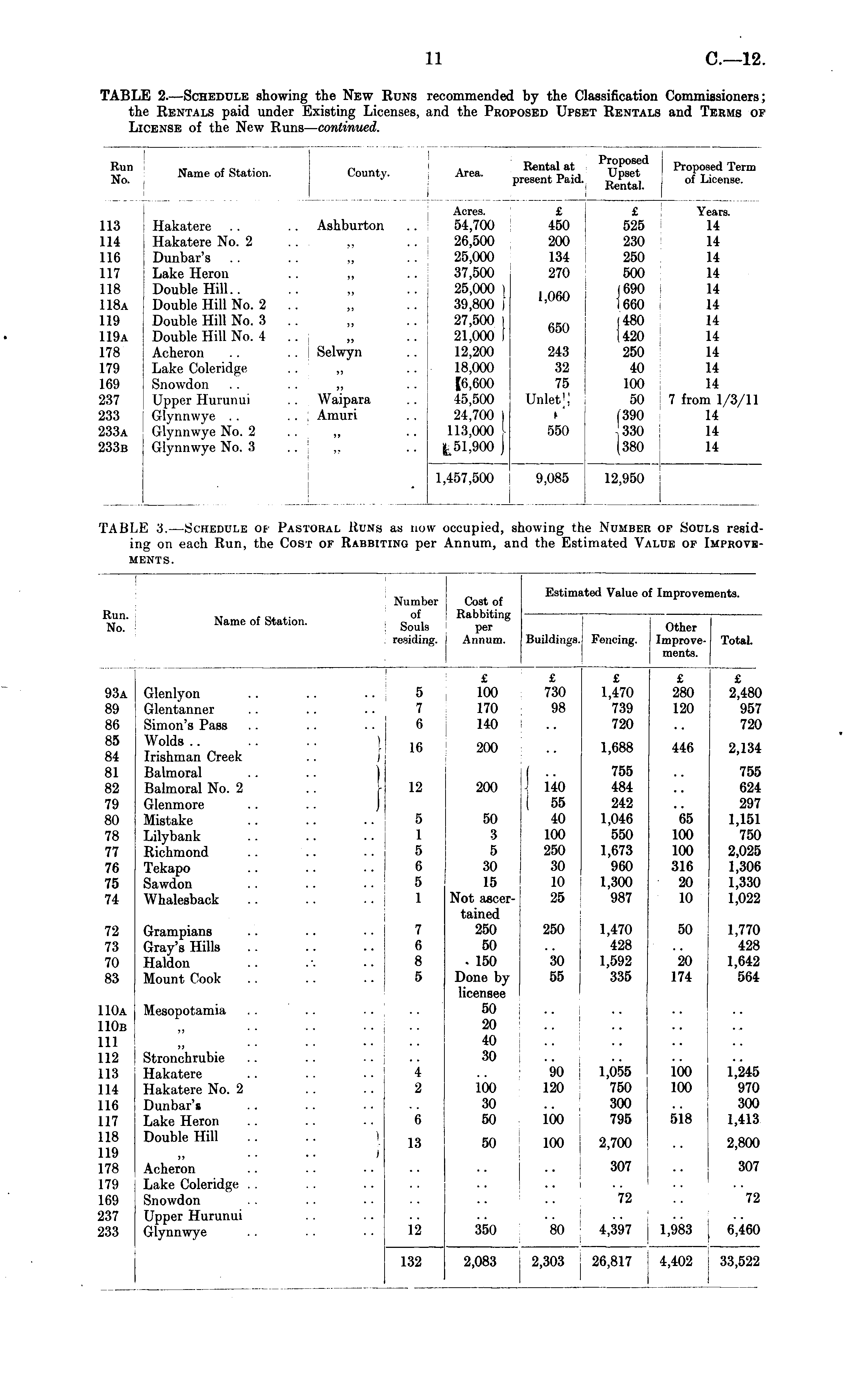TABLE 3. —Schedule of Pastoral Runs as now occupied, showing the Number of Souls residing on each Run, the Cost of Rabbiting per Annum, and the Estimated Value of Improvements.