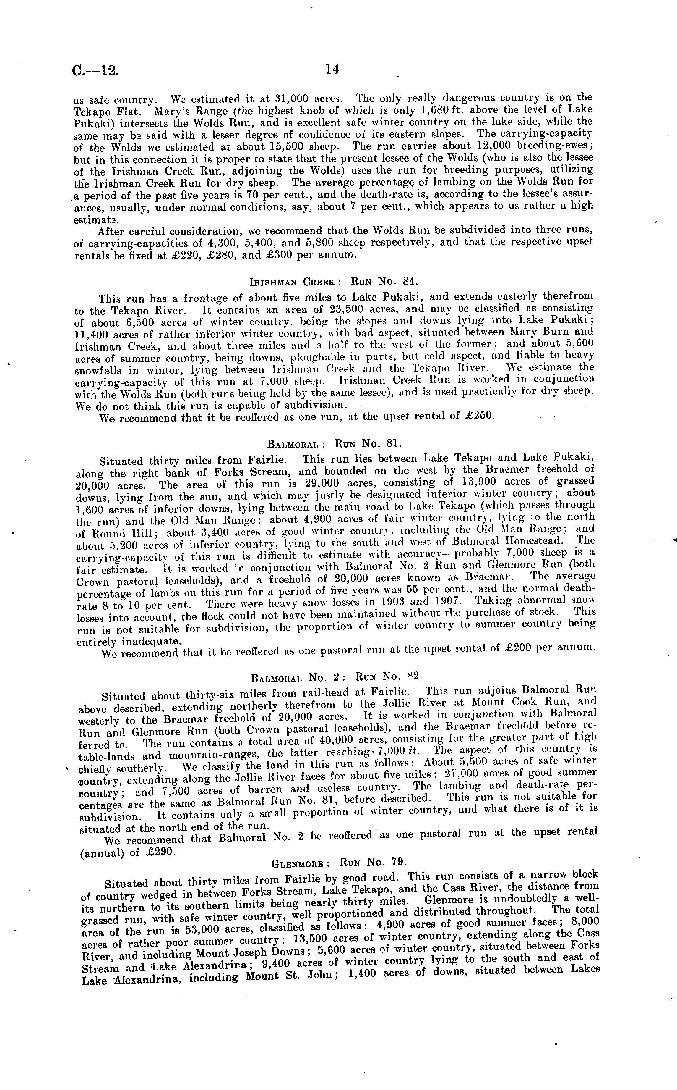 as safe country. We estimated it at 31,000 acres. The only really dangerous country is on the Tekapo Flat. "Mary's Range (the highest knob of which is only 1,680 ft. above the level of Lake Pukaki) intersects the Wolds Run, and is excellent safe winter country on the lake side, while the same may be said with a lesser degree of confidence of its eastern slopes. The carrying-capacity of the Wolds we estimated at about 15,500 sheep. The run carries about 12,000 breeding-ewes; but in this connection it is proper to state that the present lessee of the Wolds (who is also the lessee of the Irishman Creek Run, adjoining the Wolds) uses the run for breeding purposes, utilizing the Irishman Creek Run for dry sheep. The average percentage of lambing on the Wolds Run for a period of the past five years is 70 per cent., and the death-rate is, according to the lessee's assurances, usually, under normal conditions, say, about 7 per cent., which appears to us rather a high estimate. After careful consideration, we recommend that the Wolds Run be subdivided into three runs, of carrying-capacities of 4,300, 5,400, and 5,800 sheep respectively, and that the respective upset rentals be fixed at £220, £280, and £300 per annum. Irishman Creek : Run No. 84. This run has a frontage of about five miles to Lake Pukaki, and extends easterly therefrom to the Tekapo River. It contains an area of 23,500 acres, and may be classified as consisting of about 6,500 acres of winter country, being the slopes and downs lying into Lake Pukaki; 11,400 acres of rather inferior winter country, with bad aspect, situated between Mary Burn and Irishman Creek, and about three miles and "a half to the west of the former; and about 5,600 acres of summer country, being downs, ploughable in parts, but cold aspect, and liable to heavy snowfalls in winter, lying between Irishman Creek and the Tekapo River. We estimate the carrying-capacity of this run at 7,000 sheep. Irishman Creek Run is worked in conjunction with the Wolds Run (both runs being held by the same lessee), and is used practically for dry sheep. We do not think this run is capable of subdivision. We recommend that it be reoffered as one run, at the upset rental of £250. Balmoral: Run No. 81. Situated thirty miles from Fairlie. This run lies between Lake Tekapo and Lake Pukaki, along the right bank of Forks Stream, and bounded on the west by the Braemer freehold of 20 000 acres. The area of this run is 29,000 acres, consisting of 13,900 acres of grassed downs lying from the sun, and which may justly be designated inferior winter country; about 1 600 acres of inferior downs, lying between the main road to Lake Tekapo (which passes through the run) and the Old Man Range; about 4,900 acres of fair winter country, lying to the north of Round Hill: about 3,400 acres of good winter country, including the Old Man Range; and about 5 200 acres of inferior country, tying to the south and west of Balmoral Homestead. The carrying-capacity of this run is difficult to estimate with accuracy—probably 7,000 sheep is a fair estimate It is worked in conjunction with Balmoral No. 2 Run and Glenmore Run (both Crown pastoral leaseholds), and a freehold of 20,000 acres known as Braemar. lhe average percentage of lambs on this run for a period of five years was 55 per cent, and the normal deathrate Bto 10 per cent. There were heavy snow losses in 1903 and 190,. raking abnormal snow losses into account, the flock could not have been maintained without the purchase of stock. This run is not suitable for subdivision, the proportion of winter country to summer country being '"''we recmnmend'that it be reoffered as one pastoral run at the upset rental of £200 per annum. Balmoral No. 2: Run No. 82. Situated about thirty-six miles from rail-head at Fairlie. This run adjoins Balmoral Run above described, extending northerly therefrom to the Jollie River at Mount Cook Run and westerly to the Braemar freehold of 20,000 acres. It is worked ,n conjunction with Balmoral Run and Glenmore Run (both Crown pastoral leaseholds), and the Braemar freehold before, referred to The run contains a total area of 40,000 acres, consisting lor the greater part o high Ithte lands and mountain-ranges, the latter reaching* 7,000 ft. The aspect of this country is Sflv southeriv We classify the land in this run as follows: About 5,50.) acres of safe winter Bhiefl -ionttthe Jollie River faces for about five miles; 27,000 acres of good summer £un?v'- « 7 00 ate" of Lren and useless country. Tta lambing am, death-rat, pjrcentases' a 4 the same as Balmoral Run No. 81, before described. This run is not suitable for subdivision It contains only a small proportion of winter country, and what there is of it is BitU We d fecommetd\TaVßlo r r U al-No. 2 be reoffered as one pastoral run at the upset rental (annual) of £290. Glenmore : Run No. 79. o-. * a „v™„t tWtv miles from Fairlie by good road. This run consists of a narrow block Situated about thirty J ™™ Lake Tekapo, and the Cass River, the distance from of country wedged in thirty m les. Glenmore is undoubtedly a wellits northern to its sout^nj^jte ; ing th J and distributed througho ut. The total grassed run, follows : 4,900 acres of good summer faces; 8 000 area of the run is 53,000 acres, cuwrniea as , country, extending along the Cass acres of rather poor summer country 13,000 acreof £ . £ Forks River, and including Moun Jo,epi to' the south and east of S^ld'rfnltrdtrMoufsrroL 0 ; MOO acres o y f downs, situated between Lakes