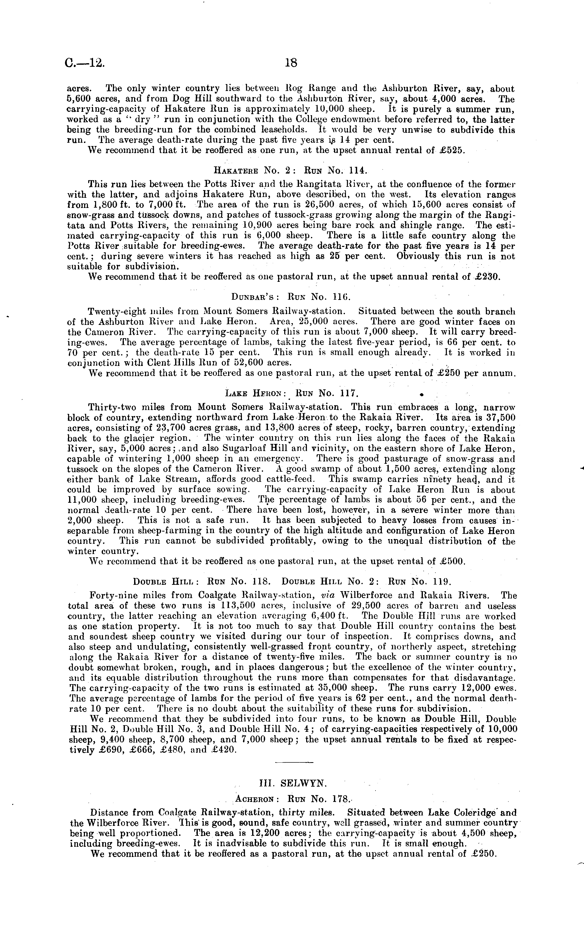 111. SELWYN. Acheron: Run No. 178. Distance from Coalgate Railway-station, thirty miles. Situated between Lake Coleridge and the Wilberforce River. This is good, sound, safe country, well grassed, winter and summer country being well proportioned. The area is 12.200 acres; the carrying-capacity is about 4,500 sheep, including breeding-ewes. It is inadvisable to subdivide this run. It is small enough. We recommend that it be reoffered as a pastoral run, at the upset annual rental of £250.