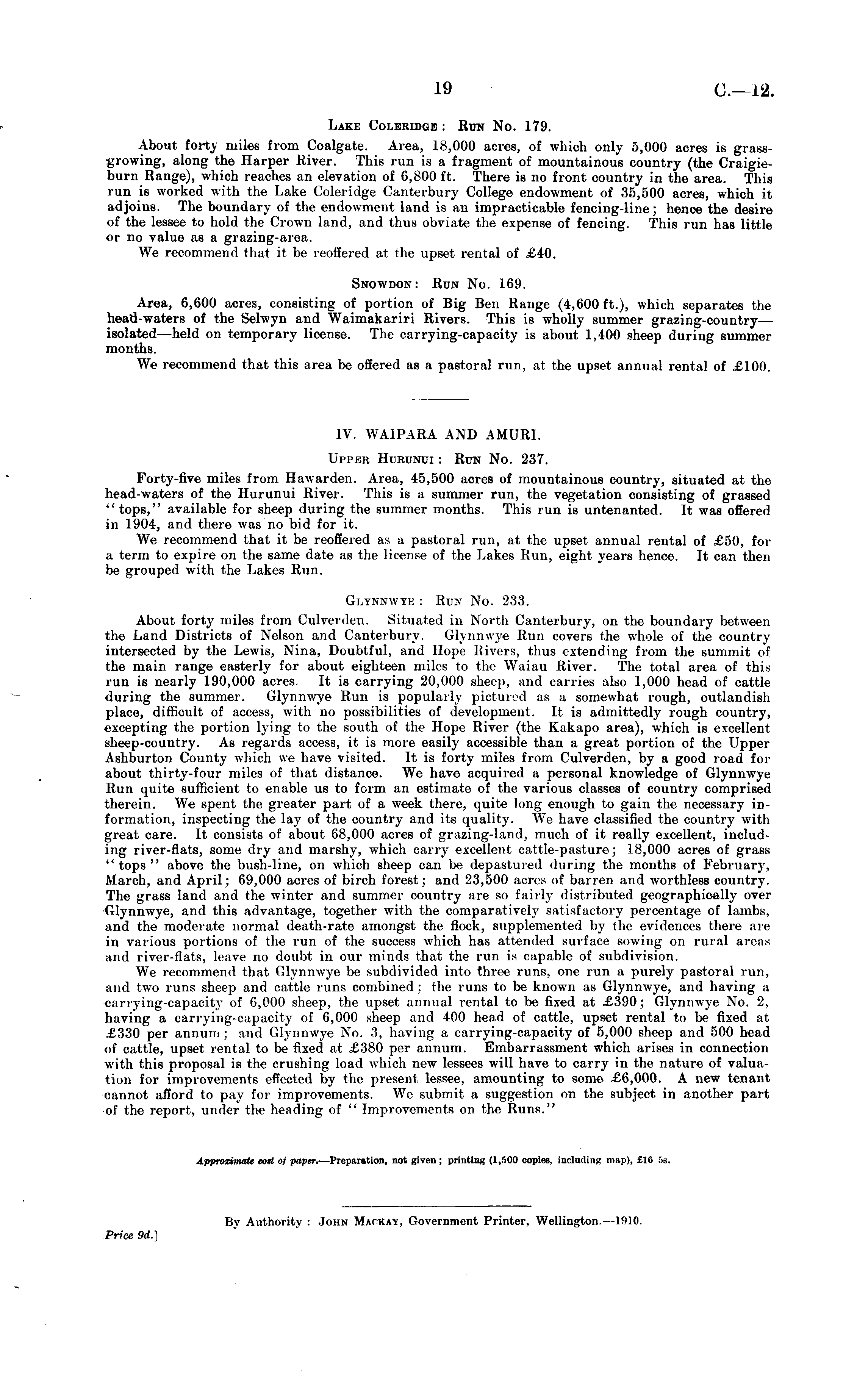 IV. WAIPARA AND AMURI. Upper Hurunui : Run No. 237. Forty-five miles from Hawarden. Area, 45,500 acres of mountainous country, situated at the head-waters of the Hurunui River. This is a summer run, the vegetation consisting of grassed "tops," available for sheep during the summer months. This run is untenanted. It was offered in 1904, and there was no bid for it. We recommend that it be reoffered as a pastoral run, at the upset annual rental of £50, for a term to expire on the same date as the license of the Lakes Run, eight years hence. It can then be grouped with the Lakes Run. Glynnwye : Run No. 233. About forty miles from Culver den. Situated in North Canterbury, on the boundary between the Land Districts of Nelson and Canterbury. Run covers the whole of the countryintersected by the Lewis, Nina, Doubtful, and Hope Rivers, thus extending from the summit of the main range easterly for about eighteen miles to the Waiau River. The total area of this run is nearly 190,000 acres. It is carrying 20,000 sheep, and carries also 1,000 head of cattle during the summer. Glynnwye Run is popularly pictured as a somewhat rough, outlandish place, difficult of access, with no possibilities of development. It is admittedly rough country, excepting the portion lying to the south of the Hope River (the Kakapo area), which is excellent sheep-country. As regards access, it is more easily accessible than a great portion of the Upper Ashburton County which we have visited. It is forty miles from Culverden, by a good road for about thirty-four miles of that distance. We have acquired a personal knowledge of Glynnwye Run quite sufficient to enable us to form an estimate of the various classes of country comprised therein. We spent the greater part of a week there, quite long enough to gain the necessary information, inspecting the lay of the country and its quality. We have classified the country with great care. It consists of about 68,000 acres of grazing-land, much of it really excellent, including river-flats, some dry and marshy, which carry excellent cattle-pasture; 18,000 acres of grass ''tops" above the bush-line, on which sheep can be depastured during the months of February, March, and April; 69,000 acres of birch forest; and 23,500 acres of barren and worthless country. The grass land and the winter and summer country are so fairly distributed geographically over Glynnwye, and this advantage, together with the comparative!}' satisfactory percentage of lambs, and the moderate normal death-rate amongst the flock, supplemented by (he evidences there are in various portions of the run of the success which has attended surface sowing on rural areas and river-flats, leave no doubt in our minds that the run is capable of subdivision. We recommend that Glynnwye be subdivided into three runs, one run a purely pastoral run, and two runs sheep and cattle runs combined : the runs to be known as Glynnwye, and having a carrying-capacity of 6,000 sheep, the upset annual rental to be fixed at £390; Glynnwye No. 2, having a carrying-capacity of 6,000 sheep and 400 head of cattle, upset rental to be fixed at £330 per annum; and Glynnwye No. 3, having a carrying-capacity of 5,000 sheep and 500 head of cattle, upset rental to be fixed at £380 per annum. Embarrassment which arises in connection with this proposal is the crushing load which new lessees will have to carry in the nature of valuation for improvements effected by the present lessee, amounting to some £6,000. A new tenant cannot afford to pay for improvements. We submit a suggestion on the subject in another part of the report, under the heading of " Improvements on the Runs."