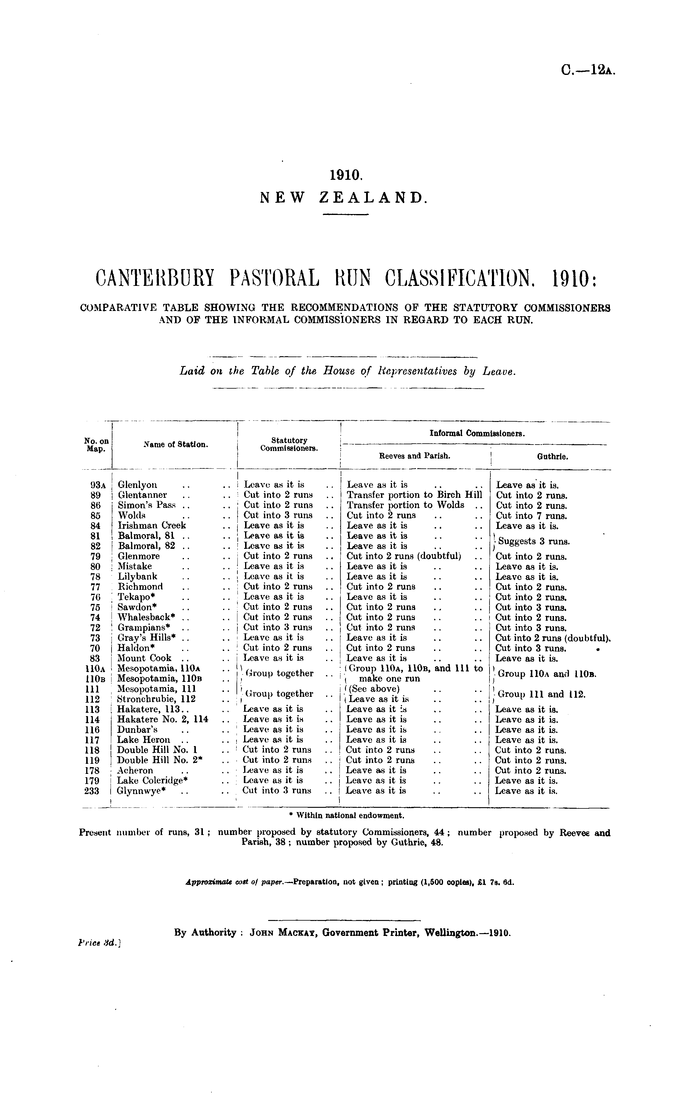 CANTERBURY PASTORAL RUN CLASSIFICATION, 1910: COMPARATIVE TABLE SHOWING THE RECOMMENDATIONS OF THE STATUTORY COMMISSIONERS AND OF THE INFORMAL COMMISSIONERS IN REGARD TO EACH RUN.