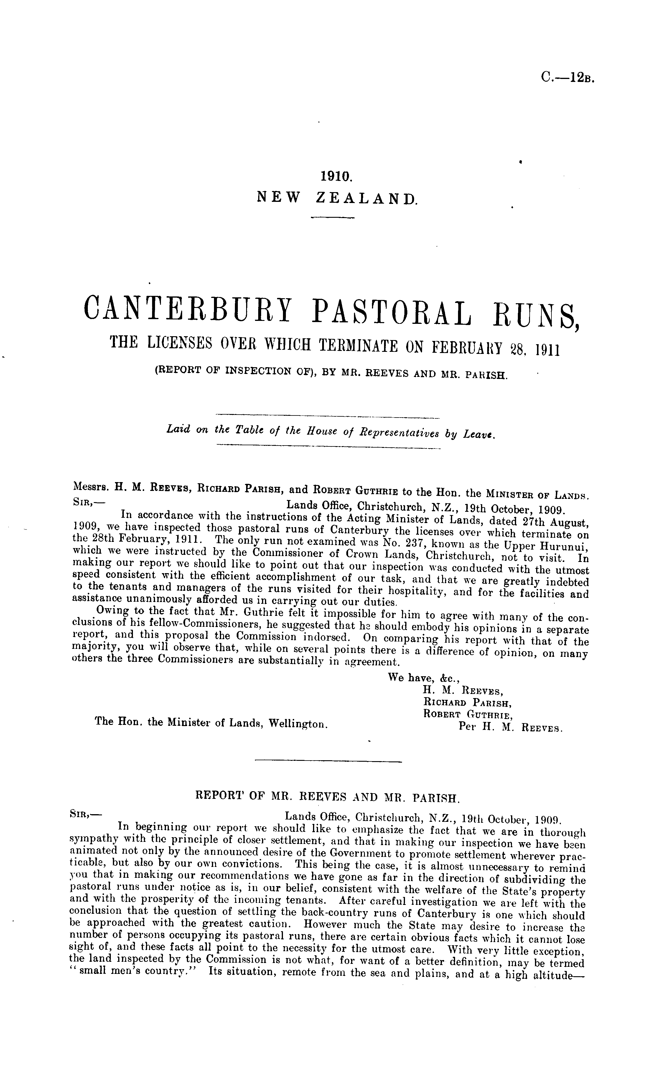 CANTERBURY PASTORAL RUNS, THE LICENSES OVER WHICH TERMINATE ON FEBRUARY 28, 1911 (REPORT OF INSPECTION OF), BY MR. REEVES AND MR. PARISH.
