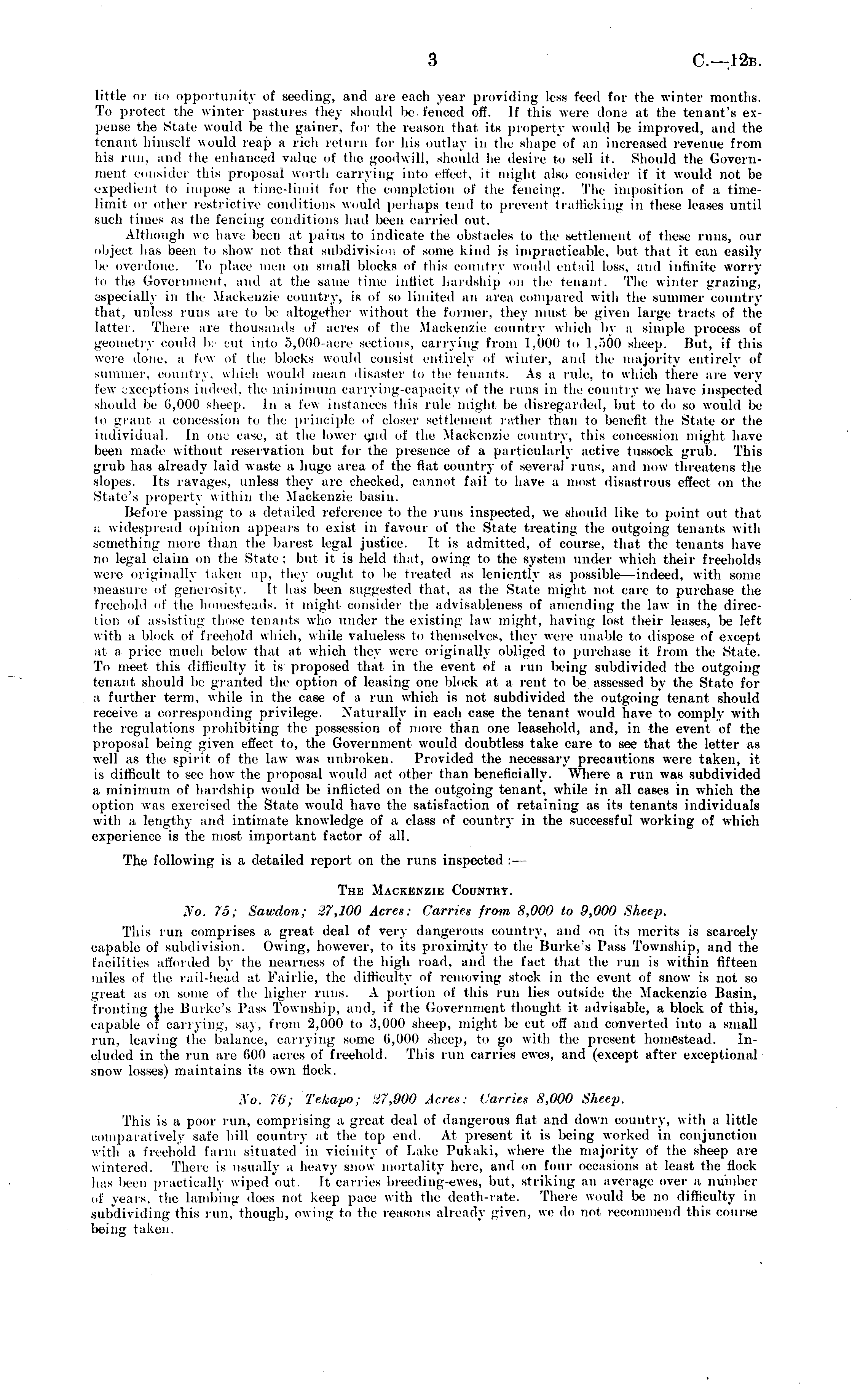 little or no opportunity of seeding, and are each year providing less feed for the winter months. To protect the winter pastures they should be. fenced off. If this were dona at the tenant's expense the State would be the gainer, for the reason that its property would be improved, and the tenant himself would reap a rich return for his outlay in the shape of an increased revenue from his run, and the enhanced value of the goodwill, should he desire to sell it. Should the Government consider this proposal worth carrying into effect, it might also consider if it would not be expedient to impose a time-limit for the completion of the fencing. The imposition of a timelimit or other restrictive conditions would perhaps tend to prevent trafficking in these leases until such times as the fencing conditions had been carried out. Although we have been at pains to indicate the obstacles to the settlement of these runs, our object has been to show nol that subdivision of some kind is impracticable, but that it can easily be overdone. To place men on small blocks of this country would entail loss, and infinite worry to tin- Government, and at the same time inflict hardship on the tenant. The winter grazing, ■specially in the Mackenzie country, is of so limited an area compared with the summer country that, unless runs are to be altogether without the former, they must be given large tracts of the latter. There are thousands of acres of the Mackenzie country which by a simple process of geometry could be cut into 5,000-acre sections, carrying from 1,000 to 1,500 sheep. But, if this were done, a few of the blocks would consist entirely of winter, and the majority entirely- of summer, country, which would mean disaster to the tenants. As a rule, to which there are very few exceptions indeed, the minimum carrying-capacity of the runs in the country xve have inspected should lie 0,000 sheep. In a few instances this rule might be disregarded, but to do so xvould be to grant a concession to the principle of closer settlement rather than to benefit the State or the individual. In one case, at the lower tmd of the Mackenzie country, this concession might have been made without reservation but for the presence of a particularly active tussock grub. This grub has already laid waste a huge area of the flat country of several runs, and now threatens the slopes. Its ravages, unless they are checked, cannot fail to have a most disastrous effect on the State's properly within the Mackenzie basin. Before passing to a detailed reference to the runs inspected, we should like to point out that a widespread opinion appears to exist in favour of the State treating the outgoing tenants xvith something more than the barest legal justice. It is admitted, of course, that the tenants have no legal claim on the State: but it is held that, owing to the system under xvhich their freeholds were originally taken up, they ought to be treated as leniently as possible—indeed, with some measure of generosity. It has been suggested that, as the State might not care to purchase the freehold of the homesteads, it might consider the advisableness of amending the law in the direction of assisting those tenants who under the existing law might, having lost their leases, be left with a block of freehold xvhich, while valueless to themselves, they were unable to dispose of except al a price much below that at which they were originally obliged to purchase it from the State. To meet this difficulty it is proposed that in the event of a run being subdivided the outgoing tenant should be granted the option of leasing one block at a rent to be assessed by the State for a further term, while in the case of a run which is not subdivided the outgoing tenant should receive a corresponding privilege. Naturally in each case the tenant xvould have to comply xvith the regulations prohibiting the possession of more than one leasehold, and, in the event of the proposal being given effect to, the Government would doubtless take care to see that the letter as well as the spirit of the law was unbroken. Provided the necessary precautions were taken, it is difficult to see hoxv the proposal xxould act other than beneficially. Where a run xvas subdivided a minimum of hardship xvould be inflicted on the outgoing tenant, while in all cases in xvhich the option was exercised the State would have the satisfaction of retaining as its tenants individuals xvith a lengthy and intimate knoxvledge of a class of country in the successful working of xvhich experience is the most important factor of all. The following is a detailed report on the runs inspected : — The Mackenzie Country. No. 75; Sawdon; 27,100 Acres: Carries from 8,000 to 9,000 Sheep. This run comprises a great deal of very dangerous country, and on its merits is scarcely capable of subdivision. Owing, however, to its proximity to the Burkes Pass Township, and the facilities afforded by the nearness of the high road, and the fact that the run is within fifteen miles of the rail-head at Fairlie, the difficulty of removing stock in the event of snow is not so great as mi some of the higher runs. A portion of this run lies outside the Mackenzie Basin, fronting the Burkes Pass Township, and, if the Government thought it advisable, a block of this, capable of oarrying, say. from 2,000 to 3,000 sheep, might be cut off and converted into a small run, leaving the balance, carrying some 6,000 sheep, to go with the present homestead. Included in the run are 600 acres of freehold. This run carries exves, and (except after exceptional snow losses) maintains its own flock. No. i(>; Tekapo; 27,900 Acres: Carries 8,000 Sheep. This is a poor run, comprising a great deal of dangerous flat and doxvn country, with a little comparatively safe hill country at the top end. At present it is being xvorked in conjunction with a freehold farm situated in vicinity of bake Pukaki, where the majority of the sheep are wintered. The