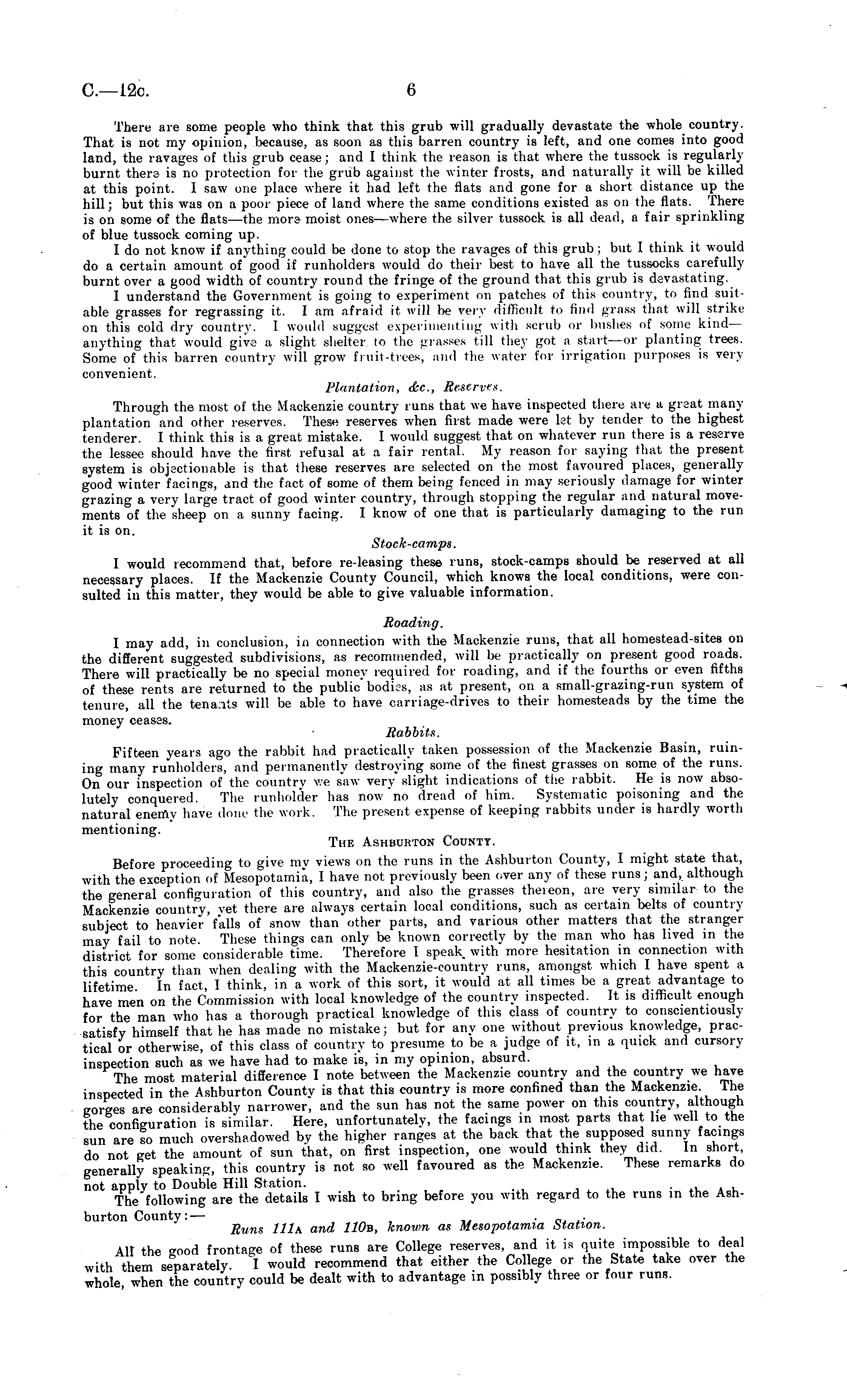 There are some people who think that this grub will gradually devastate the whole country. That is not my opinion, because, as soon as this barren country is left, and one comes into good land, the ravages of this grub cease; and I think the reason is that where the tussock is regularly burnt thers is no protection for the grub against the winter frosts, and naturally it will be killed at this point. 1 saw one place where it had left the fiats and gone for a short distance up the hill; but this was on a poor piece of land where the same conditions existed as on the flats. There is on some of the flats —the mors moist ones—where the silver tussock is all dead, a fair sprinkling of blue tussock coming up. Ido not know if anything could be done to stop the ravages of this grub; but I think it would do a certain amount of good if runholders would do their best to have all the tussocks carefully burnt over a good width of country round the fringe of the ground that this grub is devastating. I understand the Government is going to experiment on patches of this country, to find suitable grasses for regrassing it. I am afraid it will bo very difficult to find thai will strike on this cold dry country. I would suggest experimenting with scrub or bushes of some kind — anything that would give a slight shelter to the grasses till they got a start—or planting trees. Some of this barren country will grow fruit-trees, and the water for irrigation purposes is very convenient. Plantation, &c, Reserves. Through the most of the Mackenzie country runs that we have inspected there are a great many plantation and other reserves. These reserves when first made were let by tender to the highest tenderer. I think this is a great mistake. I would suggest that on whatever run there is a reserve the lessee should have the first refusal at a fair rental. My reason for saying that the present system is objectionable is that these reserves are selected on the most favoured places, generally good winter facings, and the fact of some of them being fenced in may seriously damage for winter grazing a very large tract of good winter country, through stopping the regular and natural movements of the sheep on a sunny facing. I know of one that is particularly damaging to the run it is on. Stock-camps. I would recommend that, before re-leasing these runs, stock-camps should be reserved at all necessary places. If the Mackenzie County Council, which knows the local conditions, were consulted in this matter, they would be able to give valuable information. Roading. I may add, in conclusion, in connection with the Mackenzie runs, that all homestead-sites on the different suggested subdivisions, as recommended, will be practically on present good roads. There will practically be no special money required for loading, and if the fourths or even fifths of these rents are returned to the public' bodus, as at present, on a small-grazing-run system of tenure, all the tenants will be able to have carriage-drives to their homesteads by the time the money ceases. Rabbits. Fifteen years ago the rabbit had practically taken possession of the Mackenzie Basin, ruining many runholders, and permanently destroying some of the finest grasses on some of the runs. On our inspection of the country we saw very slight indications of the rabbit. He is now absolutely conquered. The runholder has now no dread of him. Systematic poisoning and the natural enemy have done the work. The present expense of keeping rabbits under is hardly worth mentioning. The Ashburton County. Before proceeding to give my views on the runs in the Ashburton County, I might state that, with the exception of Mesopotamia, I have not previously been over any of these runs; and, although the general configuration of this country, and also the grasses thereon, are very similar- to the Mackenzie country, yet there are always certain local conditions, such as certain belts of country subject to heavier falls of snow than" other parts, and various other matters that the stranger may fail to note. These things can only be known correctly by the man who has lived in the district for some considerable time. Therefore I speak with more hesitation in connection with this country than when dealing with the Mackenzie-country runs, amongst which I have spent a lifetime In fact, I think, in a work of this sort, it would at all times be a great advantage to have men on the Commission with local knowledge of the country inspected. It is difficult enough for the man who has a thorough practical knowledge of this class of country to conscientiously satisfy himself that he has made no mistake; but for any one without previous knowledge, practical or otherwise, of this class of country to presume to be a judge of it, in a quick and cursory inspection such as we have had to make is, in my opinion, absurd. The most material difference I note between the Mackenzie country and the country we have inspected in the Ashburton County is that this country is more confined than the Mackenzie The eorees are considerably narrower, and the sun has not the same power on this country, although the configuration is similar. Here, unfortunately, the facings in most parts that lie well to the sun are to much overshadowed by the higher ranges at the back that the supposed sunny facings do not get the amount of sun that, on first inspection, one would think they did. In short, generally speaking, this country is not so well favoured as the Mackenzie. These remarks do not apply to Double Hill Station. . The" following are the details I wish to bring before you with regard to the runs in the Ashburton County:— . . Runs 111 a and 110b, known as Mesopotamia Station. All the good frontage of these runs are College reserves and it is quite impossible to deal with them separately. I would recommend that either the College or the State take over the whole, when the country could be dealt with to advantage in possibl
