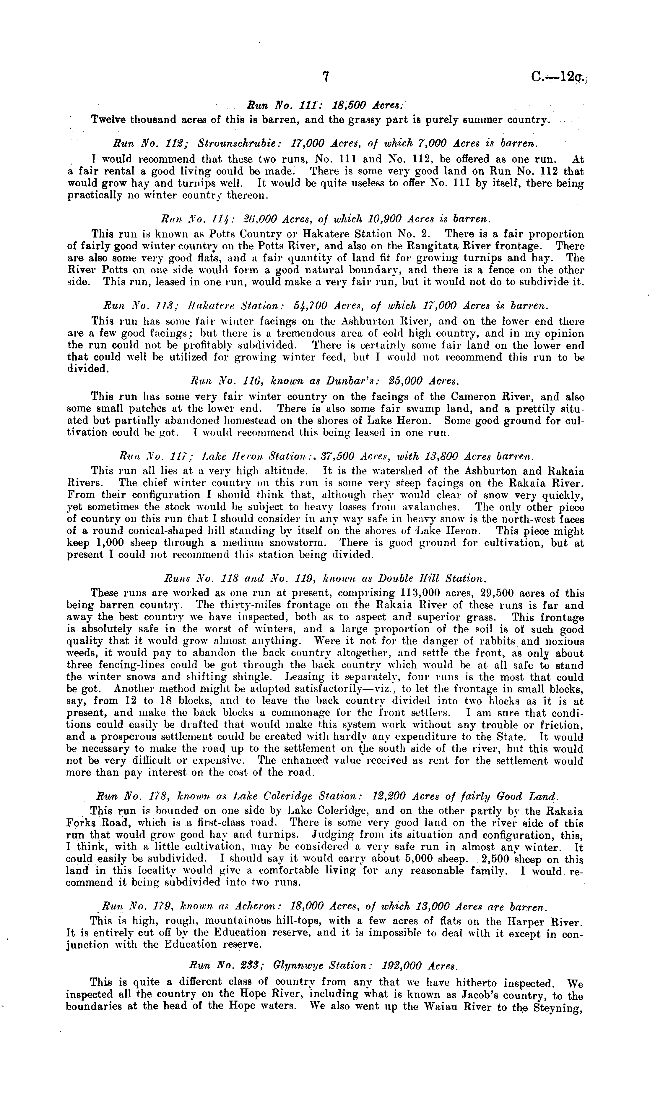 Run No. Ill: 18,500 Acres. Twelve thousand acres of this is barren, and the grassy part is purely summer country. Run No. 112; Strounschrubie: 17,000 Acres, of which 7,000 Acres is barren. I would recommend that these two runs, No. 11l and No. 112, be offered as one run. At a fair rental a good living could be made. There is some very good land on Run No. 112 that would grow hay and turnips well. It would be quite useless to offer No. 11l by itself, there being practically no winter country thereon. If mi No. II): Hi,ooo Acres, of which 10,900 Acres is barren. This run is known as l\>tts Country or Hakatere Station No. 2. There is a fair proportion of fairly good winter country on the Potts River, and also on the Rangitata River frontage. There are also sonic very g I Hats, and a fair quantity of land lit for growing turnips and hay. The River Potts on one side would form a good natural boundary, and there is a fence on the other side. This run, leased in one run, would make a very fair run, but it would not do to subdivide it. Run No. //-I: Hakatere Slat ion: Acres, of which 17,000 Acres is barren. This run has some fair winter lacings on tin , Ashburton River, and on the lower end there are a few good facings; but there is a tremendous area of cold high country, and in my opinion the run could not be profitably subdivided. There is certainly some fair land on the lower end that could well Ik: utilized for growing winter feed, but I would not recommend this run to be divided. Him Xo. 116, known as Dunbar's: 25,000 Acres. This run has some very fair winter country on the facings of the Cameron River, and also some small patches at the lower end. There is also some fair swamp land, and a prettily situated but partially abandoned homestead on the shores of Lake Heron. Some good ground for cultivation could lie got. 1 would recommend this being leased in one run. Rim Xo. 11l ; Lake Heron Station:. 37,500 Acre,*, with 13,800 Acres barren. This run all lies at a very high altitude. It is the watershed of the Ashburton and Rakaia Rivers. The chief winter country on this run is some very steep facings on the Rakaia River. From their configuration I should think that, although they would clear of snow very quickly, yet sometimes the stuck would be subject to heavy losses from avalanches. The only other piece of country on this run that I should consider in any way safe in heavy snow is the north-west faces of a round conical-shaped hill standing by itself on the shores of Lake Heron. This piece might keep 1,000 sheep through a medium snowstorm. There is good ground for cultivation, but at present I could not recommend this station being divided. Runs Xi>. IIS and Xo. 119, known an Double Hill Station. These runs are worked as one run at present, comprising 113,000 acres, 29,500 acres of this being barren country. The thirty-miles frontage on the Rakaia River of these runs is far and away the best country we have inspected, both as to aspect and superior grass. This frontage is absolutely safe in the worst of winters, and a large proportion of the soil is of such good quality that it would grow almost anything. Were it not for the danger of rabbits and noxious weeds, it would pay to abandon the back country altogether, and settle the front, as only about three fencing-lines could l>e got through the back country which would be at all safe to stand the winter snows and shifting shingle. Leasing it separately, four runs is the most that could be got. Another method might be adopted satisfactorily—viz., to let the frontage in small blocks, say, from 12 to 18 blocks, and to leave the back country divided into two blocks as it is at present, and make the back blocks a commonage for the front settlers. lam sure that conditions could easily be drafted that would make this system work without any trouble or friction, and a prosperous settlement could be created with hardly any expenditure to the State. It would be necessary to make the road, up to the settlement on the south side of the river, but this would not be very difficult or expensive. The enhanced value received as rent for the settlement would more than pay interest on the cost of the road. Run No. 178, known at Lake Coleridge Station: 12,200 Acres of fairly Good Land. This run is bounded on one side by Lake Coleridge, and on the other partly by the Rakaia Forks Road, which is a first-class road. There is some very good land on the river side of this run that would grow good hay and turnips. Judging from its situation and configuration, this, I think, with a little cultivation, may lie considered a very safe run in almost any winter. It could easily be subdivided. I should say it would carry about 5,000 sheep. 2,500 sheep on this land in this locality would give a comfortable living for any reasonable family. I would recommend it being subdivided into two runs. Run Xo. 179, known as Acheron: 18,000 Acres, of which 13,000 Acres are barren. This is high, rough, mountainous hill-tops, with a few acres of flats on the Harper River. It is entirely cut off by the Education reserve, nnd it is impossible to deal with it except in conjunction with the Education reserve. Run No. 233; Glynnwye Station: 192,000 Acres. This is quite a different class of country from any that we have hitherto inspected. We inspected all the country on the Hope River, including what is known as Jacob's country, to the boundaries at the head of the Hope waters. We also went up the Waiau River to the Steyning,