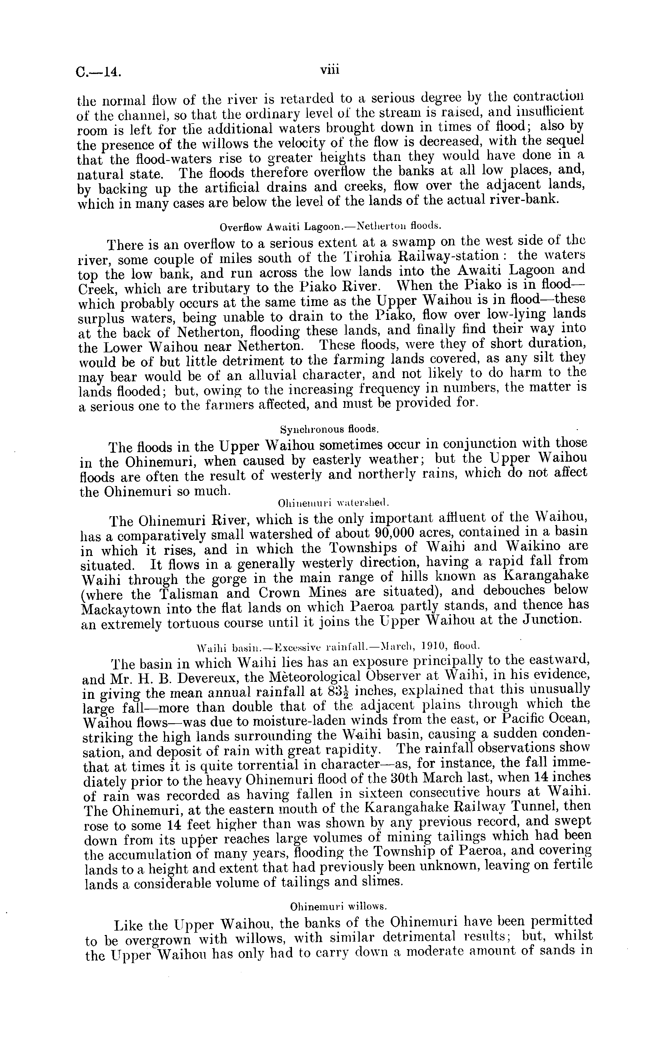 the normal flow of the river is retarded to a serious degree by the contraction of the channel, so that the ordinary level of the stream is raised, and insufficient room is left for the additional waters brought down in times of flood; also by the presence of the willows the velocity of the flow is decreased, with the sequel that the flood-waters rise to greater heights than they would have done in a natural state. The floods therefore overflow the banks at all low places, and, by backing up the artificial drains and creeks, flow over the adjacent lands, which in many cases are below the level of the lands of the actual river-bank. Overflow Awaiti Lagoon. —Netherton floods. There is an overflow to a serious extent at a swamp on the west side of the river, some couple of miles south of the Tirohia Railway-station : the waters top the low bank, and run across the low lands into the Awaiti Lagoon and Creek, which are tributary to the Piako River. When the Piako is in floodwhich probably occurs at the same time as the Upper Waihou is in flood—these surplus waters, being unable to drain to the Piako, flow over low-lying lands at the back of Netherton, flooding these lands, and finally find their way into the Lower Waihou near Netherton. These floods, were they of short duration, would be of but little detriment to the farming lands covered, as any silt they may bear would be of an alluvial character, and not likely to do harm to the lands flooded; but, owing to the increasing frequency in numbers, the matter is a serious one to the farmers affected, and must be provided for. Synchronous floods. The floods in the Upper Waihou sometimes occur in conjunction with those in the Ohinemuri, when caused by easterly weather; but the Upper Waihou floods are often the result of westerly and northerly rains, which do not affect the Ohinemuri so much. Ohinemuri watershed. The Ohinemuri River, which is the only important affluent of the Waihou, has a comparatively small watershed of about 90,000 acres, contained in a basin in which it rises, and in which the Townships of Waihi and Waikmo are situated. It flows in a generally westerly direction, having a rapid fall from Waihi through the gorge in the main range of hills known as Karangahake (where the Talisman and Crown Mines are situated), and debouches below Mackaytown into the flat lands on which Paeroa partly stands, and thence has an extremely tortuous course until it joins the Upper Waihou at the Junction. Waihi basin.—Excessive rainfall.—March, 1910, flood, The basin in which Waihi lies has an exposure principally to the eastward, and Mr. H. B. Devereux, the Meteorological Observer at Waihi, in his evidence, in giving the mean annual rainfall at 83* inches, explained that this unusually large fall—more than double that of the adjacent plains through which the Waihou flows—was due to moisture-laden winds from the east, or Pacific Ocean, striking the high lands surrounding the Waihi basin, causing a sudden condensation, and deposit of rain with great rapidity. The rainfall observations show that at times it is quite torrential in character—as, for instance, the fall immediately prior to the heavy Ohinemuri flood of the 30th March last, when 14 inches of rain was recorded as having fallen in sixteen consecutive hours at Waihi. The Ohinemuri, at the eastern mouth of the Karangahake Railway Tunnel, then rose to some 14 feet higher than was shown by any previous record, and swept down from its upper reaches large volumes of mining tailings which had been the accumulation of many years, flooding the Township of Paeroa, and covering lands to a height and extent that had previously been unknown, leaving on fertile lands a considerable volume of tailings and slimes. Ohinemuri willows. Like the Upper Waihou, the banks of the Ohinemuri have been permitted to be overo-rown with willows, with similar detrimental results; but, whilst the Upper Waihou has only had to carry down a moderate amount of sands in