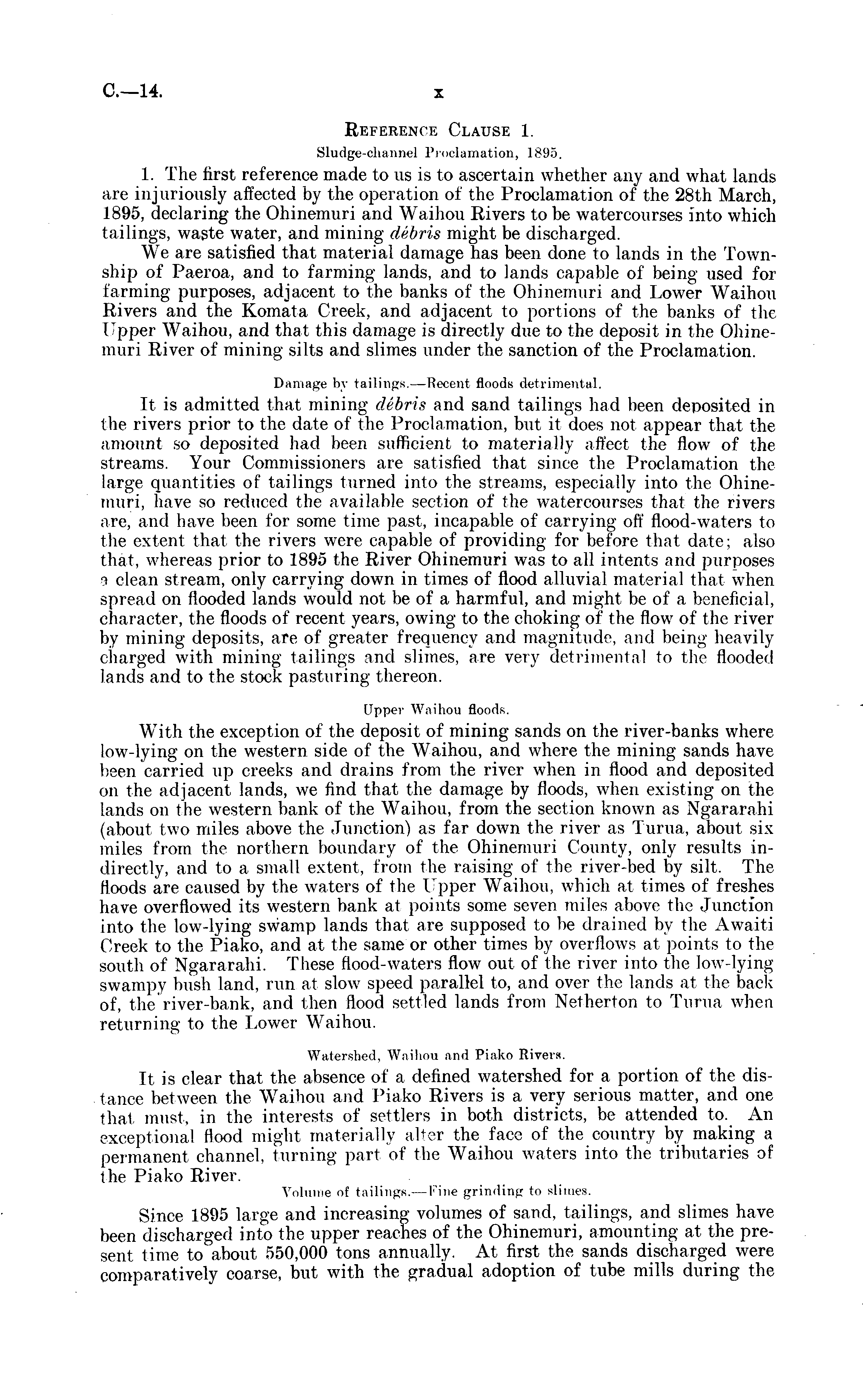 Reference Clause 1. Sludge-channel Proclamation, 1895. 1. The first reference made to us is to ascertain whether any and what lands are injuriously affected by the operation of the Proclamation of the 28th March, 1895, declaring the Ohinemuri and Waihou Rivers to be watercourses into which tailings, waste water, and mining debris might be discharged. We are satisfied that material damage has been done to lands in the Township of Paeroa, and to farming lands, and to lands capable of being used for farming purposes, adjacent to the banks of the Ohinemuri and Lower Waihou Rivers and the Komata Creek, and adjacent to portions of the banks of the Upper Waihou, and that this damage is directly due to the deposit in the Ohinemuri River of mining silts and slimes under the sanction of the Proclamation. Damage by tailings. -Recent floods detrimental. It is admitted that mining debris and sand tailings had been deposited in the rivers prior to the date of the Proclamation, but it does not appear that the amount so deposited had been sufficient to materially affect the flow of the streams. Your Commissioners are satisfied that since the Proclamation the large quantities of tailings turned into the streams, especially into the Ohinemuri, have so reduced the available section of the watercourses that the rivers are, and have been for some time past, incapable of carrying off flood-waters to the extent that the rivers were capable of providing for before that date; also that, whereas prior to 1895 the River Ohinemuri was to all intents and purposes a clean stream, only carrying down in times of flood alluvial material that when spread on flooded lands w r ould not be of a harmful, and might be of a beneficial, character, the floods of recent years, owing to the choking of the flow of the river by mining deposits, are of greater frequency and magnitude, and being heavily charged with mining tailings and slimes, are very detrimental to the flooded lands and to the stock pasturing thereon. Upper Waihou floods. With the exception of the deposit of mining sands on the river-banks wdiere low-lying on the western side of the Waihou, and wdiere the mining sands have been carried up creeks and drains from the river when in flood and deposited on the adjacent lands, we find that the damage by floods, when existing on the lands on the western bank of the Waihou, from the section known as Ngararahi (about two miles above the Junction) as far down the river as Turua, about six miles from the northern boundary of the Ohinemuri County, only results indirectly, and to a small extent, from the raising of the river-bed by silt. The floods are caused by the waters of the Upper Waihou, which at times of freshes have overflowed its western bank at points some seven miles above the Junction into the low-lying swamp lands that are supposed to be drained by the Awaiti Creek to the Piako, and at the same or other times by overflows at points to the south of Ngararahi. These flood-waters flow out of the river into the low-lying swampy bush land, run at slow speed parallel to, and over the lands at the back of, the river-bank, and then flood settled lands from Netherton to Turua when returning to the Lower Waihou. Watershed, Waihou and Piako Rivers. It is clear that the absence of a defined watershed for a portion of the distance between the Waihou and Piako Rivers is a very serious matter, and one thai must, in the interests of settlers in both districts, be attended to. An exceptional flood might materially alter the face of the country by making a permanent channel, turning part of the Waihou waters into the tributaries of the Piako River. Volume of tailings.— Fine grinding to slimes. Since 1895 large and increasing volumes of sand, tailings, and slimes have been discharged into the upper reaches of the Ohinemuri, amounting at the present time to about 550,000 tons annually. At first the sands discharged were comparatively coarse, but with the gradual adoption of tube mills during the