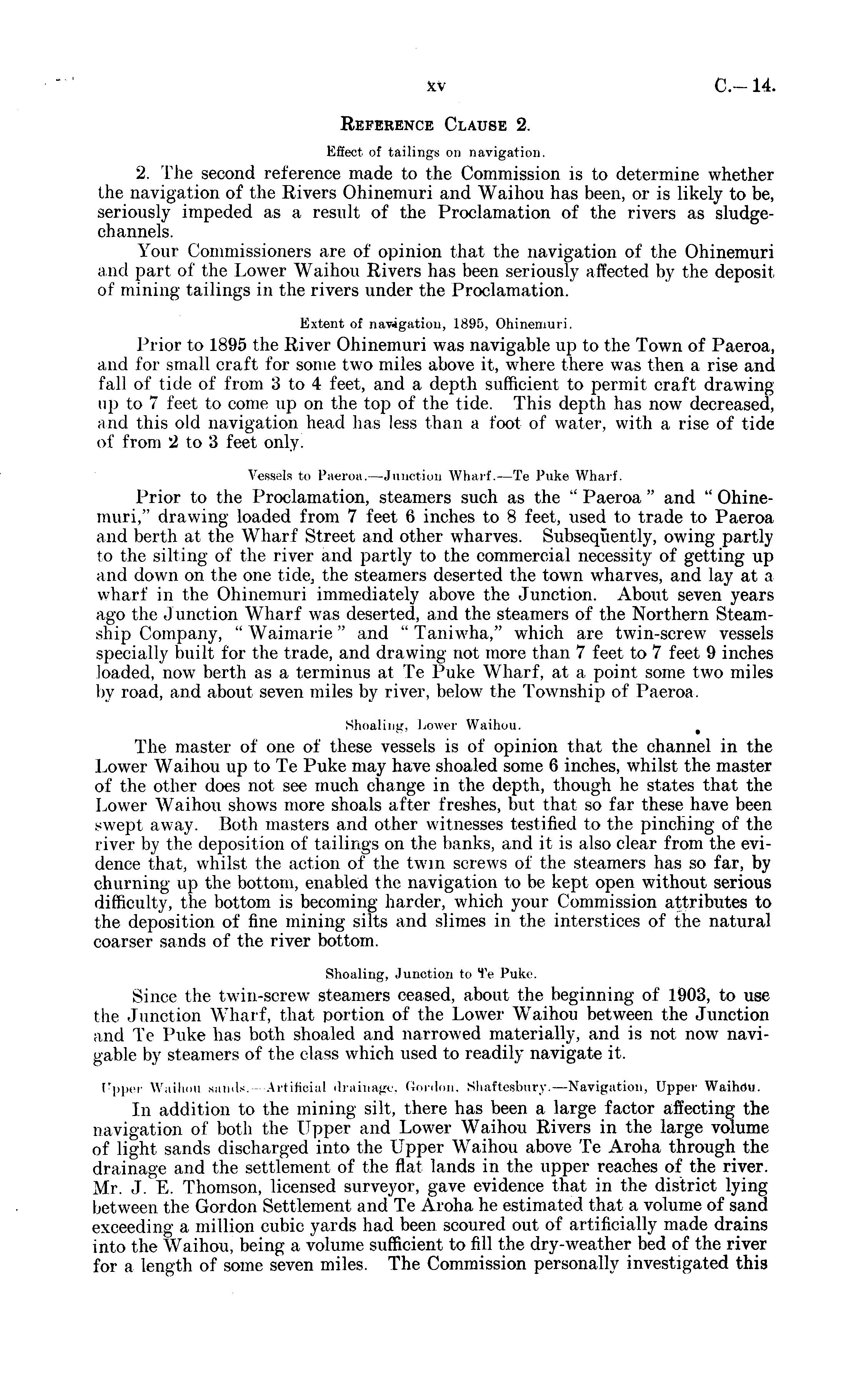 Reference Clause 2. Effect of tailings on navigation. 2. The second reference made to the Commission is to determine whether the navigation of the Rivers Ohinemuri and Waihou has been, or is likely to be, seriously impeded as a result of the Proclamation of the rivers as sludgechannels. Your Commissioners are of opinion that the navigation of the Ohinemuri and part of the Lower Waihou Rivers has been seriously affected by the deposit of mining tailings in the rivers under the Proclamation. Extent of navigation, 1895, Ohinemuri. Prior to 1895 the River Ohinemuri was navigable up to the Town of Paeroa, and for small craft for some two miles above it, w-here there was then a rise and fall of tide of from 3 to 4 feet, and a depth sufficient to permit craft drawing up to 7 feet to come up on the top of the tide. This depth has now decreased, and this old navigation head has less than a foot of water, with a rise of tide of from 2 to 3 feet only. Vess.'ls to Paeroa.—Junction Wharf.—Te Puke Wharf. Prior to the Proclamation, steamers such as the " Paeroa " and " Ohinemuri," drawing loaded from 7 feet 6 inches to 8 feet, used to trade to Paeroa and berth at the Wharf Street and other wharves. Subsequently, owing partly to the silting of the river and partly to the commercial necessity of getting up and down on the one tide, the steamers deserted the town wharves, and lay at a wharf in the Ohinemuri immediately above the Junction. About seven years ago the Junction Wharf was deserted, and the steamers of the Northern Steamship Company, " Waimarie" and " Taniwha," which are twin-screw vessels specially built for the trade, and drawing not more than 7 feet to 7 feet 9 inches loaded, now berth as a terminus at Te Puke Wharf, at a point some two miles by road, and about seven miles by river, below the Township of Paeroa. Shoaling, Lower Waihou. The master of one of these vessels is of opinion that the channel in the Lower Waihou up to Te Puke may have shoaled some 6 inches, whilst the master of the other does not see much change in the depth, though he states that the Lower Waihou shows more shoals after freshes, but that so far these have been swept away. Both masters and other witnesses testified to the pinching of the river by the deposition of tailings on the banks, and it is also clear from the evidence that, whilst the action of the twin screws of the steamers has so far, by churning up the bottom, enabled the navigation to be kept open without serious difficulty, the bottom is becoming harder, which your Commission attributes to the deposition of fine mining silts and slimes in the interstices of the natural coarser sands of the river bottom. Shoaling, Junction to Te Puke. Since the twin-screw steamers ceased, about the beginning of 1903, to use the Junction Wharf, that portion of the Lower Waihou between the Junction and Te Puke has both shoaled and narrowed materially, and is not now navigable by steamers of the class which used to readily navigate it. Upper Waihou sands. Artificial drainage, Gordon, Shaftesbury.—Navigation, Upper Waihou. In addition to the mining silt, there has been a large factor affecting the navigation of both the Upper and Lower Waihou Rivers in the large volume of light sands discharged into the Upper Waihou above Te Aroha through the drainage and the settlement of the flat lands in the upper reaches of the river. Mr. J. E. Thomson, licensed surveyor, gave evidence that in the district lying between the Gordon Settlement and Te Aroha he estimated that a volume of sand exceeding a million cubic yards had been scoured out of artificially made drains into the Waihou, being a volume sufficient to fill the dry-weather bed of the river for a length of some seven miles. The Commission personally investigated this