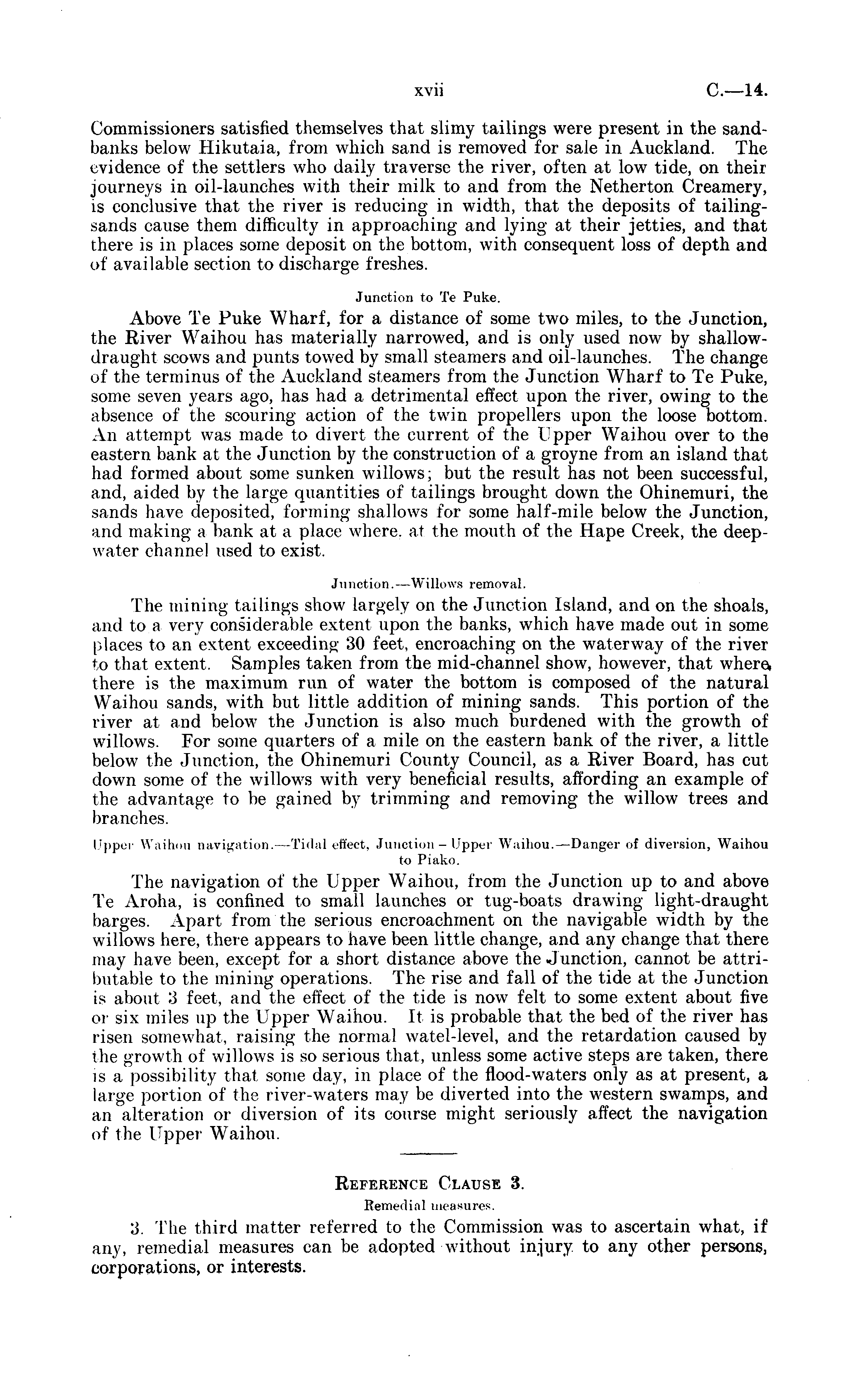 Commissioners satisfied themselves that slimy tailings were present in the sandbanks below Hikutaia, from which sand is removed for sale in Auckland. The evidence of the settlers wdio daily traverse the river, often at low tide, on their journeys in oil-launches with their milk to and from the Netherton Creamery, is conclusive that the river is reducing in width, that the deposits of tailingsands cause them difficulty in approaching and lying at their jetties, and that there is in places some deposit on the bottom, with consequent loss of depth and of available section to discharge freshes. Junction to Te Puke. Above Te Puke Wharf, for a distance of some two miles, to the Junction, the River Waihou has materially narrowed, and is only used now by shallowdraught scows and punts towed by small steamers and oil-launches. The change of the terminus of the Auckland steamers from the Junction Wharf to Te Puke, some seven years ago, has had a detrimental effect upon the river, owing to the absence of the scouring action of the twin propellers upon the loose bottom. An attempt was made to divert the current of the Upper Waihou over to the eastern bank at the Junction by the construction of a groyne from an island that had formed about some sunken willows; but the result has not been successful, and, aided by the large quantities of tailings brought down the Ohinemuri, the sands have deposited, forming shallows for some half-mile below the Junction, and making a bank at a place wdiere. at the mouth of the Hape Creek, the deepwater channel used to exist. Junction.—Willows removal. The mining tailings show largely on the Junction Island, and on the shoals, and to a very considerable extent upon the banks, which have made out in some places to an extent exceeding 30 feet, encroaching on the waterway of the river to that extent. Samples taken from the mid-channel show, however, that where there is the maximum run of water the bottom is composed of the natural Waihou sands, with but little addition of mining sands. This portion of the river at and below the Junction is also much burdened with the growth of willows. For some quarters of a mile on the eastern bank of the river, a little below the Junction, the Ohinemuri County Council, as a River Board, has cut down some of the willows with very beneficial results, affording an example of the advantage to be gained by trimming and removing the willow trees and branches. Upper Waihou navigation.—Tidal effect, Junction - Upper Waihou.—Danger of diversion, Waihou to Piako. The navigation of the Upper Waihou, from the Junction up to and above Te Aroha, is confined to small launches or tug-boats drawing light-draught barges. Apart from the serious encroachment on the navigable width by the wdllows here, there appears to have been little change, and any change that there may have been, except for a short distance above the Junction, cannot be attributable to the mining operations. The rise and fall of the tide at the Junction is about 3 feet, and the effect of the tide is now felt to some extent about five or six miles up the Upper Waihou. It is probable that the bed of the river has risen somewhat, raising the normal watel-level, and the retardation caused by the growth of willows is so serious that, unless some active steps are taken, there is a possibility that some day, in place of the flood-waters only as at present, a large portion of the river-waters may be diverted into the western swamps, and an alteration or diversion of its course might seriously affect the navigation of the Upper Waihou. Reference Clause 3. Remedial measures. 3. The third matter referred to the Commission was to ascertain what, if any, remedial measures can be adopted without injury to any other persons, corporations, or interests.