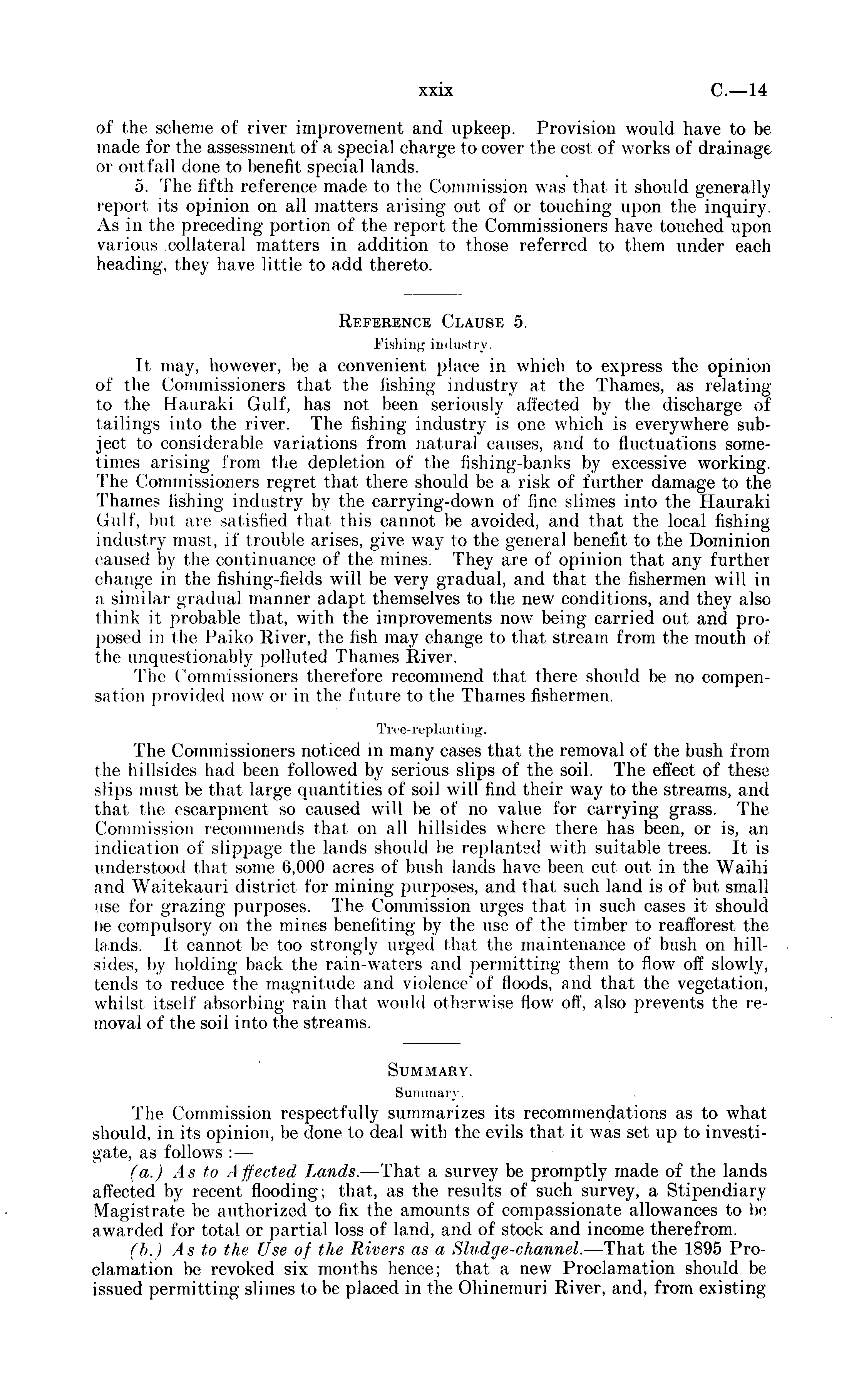 Summary. Summan . The Commission respectfully summarizes its recommendations as to what should, in its opinion, be clone to deal with the evils that it was set up to investigate, as follows : — (a.) As to Affected Lands. —That a survey be promptly made of the lands affected by recent flooding; that, as the results of such survey, a Stipendiary Magistrate be authorized to fix the amounts of compassionate allowances to be awarded for total or partial loss of land, and of stock and income therefrom. (b.) As to the Use of the Rivers as a Sludge-channel. —That the 1895 Proclamation be revoked six months hence; that a new Proclamation should be issued permitting slimes to be placed in the Ohinemuri River, and, from existing