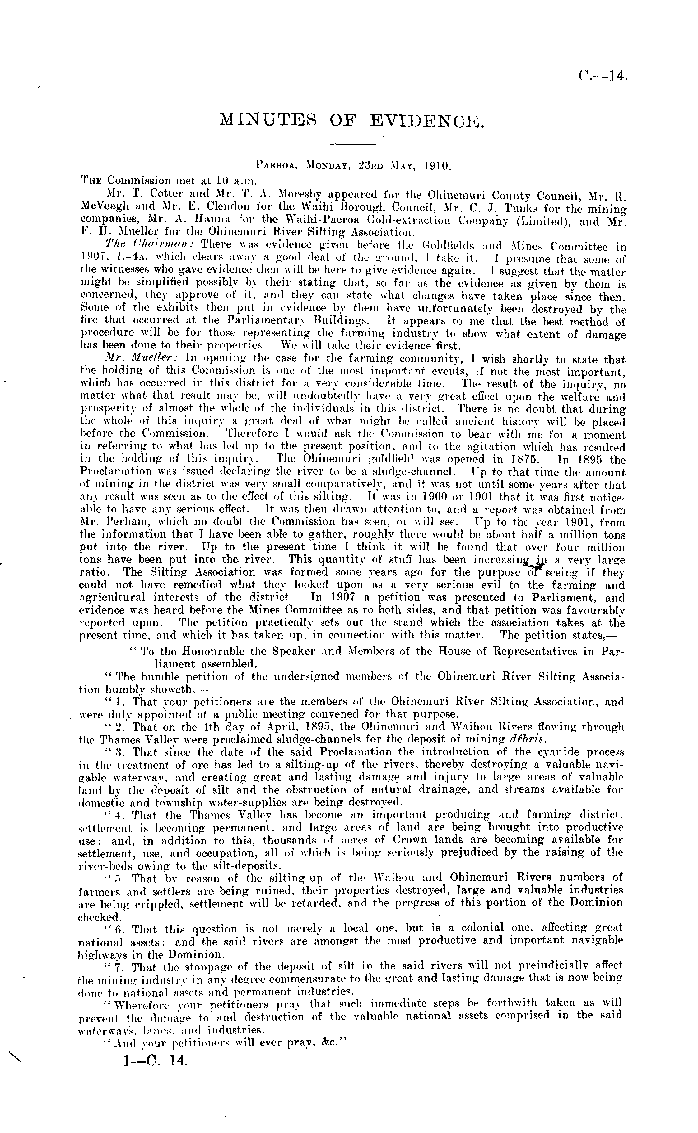 Pabroa, Monday, 23rd May, 1910. The Coiiiinissiui] met at 10 a.m. Mr. T. Cotter mid Mr. T. A. Moresby appeared for the Ohinemuri County Council, Mr. U. McVeagli and Mr. E. Clendon for the Waihi Borough Council, Mr. C. J. Tunks for the mining companies, Mr. A. Hanna lor the W'a ihi-Paeroa Gold-extraction Company (Limited), and Mr. F. H. Mueller for the Ohinemuri River Silting Association. The Chairman: There was evidence given before the Goldfields and Mines Committee in 1907, 1.-4 a, which clears away a good deal of the ground, i take it. I presume that some of the witnesses who gave evidence then will be here to give evidence again. 1 suggest that the matter might be simplified possibly bj their stating that, so far as the evidence as given by them is concerned, thej approve of it, and they can state what changes nave taken place since then. Some of the exhibits then put in evidence by them have unfortunately been destroyed by the fire that occurred at the Parliamentary Buildings. It appears to me that the best'method of procedure will be for those representing the farming industry to show what extent of damage has been done to their properties. We will take their evidence first. Mr. Mueller: In opening the case for the farming community, I wish shortly to state that the holding of this Commission is one of the most important events, if not the most important, which has occurred in this district for a very considerable time. The result of the inquiry, no matter what that result may he. will undoubtedly have a very great effect upon the welfare and prosperity of almost the whole of the individuals in this district. There is no doubt that during the whole of this inquiry a great deal of what might he called ancient history will be placed before the Commission. Therefore I would ask the Commission to bear with me for a moment in referring to what has led up to the present position, and to the agitation which has resulted in the holding of this inquiry. The Ohinemuri goldfield was opened in 1875. In 1895 the Proclamation was issued declaring the river to lje a sludge-channel. Up to that time the amount of mining in the district was very small comparatively, and it was not until some years after that any result was seen as to the effect of this silting. It was in 1900 or 1901 that it was first noticeable to have any serious effect. It was then drawn attention to, and a report was obtained from Mr. Perham, which no doubt the Commission has seen, or will see. Up to the year 1901, from the information that I have been able to gather, roughly there would be about half a million tons put into the river. Up to the present time I think it will be found that over four million tons have been put into the river. This quantity of stuff lias been increasing hi a very large ratio. The Silting Association was formed some years ago for the purpose orseeing if they could not have remedied what they looked upon as a very serious evil to the farming and agricultural interests of the district. In 1907 a petition was presented to Parliament, and evidence was heard before the Mines Committee as to both sides, and that petition was favourably reported upon. The petition practically sets out the stand which the l association takes at the present time, and which it has taken up, in connection with this matter. The petition states, — " To the Honourable the Speaker and Members of the House of Representatives in Parliament assembled. "The humble petition of the undersigned members of the Ohinemuri River Silting Association humbly showeth, — " 1. That your petitioners are the members of the Ohinemuri River Silting Association, and were duly appointed at a public meeting convened for that purpose. " I. That on the 4th day of April, 1895, the Ohinemuri and Waihou Rivers flowing through the Thames Valley were proclaimed sludge-channels for the deposit of mining debris. " •'!. That since the date of the said Proclamation the introduction of the cyanide process in the treatment of ore lias led to a silting-up of the rivers, thereby destroying a valuable navigable waterway, and creating great and lasting damage, and injury to large areas of valuable land by tin' deposit of silt and the obstruction of natural drainage, and streams available for domestic and township water-supplies are being destroyed. "4. That the Thames Valley has become an important producing and farming district, settlement is becoming permanent, and large areas of land are being brought into productive use: ami, in addition to this, thousands of acres of Crown lands are becoming available for settlement, use, and occupation, all of winch is being seriously prejudiced by the raising of the river-beds owing to the silt-deposits. "5. That by reason of the silting-up of the Waihou and Ohinemuri Rivers numbers of farmers and settlers are being ruined, their properties destroyed, large and valuable industries are being crippled, settlement will be retarded, and the progress of this portion of the Dominion clacked. " (i. That this (piestion is not merely a local one. but is a colonial one, affecting great national assets: and the said rivers are amongst the most productive and important navigable highways in the Dominion. " 7. That the stoppage of the deposit of silt in the said rivers will not preiudiciallv affect the mining industry in any degree commensurate to the great and lasting damage that is now being .lone to national assets and permanent industries. "Wherefore your petitioners pray that such immediate steps be forthwith taken as will prevent the damage to and destruction of the valuable national assets comprised in the said waterways. lands, ami industries. "And your petitioners will ever pray, &c."