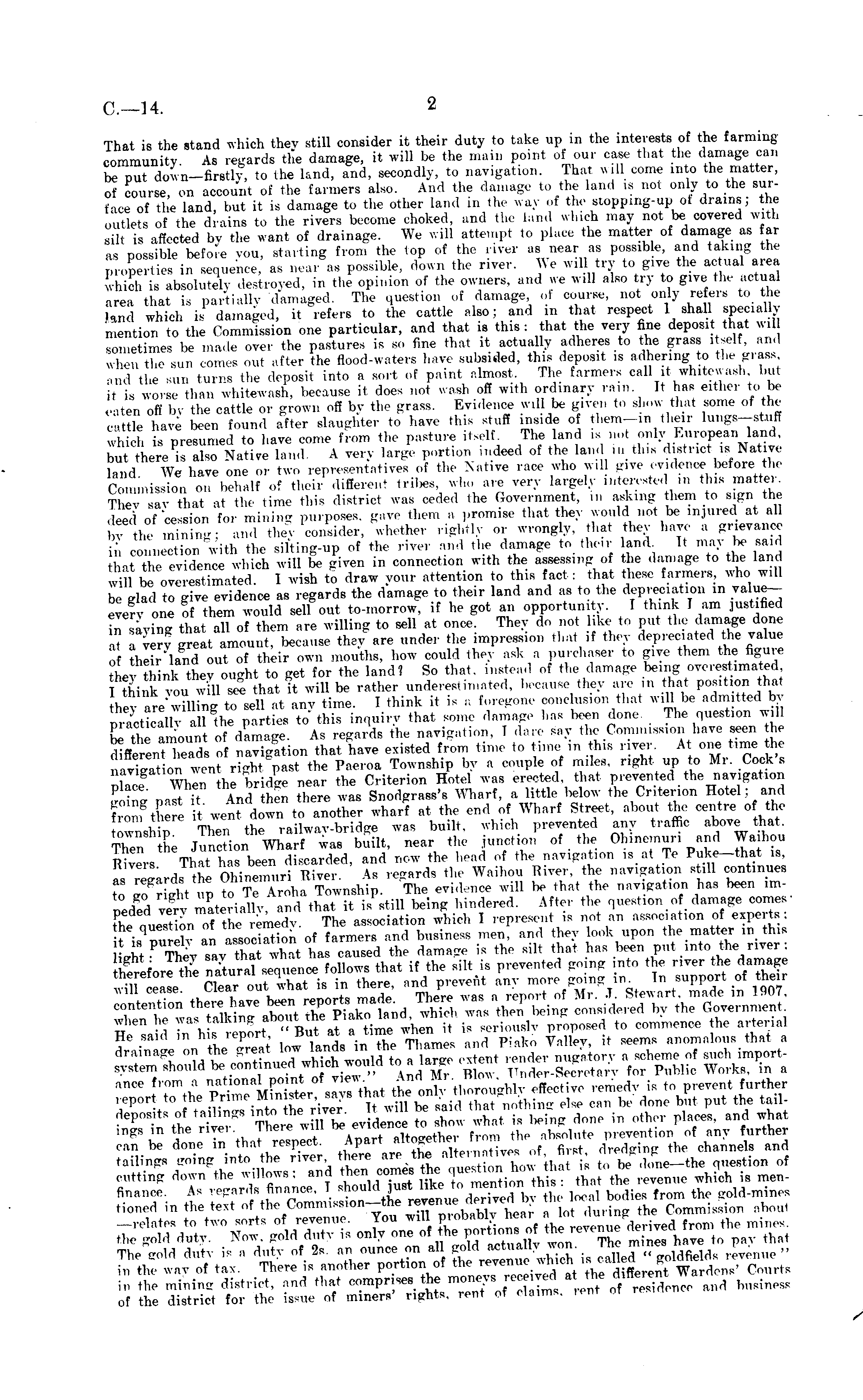 That is the stand which they still consider it their duty to take up m the interests of the farming community As regards the damage, it will be the main point of our case that the damage can be put down-firstly, to the land, and, secondly, to navigation. That will come into the matter, of course, on account of the farmers also. And the damage to the land is not only to the surface of the land, but it is damage to the other land in the way of the stopping-up ot drains; the outlets of the drains to the rivers become choked, and the laud which may not be covered with silt is affected by the want of drainage. We will attempt to place the matter of damage as far as possible before you, starting from the top of the river as near as possible, and taking the properties in sequence, as near as possible, down the river. We will try to give the actual area which is absolutely destroyed, in the opinion of the owners, and we will also try to give the actual area that is partially damaged. The question of damage of course, not only refers to the land which is damaged, it refers to the cattle also; and ... that respect 1 shall specially mention to the Commission one particular, and thai is this : that the very fine deposu that wil sometimes be made over the pasture- is so fine that it actually adheres to the grass itself, ami when the sun comes out after the flood-waters have subsided, tins deposit is adhering to the grass and the sun turns the deposit into a sort of paint almost The farmers call ,t whitewash but it is worse than whitewash, because it does not wash off with ordinary ram It has either to be eaten off by the cattle or grown off by the mass. Evidence will be given to show that some ot the cattle have been found after slaughter to have this stuff inside of them-in their lungs—stufl which is presumed to have come from the pasture itself. The land is not only European land, b here l ;' also Native land. A very large portion indeed of the land ,n this district is Native land AYe have one or two representatives of the Native race who wil give evidence before the Commission on behalf of their different tribes, *ho are very largely interested in this matter. They s,v that at the time this district was ceded the Government, m asking them to sign the deed of'cession for mining purposes, gave then, a promise that they would not be injured at all ), mining: and they consider, whether righth or wrongly, that they have a grievance h , con nection with the silting-up of the river and the damage to their land. It may be saw na the evidence which will be given in connection with the assessing o the damage to the land will be overestimated. 1 wish to draw your attention to this fact : that these farmers, who will be glad to give evidence as regards the damage to their land and as to the deprecation m valueever one of them would sell out to-morrow, if he got an opportunity. I think lam justified , vi, "that all of them are willing to sell at once. They do not like to put the damage done very Seat amount, because they are under the impression that if they depreciated the value O their land out of their own mouths, how could they ask a purchaser to give them the figure the v think-thev ought to get for the land? So that, instead of the damage being overestimated. thinkyou will see that it will be rather underestim, I, because they are in that Position that hey are'willing to sell at any time. I think it is a foregone conclusion that will be admitted by •ct cdlv all the parties to this inquiry that some damage has been done The question wll hi the amount of damage As regards the navigation. I dare say the Commission have seen the different heads navigation that have existed from time to time in this rive, At one time the S„ went right past the Paeroa Township by a couple of miles, right up to Mr. Cock s nlace When the bridge near the Criterion Hotel was erected that prevented the navigat.on place. vvnen wJ . Snodtrrass's Wharf, a little below the Criterion Hotel: and KmtLrl ft went down to wharf at the end of Wharf Street, about the centre of the from ttiere it c rairwav . D ridee was built, which prevented any traffic above that. Sen the Wo VarfJas buflt, near the junction of the Ohinemuri and Wa hou Rivers Thathas been discarded, and new the lead of the navigation ,s at Te Puke-that is, K,vers. It at nas oeen regards the Waihou River, the navigation still continues as regards the" The evidence will be that the navigation has been impeded vS ZHa lv d that it is P still being hindered. After the question of. damage comes ■ The ouestion o the remedy. The association which 1 represent is not an association of experts: , is q mreh an association of farmers and business men. and they look upon the matter in this Lht-ThJv say that what has caused the damage is the silt that has been put into the river; Stored n tura, ST "S otffi deposit, of tailings ,no thr■ v<£ t will be aid that . ,ngs in the river There will be «icience t prevention of any further can be done m that respect. ™etby rromt dredging the channels and tailings is to be*do g ne-the question of cutting down the willows, and «J» «gj £? e to mention this: that the revenue which is men- ,„ „„. „ iniM di«rioi, ..a a.i fi'ritf.SS " * *S-1 b»« « ol the di.trict tor the law of m.nCT. right*, """ 0' "■'""»■
