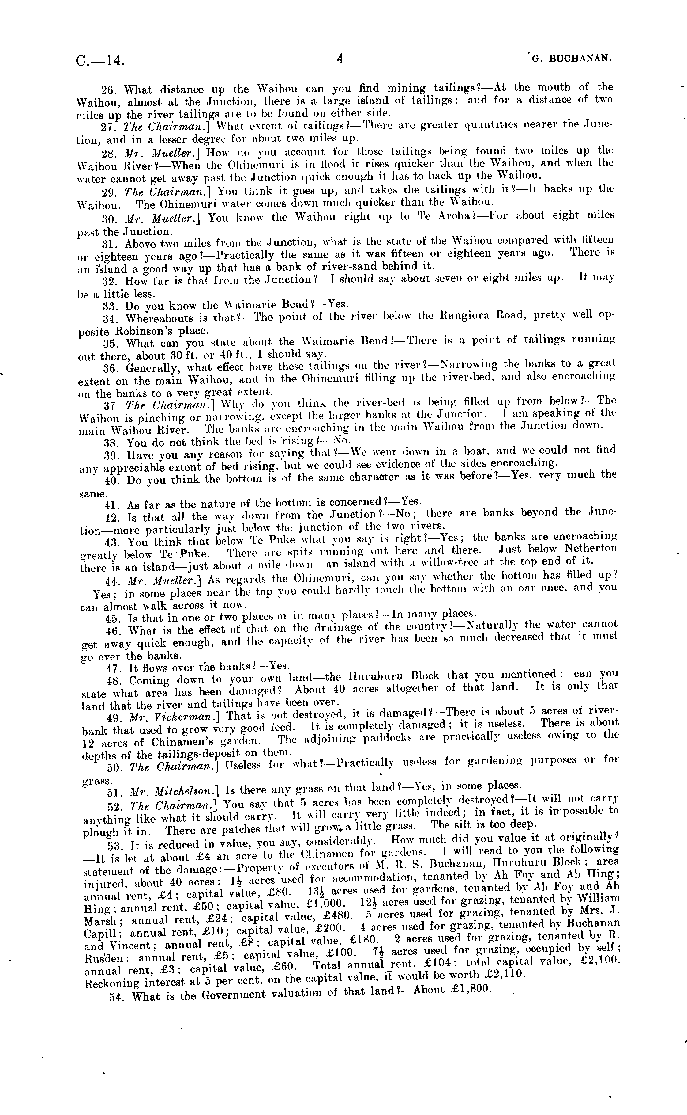 26. What distance up the Waihou can you find mining tailings?—At the mouth of the Waihou, almost at the Junction, there is a large island of tailings: and for a distance of two miles up the river tailings are to be found on either side. 27. The Chairman.] What extent of tailings? —There are greater quantities nearer the June tion, and in a lesser degree lor about two miles up. 28. Mr. Mueller.] How do you account for those tailings being found two miles up the Waihou River? —When the Ohinemuri is in flood it rises quicker than the Waihou, and when the water cannot get away past the Junction quick enough it has to back up the Waihou. 29. The Cliairman.] You think it goes up, and takes the tailings with i, /—lt backs up the Waihou. The Ohinemuri water comes down much quicker than the Waihou. 30. Mr. Mueller.] You know the Waihou right up to Te Aroha?—For about eight miles past the Junction. 31. Above two miles from the Junction, what is the state of the Waihou compared with htteen or eighteen years ago?— Practically the same as it was fifteen or eighteen years ago. There is an isfand a good way up that has a bank of river-sand behind it. 32. How far is that from the Junction? —I should say about seven or eight miles up. It maj be a little less. 33. Do you know the Waimarie Bend? —Yes. 34. Whereabouts is that .'—The point of the river below the Rangiora Road, pretty well op posite Robinson's place. , 35. What can you state about the Waimarie Bend/ — There is a point ot tailings running out there, about 30 ft. or 40 ft., I should say. 36 Generally, what effect have these tailings on the river/—Narrowing the banks to a great extent on the main Waihou, and in the Ohinemuri filling up the river-bed, and also encroaching on the banks to a very great extent. 37 The Chairman.] Why do you think the river-bed is being filled up from below/- Ihe Waihou is pinching or narrowing, except the larger banks at the Junction. lam speaking of the main Waihou River. The banks are encroaching in the main Waihou from the Junction down. 38. You do not think the lied is Vising 2—No. 39 Have you any reason for saving that .'—We went down in a boat, and we could not trod any appreciable extent of lied rising, but we could see evidence of the sides encroaching. 40? Do you think the bottom is of the same character as it was before?—les. very much the same. 41 As far as the nature of the bottom is concerned? —Yes. 42. Is that all the way down from the Junction?—No ; there are banks beyond the Junction—more particularly just below the junction of the two rivers. 43 You think that below Te Puke what you say is right?— Yes: the banks are encroaching ~re itlv below Te'Puke. There are spits running out here and there. Just below Netherton There is an island—just about a mile down-an island with a willow-tree at the top end of it 44 1//- Mueller] As regards the Ohinemuri, can you say whether the bottom has tilled up.' -Yes;'in some places near the top you could hardly touch the bottom with an oar once, and you can almost walk across it now. 45 Isthat in one or two places or in many places?—ln many places 46 What is the effect of that on the drainage of the country?— Naturally the water canno ge, away quick enough, and the capacity of the river has been so much decreased that it must go over the banks. 47. It flows over the banks.'—Yes. 48 Coming down to your own land—the Huiuhuru Block that you mentioned : can you state what area has been damaged/-About 10 acres altogether ot that land. It ,8 only that bind that the river and tailings have been over. 49 Mr Vickerman.] That is not destroyed, it is damaged 1 -There is about 5 acres of riverbank that used to grow very good feed. It is completely damaged :it is useless there is about ifacres of Chinamen's garden. The adjoining paddocks are practically useless owing to the useless for gardening purposes or for gl ' aSS sl Mr Mitchelson.] Is there any grass on that land?— Yes, in some places. -,2' The Chairman] You say that 5 acres has been completely destroyed?—lt will not carry anythinglke whatit should carry. It will carry very little indeed: in fact it is impossible to Ploughft "There are patches that will grow, a little grass. The silt is too deep injured, about 40 acies t* acres w* gardens, tenanted by Ah Foy and All and Vincent j annua rent £. pt a aim * by . ™pi« Valuer Total annualrent, £104; total capital value. ,2.100. Soning interest ats per cent, on the capital value, .would be •"*«."<>■ 54. What is the Government valuation of that land?-About £1,800. ,