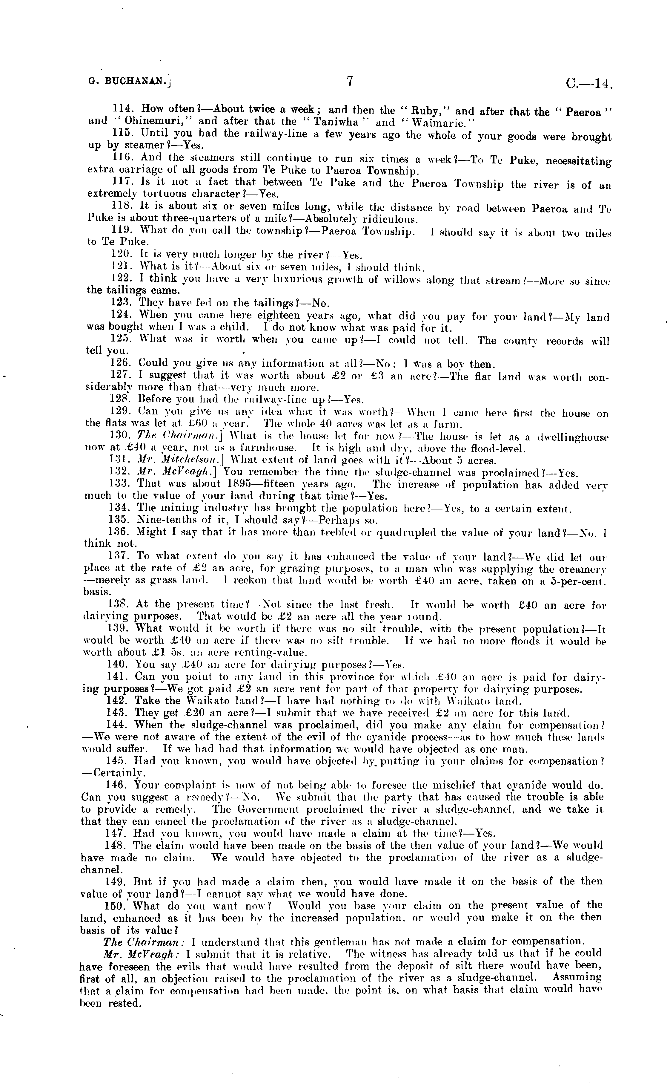 114. How often?— About twice a week; and then the " Ruby," and after that the " Paeroa " and -'Ohinemuri," and after that the "Taniwha" and "Waimarie." 115. Until you had the railway-line a few years ago the whole of your goods were brought up by steamer ?—Yes. 110. And the steamers still continue to run six times a week?—To Te Puke, necessitating extra carriage of all goods from Te Puke to Paeroa Township. 117. Is it not a fact that between Te Puke and the Paeroa Township the river is of an extremely tortuous character? —Yes. 118. It is about sis or seven miles long, while the distance by road between Paeroa and Te Puke is about three-quarters of a mile?— Absolutely ridiculous. 111). What do you call the township?—Paeroa Township. 1 should say it is about two miles to Te Puke. 120. It is very much longer by the river? —Yes. 121. What is it.' About six or seven miles, I should think. 122. I think you have a very luxurious growth of willow- along that stream/ -More so since the tailings came. 123. They have fed on the tailings?— No. 124. When you came her, eighteen years ago, what did you pay for your land?—My land was bought when 1 was a child. Ido not know what was paid for it. 125. What was it worth when you cam,' up?—l could not tell. The county records will tell you. 126. Could you give us any information at all/ No: 1 Was a boy then. 127. I suggest that it was worth about £2 or t.'S an acre ? -The flat land was worth considerably more than that vi'vy much more. 128. Before you had the railway-line up?— Yes. 129. Can you give us any idea what it was worth? When I came here first the house on the flats was let at £60 a year. The whole 40 acres was let as a farm. 130. The Chairman.] What is the house let for now/—The house is let as a dwellinghouse now at £40 a year, not as a farmhouse. It is high and dry, above the flood-level. 131. Mr. Mitchelson.] What extent of land goes with it /-About 5 acres. 132. Mr. McVeagh.] You remember the time the sludge-channel was proclaimed?— Yes. 133. That was about 1895 —fifteen years ago. The increase of population has added yen much to the value of your land during that time?— Yes. 134. The mining industry has brought the population here/ Yes, to a certain extent. 135. Nine-tenths of it. I should say.' Perhaps so. 136. Might I say that it has more than trebled or quadrupled the value of your land?— No. I think not. 137. To what extent do you say it has enhanced the value of your land?—We did let our place at the rate of ,£•_» an acre, for grazing purposes, to a man who was supplying the creamery —merely as grass land. 1 reckon that land would be worth £40 an acre, taken on a 5-per-cent. basis. 138. At the present time/ Not since the last fresh. It would be worth £40 an acre for dairying purposes. That would be £2 an acre all the year inund. 139. What would i, be worth if there was no silt trouble, with the present population?—lt would lie worth £40 an acre if then' was no silt trouble. If we had no more floods it would be worth about £1 ss. an acre renting-value. 140. You say £40 an acre for dairying purposes?— Yes. 141. Can you point to any land in this province for winch £40 an acre is paid for dairying purposes?—We got paid .£2 an acre rent for part of that property for dairying purposes. 142. Take the Wai'kato land/—I have had nothing to do with Waikato land. 143. They get £20 an acre? — 1 submit that we have received £2 an acre for this land. 144. When the sludge-channel was proclaimed, did you make any claim for compensation? —We were not aware of the extent of the evil of the cyanide process —as to how much these lands would suffer. If we had had that information we would have objected as one man. 145. Had you known, you would have objected by,putting in your claims for compensation? —Certainly. 146. Your complaint is now of not being able to foresee the mischief that cyanide would do. Can you suggest a remedy?— No. We submit that the party that has caused the trouble is able to provide a remedy. The Government proclaimed the river a sludge-channel, and we take it that they can cancel the proclamation of the river as a sludge-channel. 147. Had you known, you would have made a claim at the time?— Yes. 148. The claim would have been made on the basis of the then value of your land?—We would have made no claim. We would have objected to the proclamation of the river as a sludgechannel. 149. But if you had made a claim then, you would have made it on the basis of the then value of your land?—l cannot say what we would have done. 150. What do you want now? Would you base your claim on the present value of the land, enhanced as it has been by the increased population, or would you make it on the then basis of its value? The Chairman: 1 understand that this gentleman has not made a claim for compensation. Mr. McVeagh: 1 submit that it is relative. The witness has already told us that if he could have foreseen the evils that would have resulted from the deposit of silt there would have been, first of all, an objection raised to the proclamation of the river as a sludge-channel. Assuming that a claim for compensation had been made, the point is, on what basis that claim would have lieen rested.