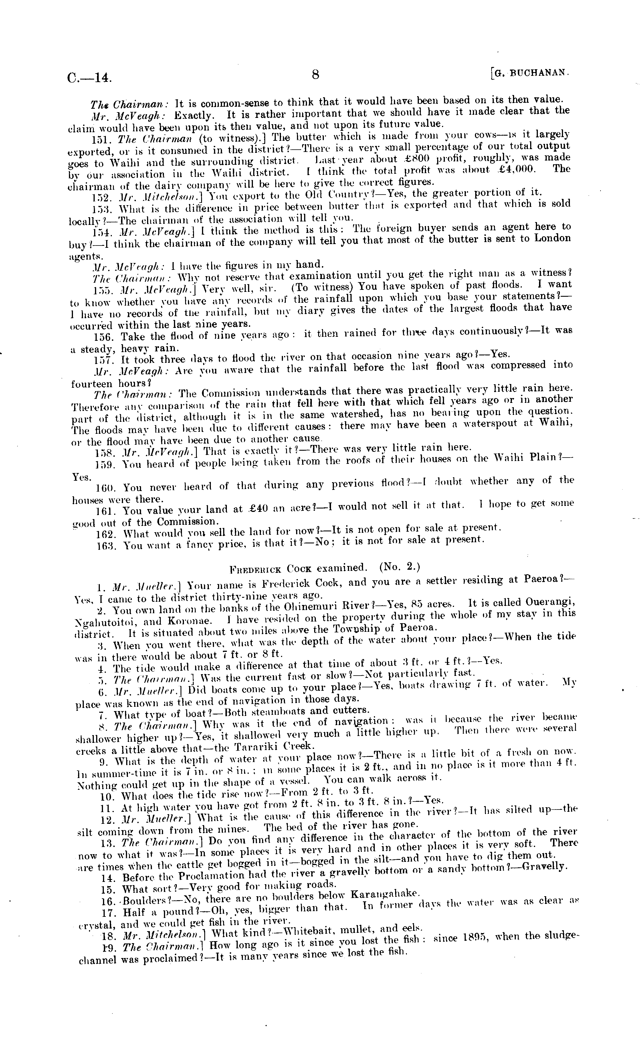 The Chairman : It is common-sense to think that it would have been based on its then value. Mr MeVeagh: Exactly. It is rather important that we should have it made clear that the claim would have been upon its then value, and not upon its future value. 151 The Chairman (to witness).] The butter which is made from your cows is it largely exported, or is it consumed in the district/ -There is a very small percentage oi our total output goes to Waihi and .he surrounding district hast year about £800 profit roughly, was made by our association in the Waihi district. I think the total profit was about £4.000. Ihe chairman of the dairy company will Ik- here to give the correct figures. L 52 Mr Mitchelson.] You export to the old Country?— Yes, the greater portion of it. ).-,:;. What is the difference in price between butter .hat is exported and that which is sold locally?—The chairman of the association will tell you. 154 Mr MeVeagh I I think the method is this: The foreign buyer sends an agent here to buy |. -I'think'the chairman of the company will tell you that most of the butter is sent to London agents. Mr. MeVeagh: I have the figures in my hand. , . , , The Chairman: Why m„ reserve that examination until you get the right man as a witness? IV, Mr MeVeagh \ Very well. sir. (To witness) You have spoken oi pas, floods. 1 want fo know'whether you have any records of the rainfall upon which you base your ff I have no records of .lie rainfall, but my diary gives the dates of the largest floods that have occurred within the last nine years. ~**.. 1 f,„„ .v-; [«.« 156. Take the II I of nine years ago: it then rained tor three days continuous!} /-It was a steady, heavy rain. . ~ v 157 It took three days to flood the river on that occasion Dine years ago/ — Yes. _ Mr. MeVeagh: Are you aware that the rainfall before the last H0,,,! was compressed into fourteen CommisBion understands that there was practically very little rain here Therefore aiTy comparis f the ram that fell here with that which fell years ago or in another ' . \ lf he district, although it is in ,he same watershed, has no tearing upon . he quesion. The floods may have been due to different causes: there may have been a waterspout at Waihi. or the flood may have been due to another cause. 158 Mr. MeVeagh.] That is exactly it /-There was very little rain here. i;,!». You heard of people being taken from the roofs of their houses on the Waihi Plain ?- Y " S ', ( ;o. You neve, heard of that during any previous fl 1/1 doubt whether any of the h, " ,S Mir:'You'v;;.ue your band a, £10 an acre?-I would no, sell it at that. I hope to ge, some ~ 1 nut of the Commission. 162 What would YOU sell the land lor now/-It is not open lor sale a, present. ,<;:('. You want a fancy price, is that it /-No: it is not for sale at pr 05,.,,,. Kkkhkimck Cock examined. (No. 2.) I Mr Mueller.] Your name is Frederick Cock, and you are a settler residing at Paeroa?V - ■! T: River ?-Yes. .5 acres. It is called Ouerangi Ngahutoitoi, "nd Koronae. I have resided on the property during the whole of my stay in this ttrel £?£ £*S Water a?oT 3 place? When the tide was in there would be about , t,. or Bft. Th tide W(iulll make a difference at that time of about 3ft .or 4 tj Yes. *" The Chn,rmai,;\ Was the current fast or slow / Not particularly fast ,!' Mr Mueller.\ Did boats come up to your place /-Vs. boats drawing , ft. ot w ate, . Mx place was know,, as the end oi navigation in those days. LsSSSSwSSl^^^^NothiToould get up in the sha, fa vessel. You can walk across it. |<>. What does the tide rise now / From 2ft. to 3ft , ? s. «—*. 15 What sort / Very good for making roads. It. .Ciders? No. there are no boulders beW Karanga a ke. &g 17. Half a pound/ Oh, yes, bigger than that. In tormei la. , rvstal and we could get fish in the river. CryBt ltt ~ *-«***£.] What kind / - Whitebait, eek. re 77, c <Wr„m„.] How long ago is it since you lost the tish . channel was proclaimed / -It is many years since we lost the fish.