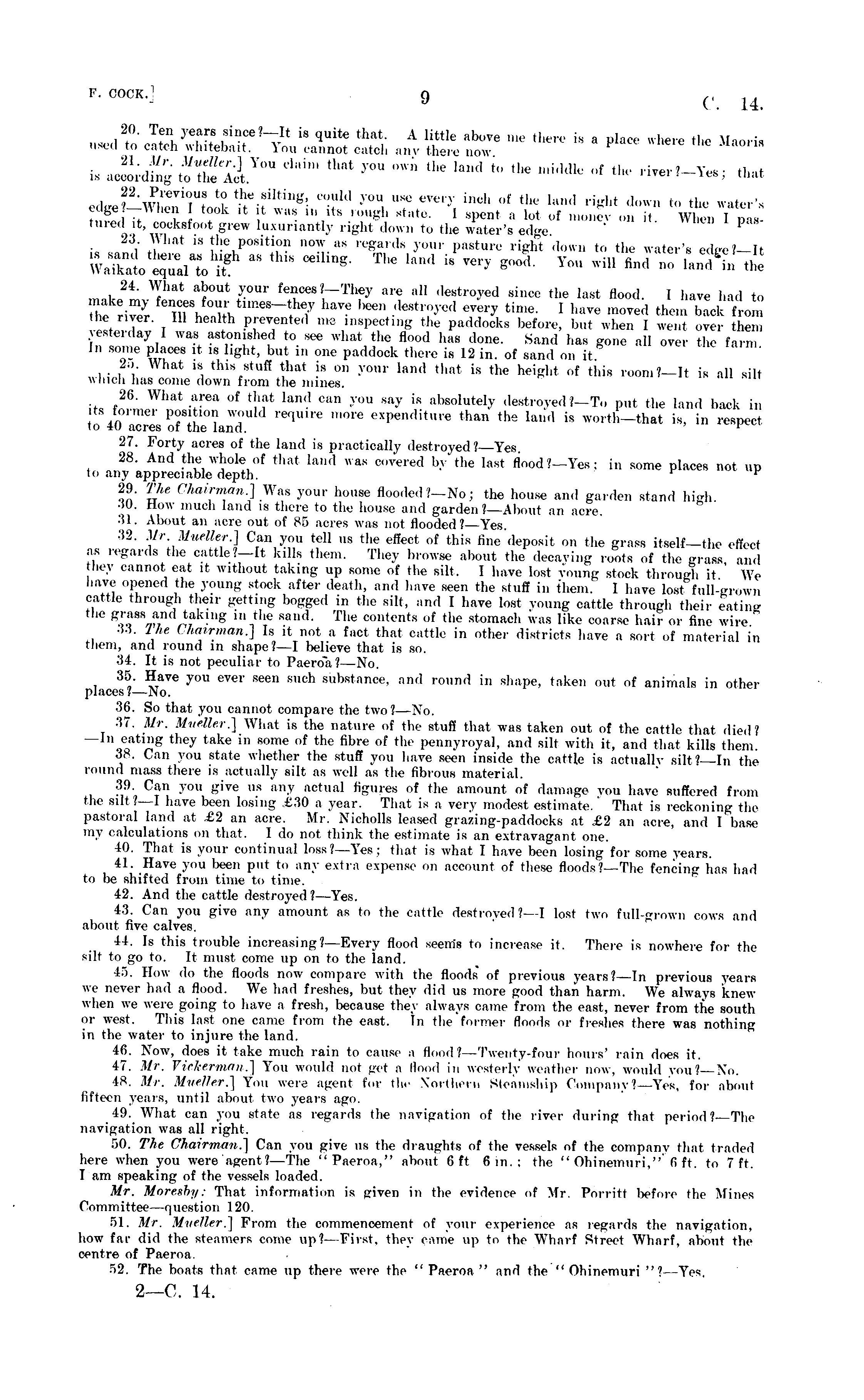 20. Ten years since?-It is quite that, A little above me there is a place where the Maoris tised to catch whitebait. You cannot catch any there now 21. bV. .!/„,//,,•. j y 0 U claim that you own the land to the middle of the river?— Yes • thai is according to the Act. '"'" 22. Previous to the silting, could you use every inch of the land right down to the water's edge- ANnon took ~ it was „, its rough state. I spent a lot of ,„ H it " When I pas tured it, cocksfoot grew luxuriantly right down to the water's edge ■ P 23. What ,s the position now as regards your pasture right down to the water's edge?—lt Walk! " "" '» "7 **• V "" * iU Hl "> "" '«»'' '»' * 24. What about your fences/-They are all destroyed since the last flood. I have had to he riveV l7}lZ* ''"" ' ha ™ moVed ««*» ««* from «he river. 11l health prevented me inspecting the paddocks before, but when I went over them yesterday ] was astonished to see what the flood has done. Sand has gone all over the farm In some places it is light, but in one paddock there is 12 in. of sand on i, 25 What is this stuff that is on your land that is the height of this room/-It is all silt which has come down from the mines. 26. What area of that land can you say is absolutely destroyed?—To put the land back in ts former position would require more expenditure than the laud is worth-that is. in re 5,,,,-, to 40 acres ot the land. ' 27. Forty acres of the land is practically destroyed?— Yes 28. And the whole of that land was covered by the last flood?-Yes: in some places „„t „p to any appreciable depth. ' ' 29. The Chairman.] Was your house flooded?—No; the house and garde,, stand high •SO. How much laud is there to the house and garden ?—About an acre 31. About an acre out of 85 acres was not flooded ?—Yes. ■'12. Mr. Mueller.] Can you tell us the effect of this fine deposit on the grass itself—the effect as regards the cattle?—lt kills them. They browse about the decaying roots of the grass and hey cannot eat it without taking up some of the silt. I have lost young stock through it 'We have opened the young stock after death, and have seen the stuff in them. I have lost full-grown cattle through their gelling bogged in the silt, and I have lost young cattle through their eating the grass and taking in the sand. The contents of the stomach was like coarse hair or tine wire 33, The Chairman.] Is it not a fact that cattle in other districts have a sort of mat,.rial in i hem. and round in shape?—l believe that is so. 34. It is not peculiar to Paerolr ?—No. 35 Have you ever seen such substance, and round in shape, taken out of animals in other places?— No. 36. So that you cannot compare the two?— No. 37. Mr. Muellrr.] What is the nature of the stuff that was taken out of the cattle that died? —In eating they take m seme of the fibre of the pennyroyal, and silt with it, and that kills them. 38. Can v.,u state whether the stuff you have seen inside the cattle is actually silt?—ln the round mass there is actually silt as well as the fibrous material. 39". Can you give us any actual figures of the amount of damage you have suffered from the silt?—l have been losing £30 a year. That is a very modest estimate. That is reckoning the pastoral land at £2 an acre. Mr. Nicholls leased grazing-pad,locks at £2 an acre, and 1 "base my calculations on that. Ido not think the estimate is an extravagant one. 40. That is your continual loss?— Yes; that is what I have been losing for some years. 41. Have you been put to any extra expense on account of these floods?—The fencing has had to be shifted from time to time. 42. And the cattle destroyed?— Yes. 43. Can you give any amount as to the cattle destroyed?—l lost two full-grown cows and about five calves. 44. Is this trouble increasing /—Every Hood seerda to increase it. There is nowhere for the silt to go to. It must come up on to the land. 45. How do the Hoods now compare with the floods of previous years?—ln previous years we uever had a flood. We had freshes, but they did us more good than harm. We always knew when we were going to have a fresh, because they always came from the east, never from the south or west. This last one came from the east. In the former Hoods or freshes there was nothing in the water to injure the land. 46. Now, does it take much rain to cause a Hood?— Twenty-four hours' rain does it. 47. Mr. Vickerman.] You would not get a Hood in westerly weather now. would you?— No. 48. Mr. Mueller.] You were agent for the Northern Steamship Company?- Yes, for about fifteen years, until about two years ago. 49. What can you state as regards the navigation of the river during that period? The navigation was all right. 50. The Chairman.] Can you give us the draughts of the vessels of the Company that traded here when you were agent?—The "Paeroa," about Oft Bin.: the " Ohinemuri," (i ft. to 7 ft. T am speaking of the vessels loaded. Mr. Moresbij: That information is irix'en in the evidence of Mr. Porritt before the Mines Committee—question 120. 51. Mr. Mueller.] From the commencement of your experience as regards the navigation, how far did the steamers come up?— First, they came up to the Wharf Street Wharf, about the centre of Paeroa. 52. The boats that came up there were the "Paeroa " and the "Ohinemuri "/ Yes.