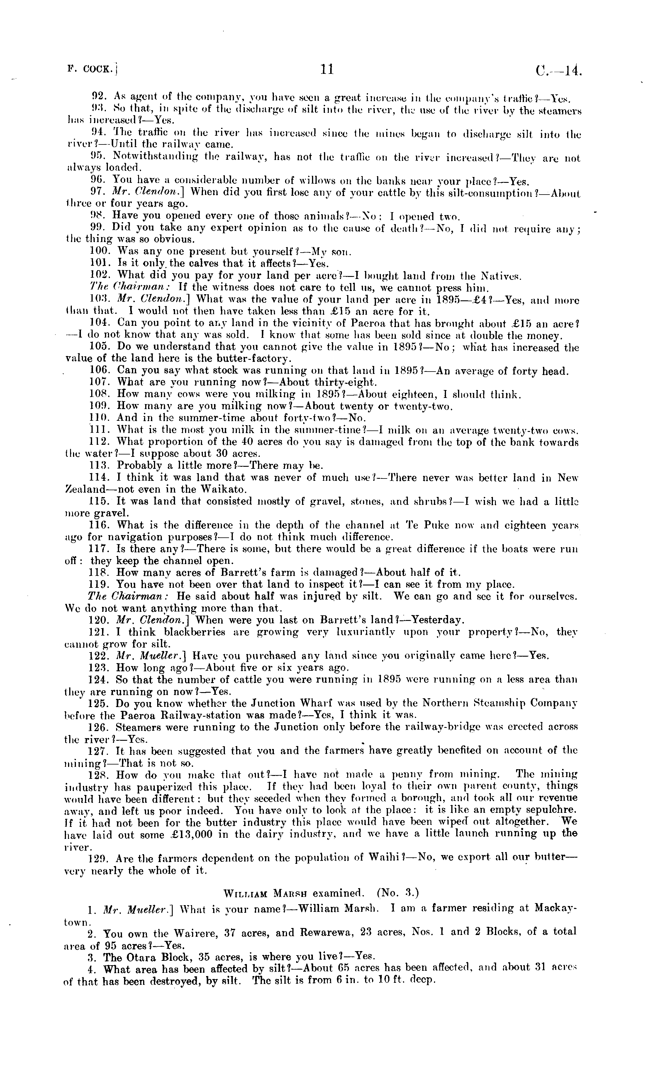 92. As agent of the Company, you have seen a great increase in the company's t rathe? Yes. 93. So that, in spite of the discharge of silt into the river, the use of the river by the steamers has increased ?—Yes. 94. The traffic Oil the river has increased since the mines began to discharge sill into (he river?—-Until the railway came. 1)5. Notwithstanding the railway, has not the traffic on the river increased/ They are not always loaded. !)ti. You have a considerable number of willows on the banks near your place?— Yes. 97. Mr. Clendon.] When did you first lose any of your cattle by this silt-consumption / Ahoul three or four years ago. 98. Have you opened every one of those animals 1— No; I opened two. 00. Did you take any expert opinion as to the cause of death? -No, 1 did not require ;nn : the thing was so obvious. 100. Was any one present but yourself?—My son. 101. Is it only, the calves that it affects? —Yes. 102. What did you pay for your land per acre/—1 bought hind from the Natives. '/'//, Chairman: If the witness does not care to 101 l us, we cannot press him. 103. Mr. Clendon.] What was the value of your land per acre in 1895—.£4?— Yes. and more than that. I would not then have taken less than £15 an acre for it. 101. Can you point to any land in the vicinity of Paeroa that has brought about £15 an acre? —I do not know that any was sold. I know thai some has been sold since at double the money. 105. Do we understand that you cannot give the value in 1895?— No: what has increased the value of the land here is the butter-factory. 106. Can you say what stock was running on that land in 1805/—An average of forty head. 107. What are you running now?— About thirty-eight. 108. How many cows were you milking in 1805/- About eighteen, I should think. 109. How many are you milking now/—About twenty or twenty-two. 110. And in the summer-time about forty-two?— No. 111. What is the most you milk in the summer-time /—I milk on an average twenty-two cows. I 12. What proportion of the 40 acres do you say is damaged from the lop of the bank towards the water?—l suppose about .'lO acres. 113. Probably a little more?— There may be. 114. I think it was land that was never of much use?— There never was better land in NewZealand —not even in the Waikato. 115. It was land that consisted mostly of gravel, stones, and shrubs?—] wish we had a little more gravel. 116. What is the difference in the depth of the channel at Te Puke now and eighteen years ago for navigation purposes?—l do not think much difference. 117. Is there any?— There is some, but there would be a great difference if the boats were run off : they keep the channel open. 118. How many acres of Barrett's farm is damaged?— About half of it. 119. You have not been over that land to inspect it?—l can see it from my place. 77/e Chairman : He said about half was injured by silt. We can go and see it for ourselves. We do not want anything more than that. 120. Mr. Clendon.] When were you last on Barrett's land?— Yesterday. 121. I think blackberries arc growing very luxuriantly upon your property? —No, Ihe\ cannot grow for silt. 122. Mr. Mueller.] Have you purchased any land since you originally came here? —Yes. 123. How long ago?— About five or six years ago. 124. So that the number of cattle you were running in 1895 were running on a less area than they arc running on now?— Yes. 125. Do you know whether the Junction Wharf was used by the Northern Steamship Company before the Paeroa Railway-station was made? —Yes. I think it was. 126. Steamers were running to the Junction only before the railway-bridge was erected across the river?— Yes. 127. Tt has been suggested that you and the farmers have greatly benefited on account of the mining? —That is not so. 128. How do you make that out?—l have not made a penny from mining. The mining industry has pauperized this place. If they had liccn loyal to their own parent county, things would have been different : but they seceded when they formed a borough, and took all our revenue away, and left us poor indeed. You have only to look al the place: if is like an empty sepulchre. If it had not been for the butter industry this place would have been wiped out altogether. We have laid out some .£13,000 in the dairy industry, and we have a little launch running up the river. 120. Arc the farmers dependent on the population of Waihi? —No, we export all our butter— very nearly the whole of it. Wim.iam Marsh examined. (No. 3.) 1. Mr. Mueller.] What is your name?— William Marsh. I am a farmer residing at Mackaytown. 2. You own the Wairere, 37 acres, and Rewarewa. 23 acres, Nos. 1 and 2 Blocks, of a total area of 95 acres?— Yes. 3. The Otara Block. -'15 acres, is where you live?— Yes. 1. What area has been affected by silt?— About 05 acres has been affected, and about 31 acre; of that has been destroyed, by silt. The silt is from 6 in. to 10 ft. deep.