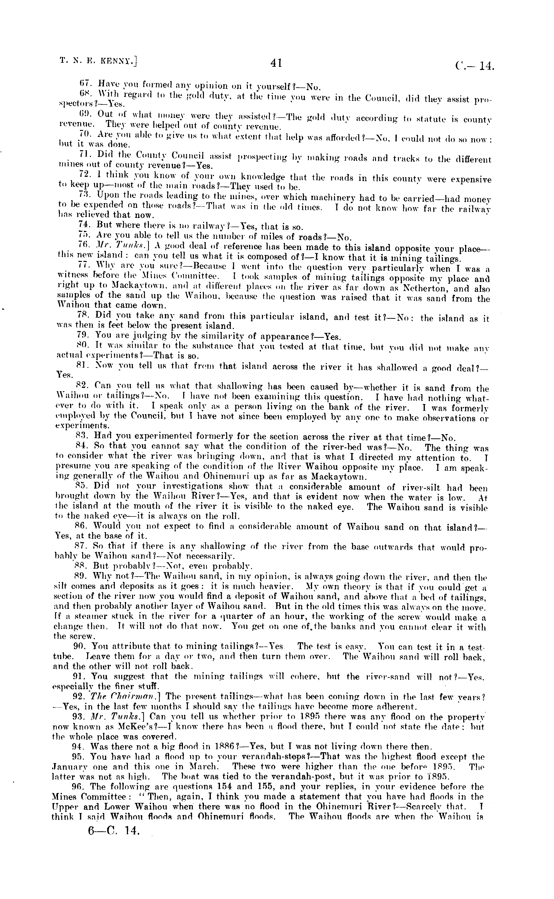 07. Have you formed any opinion on it yourself? No 68. With regard to the gold duty, at the time you were in the Council, did they assist pro specters : 1 es. • l 69- Out of what money were they assisted /-The gold duty according to statute is county revenue. 11,ey were helped out of county revenue. 70. Are you able lo give us to what extent .hat help was afforded /—No. I could not do so now ; out it was done. n. Did the County Council assist prospecting by making roads and tracks to the different mines out of county revenue?— Yes. 72. 1 think you know of your own knowledge that the roads in this county were expensive to keep up most of the main roads /-They used to be. ' 7.'i. Upon the roads leading to the mines, over which machinery had to be carried- had money to I K . expended on those roads?-That was in the old times. Ido not know how far the railway has relieved that now. 74. Hut where there is m, railway?— Yes, that is so. 75. Are you able to tell us the number of miles of roads/ No. _ To. Mr. Tunks.] \ good deal of reference has been made to this island opposite your place— this new island : can you tell us what it is composed of ?—I know that it is mining tailings. it. Why are you sure? -Because I went into the question very particularly when I was a witness before the Mines Committee. I took samples of mining tailings opposite my place and right up to Mackaytown. and at different places on the river as far down as Netherton, and also samples of the sand up ihe Waihou. because ihe question was raised that it was sand from the W aihoii that came down. 78. Did you take any sand from this particular island, and test it?—No: the island as it was then is feet below the present island. 79. You are judging by the similarity ~f appearance?— Yes. 80. 1, was similar to the substance thai you tested at that time, but you did not make any actual experiments?— That is so. 81. Now you tell us that from that island across the river it has shallowed a good deal?— Yes. 82. Can you tell us what that shallowing has been caused by—whether it is sand from the Waihou or tailings/--No. I have not been examining this question. f have had nothing whatever to do with it. I speak only as a person living on the bank of the river. 1 was formerly employed by the Council, but I have not since lieei, employed by any one to make observations or experiments. 83. Had you experimented formerly for the section across the river at that time? No. 84. So that you cannot say wdiat the condition of the river-bed was?— No. The thing was io consider what the river was bringing down, and that is what I directed my attention to. I presume you are speaking of the condition of the River Waihou opposite my place. lam speaking generally of the Waihou and Ohinemuri up as far as Mackaytown. 85. Did not your investigations show that a considerable amount of river-silt had been brought down by the Waihou River?— Yes, and that is evident now when the water is low. At the island at the mouth of the river it is visible to the naked eye. The Waihou sand is visible to the naked eye —it is always on the roll. 86. Would you not expect to find a considerable amount of Waihou sand on that island? Yes, at the base of it. 87. So that if there is any shallowing of the river from the base outwards that would probably be Waihou sand?— Not necessarily. 88. But probably? Not, even probably. 89. Why not? —The Waihou sand, in my opinion, is always going down the river, and then the silt conies and deposits as it goes :it is much heavier. My own theory is that if you could get a sectil f the river now you would find a deposit of Waihou sand, and above that a lx-,1 of tailings, and then probably another layer of Waihou sand. Hut in the old times this was alw ays on the move. If a steamer stuck in the river for a quarter of an hour, the working of the screw would make a change then. It will not do that now. You get on one of.the banks and you cannot clear it with the screw. 90. You attribute that to mining tailings?— Yes The test is easy. You can test it in a testtube. Leave them for a day or two, and then turn them over. The Waihou sand will roll hack, and the other will not roll back. 91. You suggest that the mining tailimrs will cohere, but the river-sand will not?— Yes. especially the finer stuff. 92. The Chairman.] The present tailings—what has been coming down in the last few years/ —Yes, in the last few months I should say ihe tailings have become more adherent. 93. Mr. Tunks.] Can you tell us whether prior to 1895 there was any flood on the property now known as McKee's?—l know there has been a. flood there, but T could not state the dale: but the whole place was covered. 94. Was there not a big flood in 1880?— Yes, but I was not living down there then. 95. You have had a flood up to your verandah-steps?— That was Ihe highest flood except the January one and this one in March. These two were higher than tl ne before 1895. The latter was not as high. The boat was tied to the verandah-post, but it was prior to 1895. 96. The following are questions 154 and 155, and your replies, in your evidence before the Mines Committee: '-Then, again. I think you made a statement that you have had floods in the Upper and Lower Waihou when there was no flood in the Ohinemuri River?— Scarcely that. T think. I said Waihou floods and Ohinemuri floods. The Waihou floods are when the Waihou is