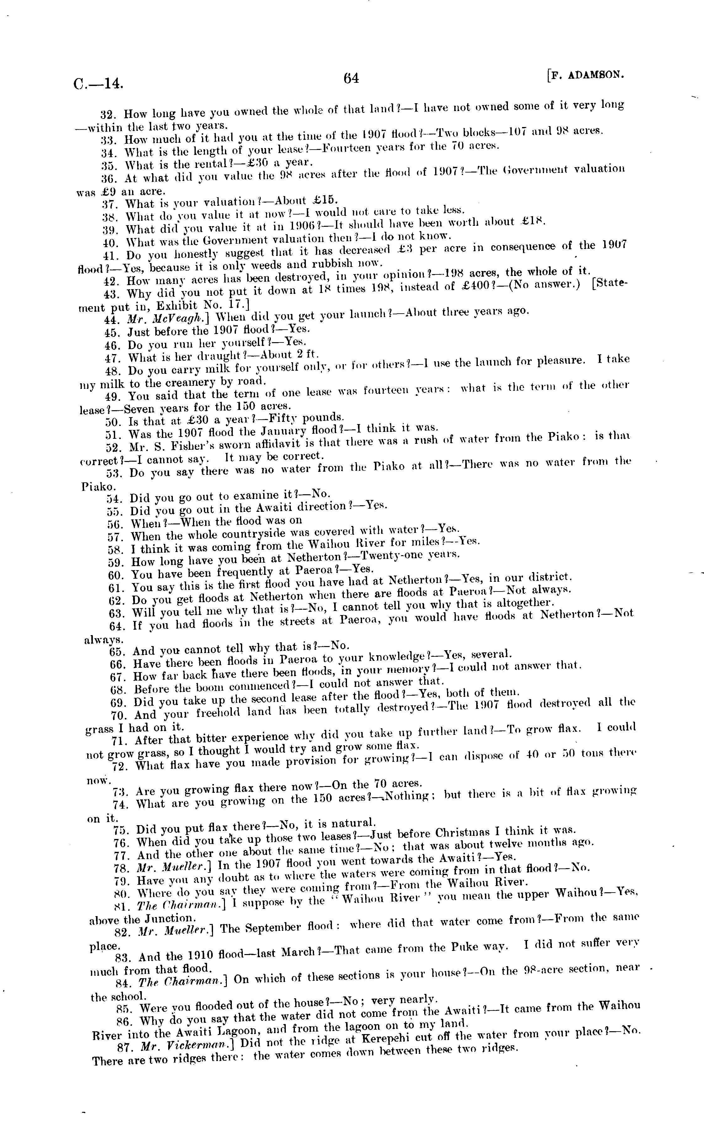 32 How long have you owned the whole of that land/-I have not owned some of it very long w, 33 i^lcrw l ;::uch'::f• in';:,.. y *u ; „ ,i, ,1,,, ,„■ *. mi ■ 1. t«««*. m, 7 ami n aces. 31 What is the length Of your lease.'- -Fourteen years for the 70 acres. Si ~2 tLMlcres after the fl Of 1907?-The Cover nt valuation was £'.) an acre. 37 What is your valuation/- About £10. 38! What do'vou value it at now ! I would not care to take less 39 What did you value it a. in 19061—1 l should have been worth about £18. 11l What was the Government valuation then?—l do not know. 41. So you honestly suggest thai it has decreased £3 per acre ,n consequence of the 1901 1 V..s bee,,,<■■ i, is only weeds and rubbish now. H^T^^ meiit put in, Exhibit No. 17.] ~ ,t, ~,.„ a „ 0 44 Mr. MeVeagh.] When did you get your launch /-About three years ago. 15. Just before the 1907 flood/ Yes. 46 Do you run her yourself ? —Yes. II- S£. h ££3fi; £S,»i y ,., to, „„,-, -» *<™.*■-- '•*■ " ,v,, ;;:M-:,i":.u:r;i;:"w:;;:;'..< - ~ -•» - >■ - - h ""•"• "■ "*' l eaBe ?-lseven years for the 150 acres. 50. Is thai at £30 a year?— Fifty pounds. a- zr tJZttt&S&ZXZ :: s- — - "*• ■ - -■«■ - m^.t. c ;ri"'-ii,,,,-'™;,l:'™.'"' , f', „..- «-»>., -n-i*- «.... - .■ •■ Piako. . ..„-»! 54 Did you go out to examine it?—JNo. 55 Did You go out in the Awaiti direction!—H-s. s(i. Wheii/—When the flood was on :,7 When the whole countryside was covered with water ! Us. 58 1 think it was coming from the Waihou River for ™1«»-«- Y--59 How long have you been at Netherton /-lwenty-o„e years. 1 1 Srsft=Att tsws- — " Wft 6s". And you cannot tell why that is?— No. :;,■ — ■ 08 Before the In, commenced?-l could not answer that ft - H - - grass 1 had on it. , further land?—To grow flax. I could 71 After that bitter experience why did urn tab, up turtnei &f2£!22£2l?&S£. t ZZ&- *- -■ ■ ■ ""••- ..-No- -.... 81 r*e CActrmon.] I suppose by the wainou rwvei . tt^B2% J r Un S«-.] The September H 1: where did that water come from ?-Fr„n, the same Pll '% M,d the 1910 flood-las, M arch/--That came from the Puke way. I did not suffer very mU Vj.7htSla & irtn.] On which of these sections is your house?-On the 98-acre section, near tiiAwaiti hagoon and fro.the ££■£ to my and. ,ft ~,.