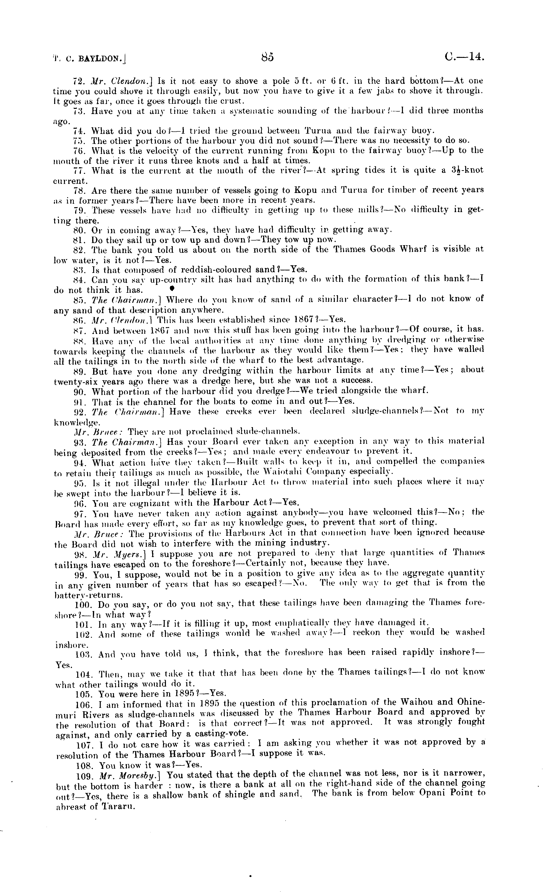 72. Mr. Clendon.] Is it not easy to shove a pole 5 ft. or 6ft. in the hard bottom?—At one time you could shove it through easily, but now you have to give ii a few jabs to shove it through. It goes as far, once it goes through the crust. 73. Have you at any time taken a systematic sounding of the harbour/ 1 did three months ago. 74. What did you do? —1 tried the ground between Turua and the fairway buoy. 75. The other portions of the harbour you did not sound I— There was no necessity to do so. 70. What is the velocity of the current running from Kopu to the fairway buoy?—Up to the mouth of the river it runs three knots and a half at times. 77. What is the current at the mouth of the river"?—Al spring tides it is quite a 3A-km>t current. 78. Are there the same number of vessels going to Kopu and Turua for limber of recent years as in former years?— There have been more in recent years. 79. These vessels have had no difficulty in getting up to these mills/ No difficulty in getting there. 50. Or in coining away/ —Yes, they have had difficulty in getting away. 51. Do they sail up or tow up and down/—They tow up now. 82. The bank you told us about on the north side of the Thames floods Wharf is visible at low water, is it not?— Yes. 83. Is that composed of reddish-coloured sand?— Yes. 84. Can you say up-country sill has had anything to do with the formation of this bank? —I do not think it has. • 85. The Chairman.] Where do you know of sand of a similar character?—l do not know of any sand of thai description anywhere. SO. Mr. Clendon. | This has been established since 1867?- Yes. 87. And between 1867 and now this stuff has been going into the harbour/ Of course, it has. SS. Have any of the local authorities al any time done anything by dredging or otherwise towards keeping the channels of the harbour as they would like them?—Y'es : they have walled all the tailings in to the north side of the wharf to the liest advantage. 89. Hut have you done any dredging within the harbour limits at any time? —Yes: about twenty-six years ago there was a dredge here, but she was not a success. 90. What portion of the harbour did you dredge?—We tried alongside the wharf. 91. That is the channel for the boats to com,- in and out? —Yes. 92. The Chairman.] Have these creeks ever been declared sludge-channels/—Not to my knowledge. Mr. Bruce: They are not proclaimed slude-channels. 93. The Chairman.] Has your Hoard ever taken any exception in any way to this material being deposited from the creeks/—Yes: and made everj endeavour to prevent it. 111. What action have they taken /—Built walls t,, keep it in. and compelled the companies to retain their tailings as much as possible, the W'aiotahi Coin],any especially. 95. Is it nol illegal under th. Harbour Act to throw material into such places when- it may be swepl into the harbour/ I bt-lieve it is. 90. You are cognizant with the Harbour Act? —Yes. 97. You have never taken any action against anybody- you have welcomed this? -No; the Board has made every effort, so far as my knowledge goes, to prevent that sort of thing. Mr. Brute: The provisions of the Harbours Acl in that connection have been ignored because the Hoard did not wish to interfere- with the mining industry. 98. Mr. Myers.] I suppose you are not prepared to deny that large quantities of Thames tailings have escaped on to the foreshore/ Certainly not, because they have. 99. You, I suppose, would not be in a position to give any idea as to the aggregate quantity in any given number of years that has so escaped?— No. The only way lo get that is from the battery-returns. 10(1. Do you say. or do you not say. that these tailings have been damaging the Thames fore shore? —In what way 1 101. In any way?—lf ii is filling it up, most emphatically they have damaged it. 102. And some' of these tailings would be washed away/ I reckon they would lie washed inshore. 103. And you have told us. I think, that the foreshore has been raised rapidly inshore?— Yes. 104. Then, may we take it that thai has been done by the Thames tailings?—l do not know what other tailings would do it. 105. Y 7 ou were here in 1895?— Yes. 106. I am informed that in 1895 the question of this proclamation of the Waihou and Ohinemuri Rivers as sludge-channels was discussed by the Thames Harbour Board and approved by the resolution of that Board: is thai correct?—lt was not approved. It was strongly fought against, and only carried by a casting-vote. 107. I do not care how it was carried: I am asking you whether it was not approved by a resolution of the Thames Harbour Board?—l suppose it was. 108. You know it was?— Yes. 109 Mr. Moresby.] You stated that the depth of the channel was not less, nor is it narrower, but the bottom is harder : now, is there a bank at all mi the right-hand side of the channel going ol ,t?_Yos, there is a shallow bank of shingle and sand. The bank is from below Opani Point to abreast of Tararu.