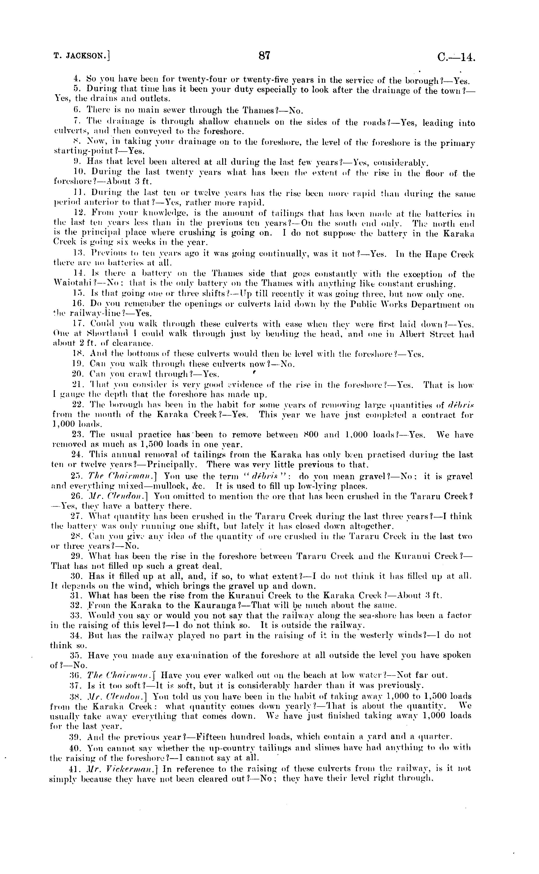 I. So you have been for twenty-four or twenty-live years in the service of the borough/- Yes. 5. During that time has it been your duty especially to look after the drainage of the town? Yes, the drains and outlets. 6. There is no main sewer through the Thames/ No. 7. The drainage is through shallow channels on the sides of the reads/-Yes. leading into culverts, and then conveyed to the foreshore. 8. Now, in taking your drainage on to the foreshore, the level of the foreshore is the primary si art ing-point /--Yes. 9. lias that level been altered at all during the last few years?— Yes, considerably. 10. During the last twenty years what has been the evtenl of the rise in the floor of the foreshore? About 3 ft. 11. During ihe I.is! ten or twelve years has the rise been more rapid than during the same period anterior to that? —Yes, rather more rapid. 12. From your knowledge, is the amount of tailings that has been made at ihe batteries in the last ten years less than in the previous ten years? On the south end only. Tha north end is the principal pla.ee where crushing is going on. I do not suppose the battery in the Karaka Creek is going six weeks in the year. 13. Previous to ten years ago it was going continually, was il not / - Yes. In the Hape Creek there are no batteries at all. 14. Is there a battery on the Thames side that goes constantly with the exception of the Waiotalli / No ; thai is the only battery on the Thames with anything like constant crushing. 15. Is that going on,- oi three shifts? Up till rea ntly it was going three, but now only one. 16. Do you remember (he openings or culverts laid down by the Public Works Department on the railway-line?— Yes. 17. Could you walk through these culverts with ease when they were first laid down/ Yes. (hie at Shortland 1 could walk through just by bending the head, and one in Albeit Street had about 2 ft. of clearance. 18. And the bottoms of these culverts would then b, level with the foreshore/ Yes. 19. Can you walk through these culverts now ?- No. 20. Can you crawl through?— Yes. ' 21. 'lhat you consider is very good evidence of the rise in the foreshore.' Yes. That is how I gauge ihe depth that the foreshore has made up. 22. The borough has been in the habit for some years of removing large quantities of dibris from the mouth of the Karaka Creek/--Y'es. This year we have just completed a contract for 1.00(1 loads. 23. The usual practice has been 1., remove between 800 and 1.000 loads/—Yes. We have removed as much as 1,500 loads ill one yon 21. This annual removal of tailings from the Karaka has only been practised during the last ten or twelve years /--Principally. There was very little previous to that. 25. Tin Chairman.] You use the term " dSbris ": do you mean gravel/ -No; it is gravel ami everything mixed—mullock, &c. It is used to (ill up low-lying places. 20. Mr. Clendon.] You omitted to mention the ore that has been crushed ill the Tararu Creek/ -Yes, they have a battery there. 27. What quantity has been crushed in the Tararu Cnek during the last three years/ -I think the battery was only running one shift, but lately it has closed down altogether. 28. Can you give any idea of the quantity of ore crushed in the Tararu Creek in the last two or three years / — No. 29. What has been the rise in the foreshore between Tararu Creek and the Kuranui Creek/--That has no! filled up such a great deal. 30. lias it filled il], at all. and. if so, to what extent/- I ,1, t think it has tilled up at all. It depends on the wind, which brings the gravel up and down. 31. What has been the rise from the Kuranui Creek to the Karaka Creek/ —About 3ft. 32. From the Karaka to the Kauranga/- That will be much about the same. 33. Would you say or would you not say that the railway along the sea-shore has been a factor in the raising of this level?—l do not think so. It is outside the railway. 34. But has the railway played no part in the raising of i: in the westerly winds/- I do not think so. 35. Have you made any examination of the foreshore at all outside the level you have spoken of?— No. -'10. Th' Chairman.] Have you ever walked out on ihe beach at low water? Not far out. 37. Is it too soft /—lt is soft, but it is considerably harder than it was previously. ■ l.s. Mr. Clendon.] You told us you have been in the habit of taking away 1.000 to 1,500 loads from the Karaka Creek: what quantity comes down ycarh ' 4 hat is about tin- quantity. We usually lake away everything that coiiies down. We have just finished taking away 1,000 loads for the last year. 39. And the previous year?— Fifteen hundred loads, which contain a yard and a quarter. 40. You cannot say whether the up -country tailings and slimes have had anything to do with the raising of the foreshore?—] cat say at all. 41. Mr. Vickerman.] In reference to the- raising of these culverts from the railway, is it not simply because they have not been cleared out /-No: they have their level right through.