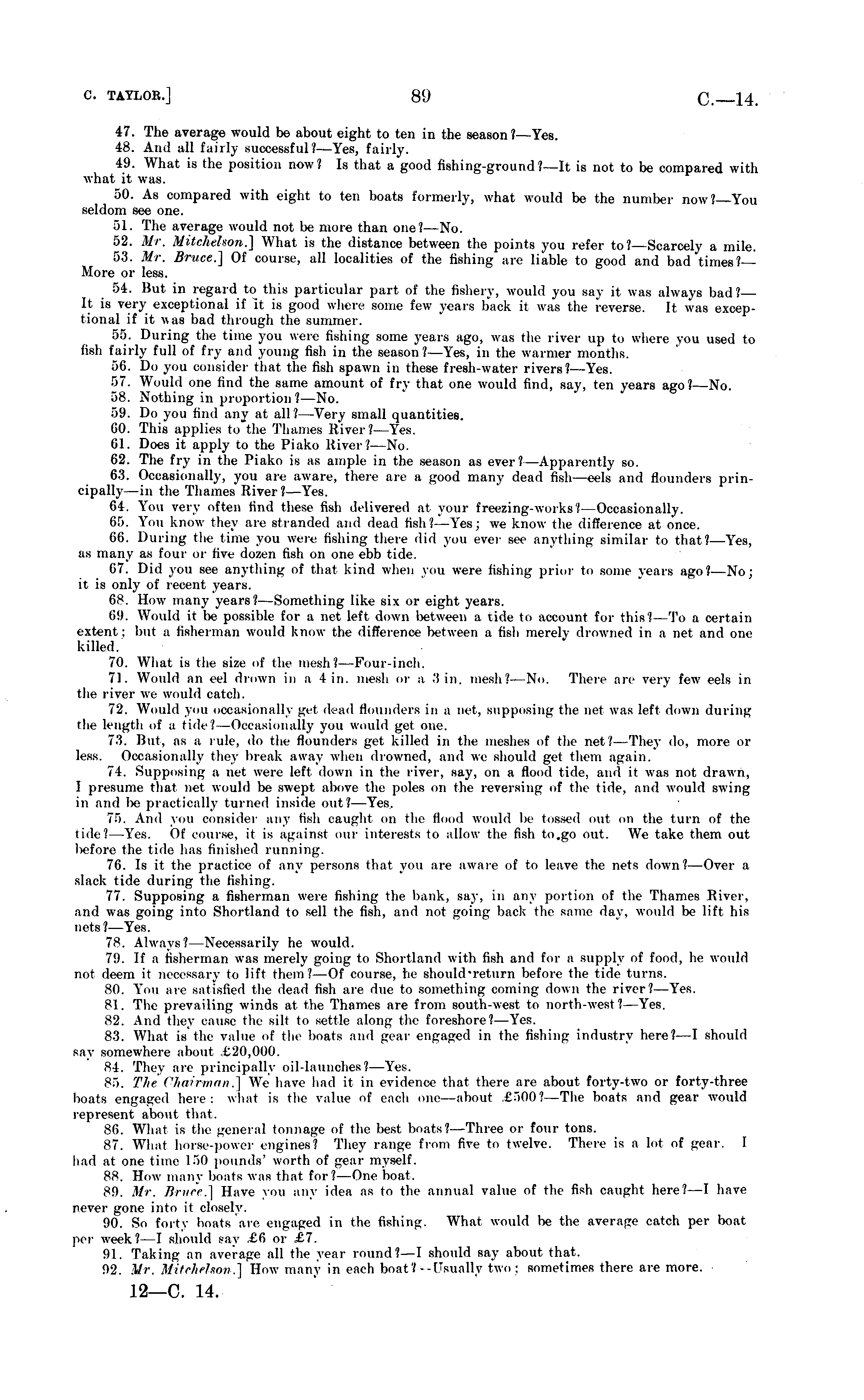 47. The average would be about eight to ten in the season? —Yes. 48. And all fairly successful?— Yes, fairly. 49. What is the position now? Is that a good fishing-ground?—lt is not to be compared with what it was. 50. As compared with eight to ten boats formerly, what would be the number now? You seldom see one. 51. The average would not be more than one?— No. 52. Mr. Mitchelson.] What is the distance between the points you refer to?— Scarcely a mile. 53. Mr. Bruce.] Of course, all localities of the fishing are liable to good and bad times? More or less. 54. Hut in regard to this particular part of the fishery, would you say it was always bad?— It is very exceptional if it is good where some few years back it was the reverse. It was exceptional if it was bad through the summer. 55. During the time you were fishing some years ago, was the river up to where you used to fish fairly full of fry and young fish in the season? —Yes, in the warmer months. 56. Do you consider that the fish spawn in these fresh-water rivers?— Yes. 57. Would one find the same amount of fry that one would find, say, ten years ago?— No. 58. Nothing in proportion?— No. 59. Do you find any at all? —Very small quantities. GO. This applies to the Thames River?— Yes. 61. Does it apply to the Piako River?— No. 62. The fry in the Piako is as ample in the season as ever? —Apparently so. 63. Occasionally, you are aware, then- are a good many dead fish —eels and flounders principally—in the Thames River ? —Yes. 64. You very often find these fish delivered at your freezing-works?— Occasionally. 65. You know they are stranded and dead fish?—Y'es; we know the difference at once. 66. During the time you were fishing there did you ever see anything similar to that?— Yes, as many as four or five dozen fish on one ebb tide. 07. Did you see anything of that kind when you were fishing prior to some years ago?—No; it is only of recent years. 68. How many years?— Something like six or eight years. 69. Would it be possible for a net left down between a tide to account for this?—To a certain extent; but a fisherman would know the difference between a fish merely drowned in a net and one killed. 70. What is the size of the mesh? —Four-inch. 71. Would an eel drown in a 4 in. mesh or a 3 in. mesh /—No. There are very few eels in the river we would catch. 72. Would you occasionally get dead flounders in a net, supposing the net was left down during the length of a tide? —Occasionally you would get one. 73. But, as a rule, do the flounders get killed in the meshes of the net/ —They do, more or less. Occasionally they break away when drowned, and we should get them again. 74. Supposing a net were left down in the river, say, on a flood tide, and it was not drawn, I presume that net would be swept above the poles on the reversing of the tide, and would swing in and lie practically turned inside out?— Yes. 75. And you consider any fish caught on the Hood would be tossed out on the turn of the tide/—Yes. Of course, it is against our interests to allow the fish to .go out. We take them out liefore the tide has finished running. 76. Is it the practice of any persons that you are aware of to leave the nets down? —Over a slack tide during the fishing. 77. Supposing a fisherman were fishing the bank, say, in any portion of the Thames River, and was going into Shortland to sell the fish, and not going back the same day. would be lift his nets?— Yes. 78. Always?— Necessarily he would. 79. If a fisherman was merely going to Shortland with fish and for a supply of food, he would not deem it necessary to lift them?—Of course, lie should-return before the tide turns. 80. You are satisfied the dead fish are due to something coming down the river?— Yes. 81. The prevailing winds at the Thames are from south-west to north-west?— Yes. 82. And they cause the silt to settle along the foreshore?— Yes. 83. What is the value of the boats and gear engaged in the fishing industry here?—l should say somewhere about £20,000. 84. They are principally oil-launches? —Yes. 85. The Chan-man.] We have had it in evidence that there are about forty-two or forty-three boats engaged here: what is the value of each one —about £500?—The boats and gear would represent about that. 86. What is the general tonnage of the best boats? —Three or four tons. 87. Whal horse-power engines? They range from live to twelve. There is a lot of gear. I had at one time 150 pounds' worth of gear myself. 88. How many boats was that for? —One boat. 89. Mr. Bruce.] Have you any idea as to the annual value of the fish caught here? —I have never gone into it closely. 90. So forty boats are engaged in the fishing. What would be the average catch per boat per week ?—I should say £0 or £7. 91. Taking an average all the year round? —I should say about that. 92. Mr. Mitchelson.] How many in each boat?— Usually two; sometimes there are more.