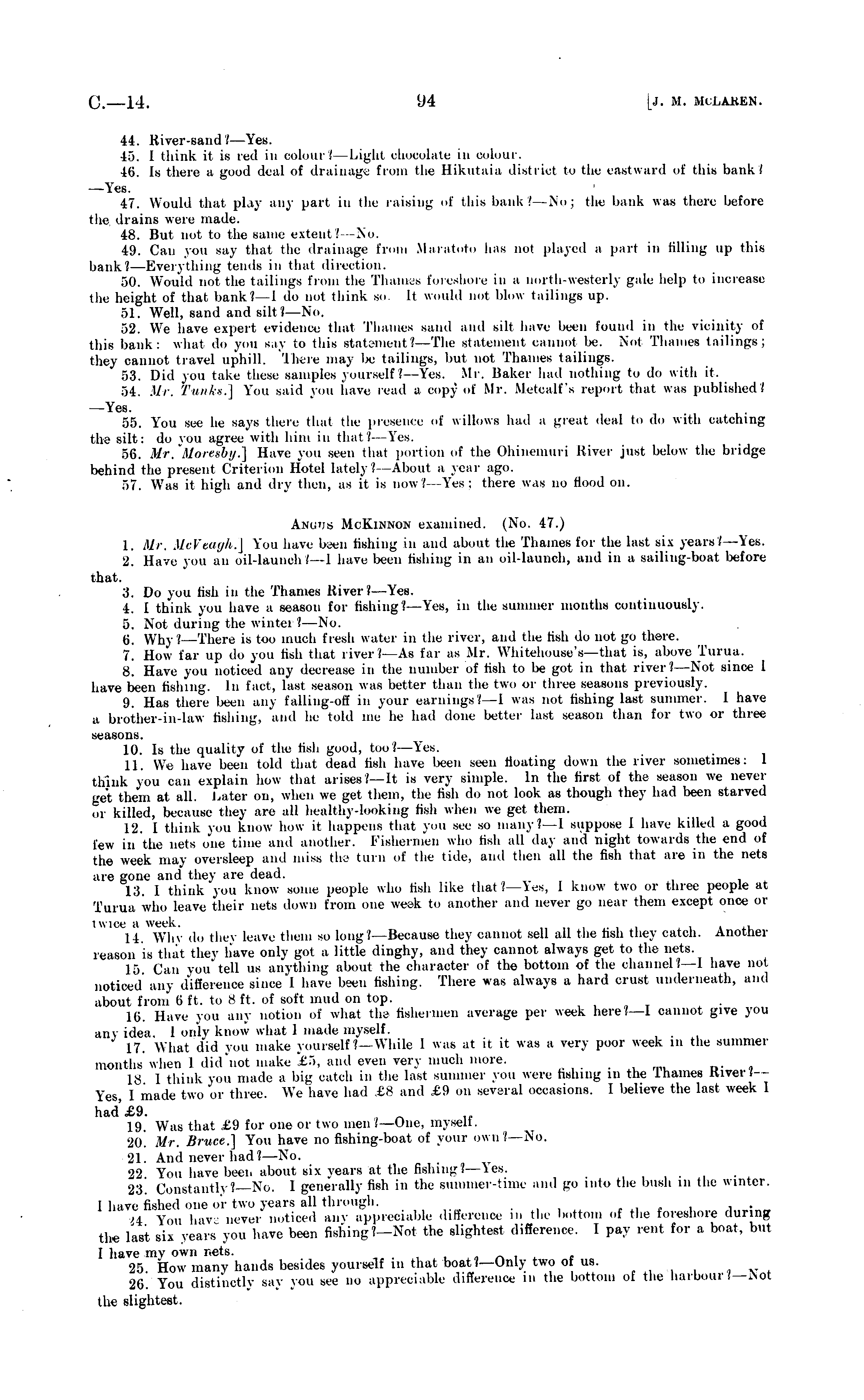 44. River-sand? —Yes. 45. 1 think it is red in colour? —Light chocolate in colour. 46. Is there a good deal of drainage from the Hikutaia district to the eastward of this bank I —Yes. 47. Would that play any part in the raising of this bank/ No; the bank was there before the drains were made. 48. But not to the same extent / No. 49. Can you say that ihe drainage from Maratoto has not played a part in filling up this bank? —Everything tends in that direction. 50. Would not the tailings from the Thames foreshore in a north-westerly gale help to increase the height of that bank? —I do not think so. It would not blow failings up. 51. Well, sand and silt? —No. 52. We have expert evidence that Thames sand and silt have been found in the vicinity of this bank: what do you say (o this statement?—The statement cannot lie. Not Thames tailings: they cannot travel uphill. Ihere may lie tailings, but not Thames tailings. 53. Did you take these samples yourself? —Yes. Mr. Baker had nothing to do with it. 54. Mr. Tunks.] You said you have read a copy of Mr. Metcalf's report that was published? —Yes. 55. You see he says there that the presence of willows had a great deal to do with catching the silt: do you agree with him in that? —Yes. 56. Mr. Moresby.] Have you seen that portion of the Ohinemuri River just below the bridge behind the present Criterion Hotel lately?— About a year ago. 57. Was it high and dry then, as it i.s now / -Yes : there was no flood on. Anous MoKinnon examined. (No. 47.) 1. Mr. MeVeagh,] You have been fishing in and about the Thames for the last six years?— Yes. 2. Have you an oil-launch (—1 have been fishing in an oil-launch, and in a sailing-boat before that. 3. Do you fish in the Thames River? —Yes. 4. I think you have a season for fishing?— Yes, in the summer months continuously. 5. Not during the wintei ?—No. 6. Why? —There is too much fresh water in the river, and the fish do not go there. 7. How far up do you fish that river/ —As far as Mr. Whitehouse's—that is, above Turua. 8. Have you noticed any decrease in the number of fish to be got in that river?— Not since I have been fishing. In fad, last season was better than the two or three seasons previously. 9. Has there been any falling-off in your earnings?—l was not fishing last summer. 1 have a brother-in-law fishing, "and he told me he had done better last season than for two or three seasons. 10. Is the quality of the lish good, too? —Yes. 11. We have been told that dead lish have been seen floating down the river sometimes: 1 think you can explain how that arises/— It is very simple. In the first of the season we never get them at all. Later on, when we get them, the lish do not look as though they had been starved or killed, because they are all healthy-looking fish when we get them. 12. I think you know how it happens that you see so many?—l suppose I have killed a good lew in the nets one time and another. Fishermen who lish all day and night towards the end of the week may oversleep and miss the turn of the tide, and then all the fish that are in the nets are gone and they are dead. 13. 1 think you know some people who fish like that/—Yes, I know two or three people at Turua who leave their nets down from one week to another and never go near them except once or 1 w ice a week. . . , 14. Why do they leave them so long /--Because they cannot sell all the fish they catch. Another reason is that they have only got a little dinghy, and they cannot always get to the nets. 15 Can you tell us anything about the character of the bottom of the channel?—l have not noticed any difference since'l have been fishing. There was always a hard crust underneath, and about from 6 ft. to 8 ft. of soft mud on top. 16. Have you any notion of what the fishermen average per week here?—l cannot give you any idea. 1 only know what 1 made myself. 17. What cfid you make yourself ?—While 1 was at it it was a very poor week m the summer months when 1 did "not make £5, and even very much more. 18 I think you made a big catch in the last summer you were fishing in the ihames Kiver/--Yes, 1 made two'or three. We have had £8 and £9 on several occasions. I believe the last week 1 had£9. 19. Was that £9 for one or two men /—One, myselt. 20. Mr. Bruce.] You have no fishing-boat of your own ?—No. 21. And never had?— No. 22 You have been about six years at the fishing?— Yes. _ .... 23. Constantly? No. 1 generally lish in the summer-time and go into the bush m the winter. I have fished one or two years all through. '4 You h-iv never noticed any appreciable difference in the bottom ot the foreshore during the last six years you have been fishing?— Not the slightest difference. I pay rent for a boat, but I have mv own nets. ~.„«, * 25 How many hands besides yourself in that boat?— Only two of us. 20' You distinctly say you see no appreciable difference in the bottom ot the harbour /—Not the slightest.
