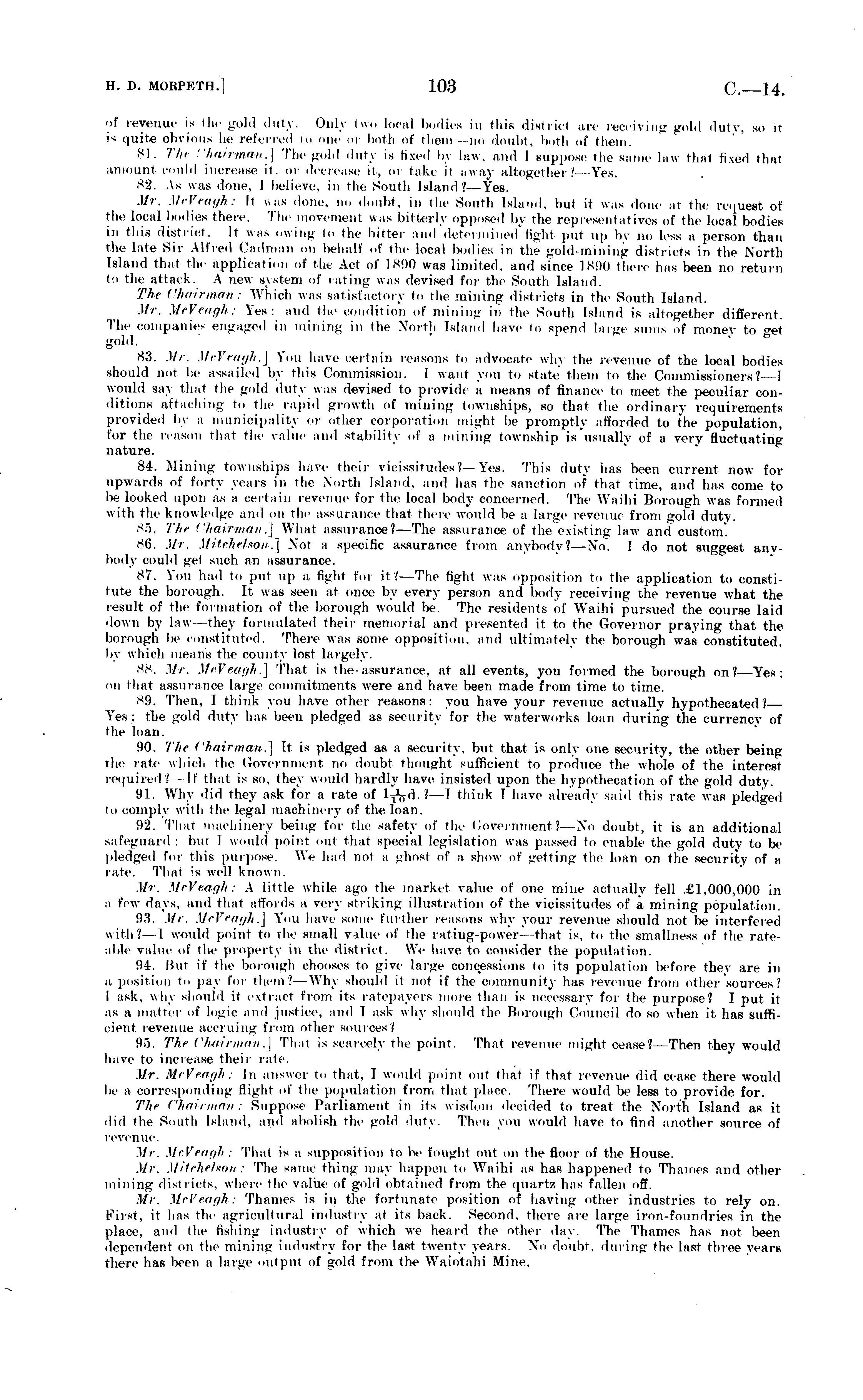 of revenue is the gold duty. Only two local bodies in this district are receiving gold duty, so it is quite obvious he referred lo one nr both of them no doubt, both of them. 81. Tin "hairman.] The gold duty is lived by law, and I suppose the same law that fixed that amount could increase it, or decrease il, or take ii away altogether? 82. As was done, I believe, in the South Island.' Yes. Mr. MeVeagh: It was done, no doubt, in ihe Smith Island, but it was done at the request of the local bodies there. The movement was bitterly opposed by the representatives of the local bodies m this district. It was owing to the bitter and detei mined light put up by no less a person than ihe late Sir Alfred ('adman on behalf of the local bodies in the gold-mining districts in the North Island that the application of the Act of I S9O was limited, and since 1890 .her, has been no return .-, the attack. A new system of rating was devised for the South Island. The Chairman : Which was satisfactory to the mining districts in the South Island. Mr. MeVeagh: Yes: and the condition of mining in the South Island is altogether different. 4'h, companies engaged in mining in the North Island have to spend bug, sums of money to <>-et . d. 83. Mr. MeVeagh.] You have certain reasons to advocate wh\ the revenue of the local bodies should not be assailed by this Commission. I warn you to state .hem ~, the Commissioners? I would sa\ that .he gold duty was devised to provid, a means of finance to meet the peculiar conditions al.aching to the rapid growth of mining townships, so that the ordinary requirements provided by a municipality or other corporal ion might be promptly afforded to the population, for the reason that the value and stability of a mining township is usually of a very fluctuating nature. 84. Mining townships have their vicissitudes?- Yes. This duty has been current now for upwards of forty years in the .North Island, and has the sanction of that time, and has come to 1,.- looked upon as a certain revenue for the local body concerned. The Waihi Borough was formed with the knowledge and on .1,,- assurance that there would be a large revenu, from gold duty. 85. The Chairman.] What assurance?—The assurance of the existing law and custom. 86. Mr. Mitchelson.] Not a specific assurance from anybody? —No. 1 do not suggest anj body could get such an assurance. 87. You had to put up a fight for it/—The fight was opposition to the application to constitute the borough. It was seen at once by every person and body receiving the revenue what the result of the formation of the borough would Ik-. The residents of Waihi pursued the course laid down by law —they formulated their memorial and presented it to the Governor praying that the borough be constituted. There was some opposition, and ultimately the borough was constituted, by which means the county lost largely. 88. Mr. MeVeagh.] That is the assurance, a 1 all events, you formed the borough on?— Yes; on lhat assurance large commitments were and have been made from time to time. 89. Then, I think you have other reasons: you have your revenue actually hypothecated? Yes: the gold duty has been pledged as security for the waterworks loan during the currency of the loan. 90. The Chairman .-] It is pledged as a security, but that is only one security, the other being the rate which .he Government no doubt thought sufficient to produce the whole of the interest required? If lhat is so. they would hardly have insisted upon the hypothecation of the gold duty. 91. Why did they ask for a rate of ?— I think I have ahead)- said this rate was pledged to comply will, ihe legal machinery of the loan. 92. That machinery being for the safety of the Government?—No doubt, it is an additional safeguard: but I would point mi, that special legislation was passed to enable the gold duty to be pledged for this purpose.. We had no. a ghost of a show of getting the loan on the security of a rate. That ; s well known. Mr. MeVeagh: \ little while ago the market value of one mine actually fell £1.000,000 in a few days, and that affords a very striking illustration of the vicissitudes of a, mining population. !)•'!. Mr. MeVeagh.] You have some further reasons why your revenue should not Ik- interfered with?—] would point to ihe small value of ihe rating-power that is, to the smallness of the rateable value of the property in .he district. We have to consider the population. 94. But if tin- borough cl ses to give hug,- concessions to its population before they are in a position to pay for them.' Why should it not if the community has revenue from other sources.' 1 ask, why should it extracl from its ratepayers more than is necessary for the purpose? I put it as a mailer of logic and justice, and I ask why should the Borough Council do so when it has sufficient revenue accruing from other sources' 95. The Chairman .] That is scarcely the point. That revenue might cease?— Then they would have to increase their rale. .1//-. MeVeagh: In answer lo that. I would point out that if that revenue did cease there would 1,,- a corresponding Sight of the population from that place. There would be less to provide for. The Chairman: Suppose Parliament in its wisdom decided to treat the North Island as it did the South Island, and abolish the gold duty. Then you would have to find another source of revenue. .1//-. MeVeagh : That is a supposition to 1m- fought out on the floor of the House. Mr. Mitchelson: The same thing may happen '~ Waihi as has happened to Thames and other mining districts, where the value of gold obtained from the quartz has fallen off. Mr. MeVeagh: Thames is in the fortunate position of having other industries to rely on. First, it has the agricultural industry at its back. Second, there are large iron-foundries in the place, and the fishing industry of which we heard the other day. The Thames has not lieen dependent on the mining industry for the last twenty years. No