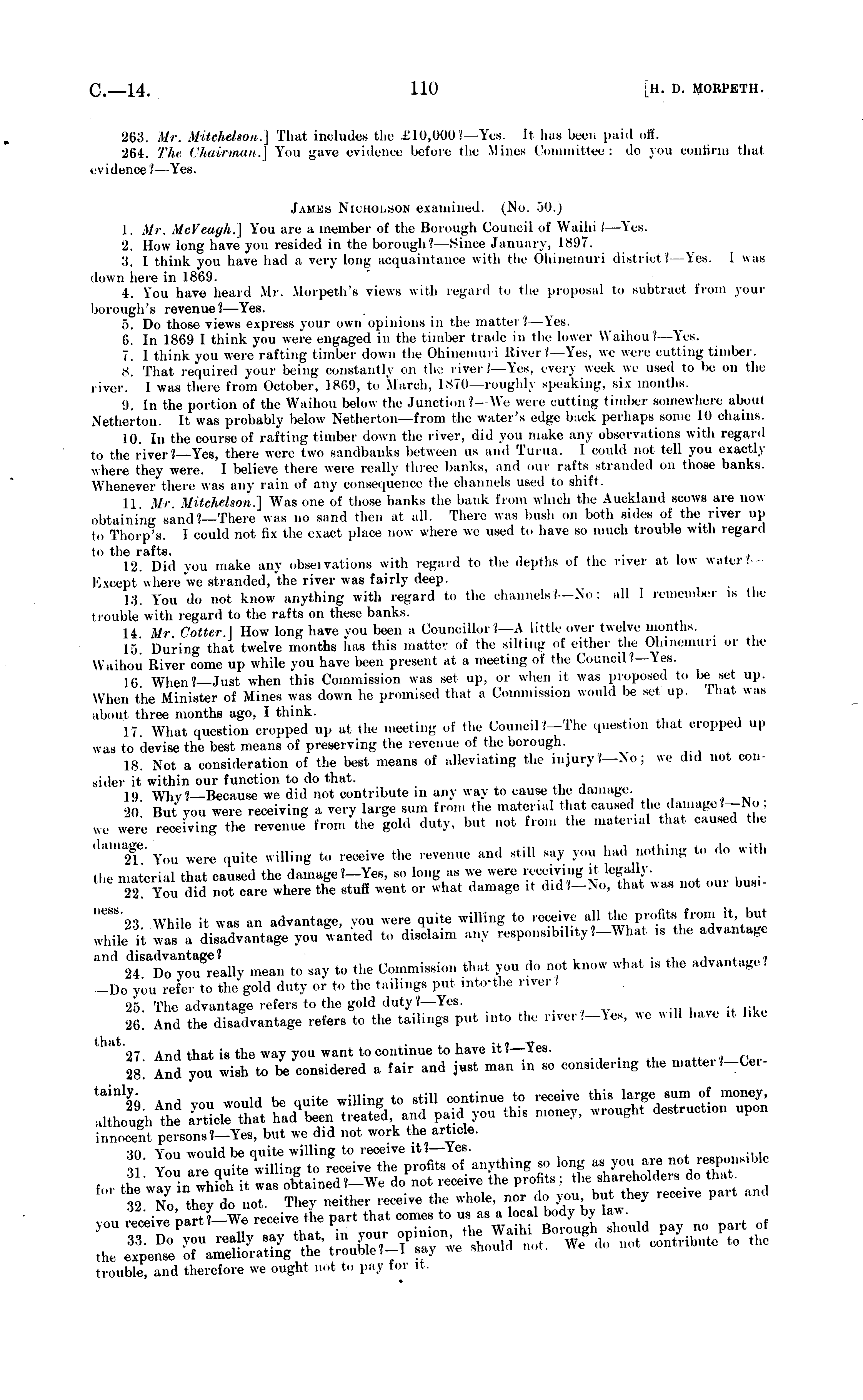 263, Mr. Mitchelson.] That includes the £10,000 1 —Yes. It has been paid off. 261. Tin Chairman.] You gave evidence before the Mines Committee: do you confirm that ,-\ idonce?—Yes. Jamks NicHoi.isos examined. (No. 50. ) 1. Mr. MeVeagh.] You are a member of the Borough Council of Waihi I—Yes. 2. How long have you resided in the borough?— Since January, 1897. 3. 1 think you have had a very long acquaintance with the Ohinemuri district?— Yes. 1 was down here in 1869. 4. You have heard Mr. Morpeth's views with regard to the proposal to subtract from your borough's revenue? —Yes. 5. Do those views express your own opinions in the matter?—^es. 6. In 1869 I think you were engaged in the timber trade in the lower Waihou .'--Yes. 7. I think you were rafting timber down the Ohinemuri River? —Yes, we were cutting timber. 8. That required your being constantly ,m the river? Yes, every week we used to be on the river. I was there from October, 1869, to 'March. 1870—roughly speaking, six months. 9. In the portion of the Waihou below the Junction I We wen- cutting timber somewhere about Netherton. It was probably below Netherton—from the water's edge back perhaps some Id chains. 10. In the course of rafting timber down the river, did you make any observations with regard to the river? —Yes, there were two sandbanks between us and Turua. I could not tell you exactly where they were. I believe there were really three banks, and our rafts stranded on those banks. Whenever there was any rain of any consequence the channels used to shift. 11. Mr. Mitchelson.] Was one of those banks the bank from which the Auckland scows are now obtaining sand?— There was no sand then at all. There was bush on both sides of the river up to Thorp's. I could not fix the exact place now where we used to have so much trouble with regard to the rafts. ~,,,• , , 12. Did you make any observations with regard to the depths ol the river at low water I Except where we stranded, the river was fairly deep. 13. You do not know anything with regard to the channels (—No ; all I remember is the trouble with regard to the rafts on these banks. 14 Mr Cotter J How long have you been a Councillor ?—A little over twelve months. 15' During that twelve months has this matte- of the silting of either the Ohinemuri or the Waihou River come up while you have been present at a meeting of the Council?— Yes. 16 When?— Just when this Commission was set up, or when it was proposed to be set up. When the Minister of Mines was down he promised that a Commission would be set up. lhat was about three months ago, I think. 17. What question cropped up at the meeting of the Council?—The question thai copped up was to devise the best means of preserving the revenue of the borough. 18. Not a consideration of the best means of alleviating the injury?—No; we did not consider it within our function to do that. |<l Whv?—Because we did not contribute 111 any way to cause the damage. 2b' But you were receiving a very large sum from the material that caused the damage?—No; we were receiving the revenue from the gold duty, but not from the material tha, caused the ''"'"af You were quite willing to receive the revenue and still say you had nothing to do with the material that caused the damage (-Yes, so long as we were receiving it legally. 22. You did not care where the stuff went or what damage 1. did?— No* that was not OUI bus, " eSS '23 While it was an advantage, you were quite willing to receive all the profits from it but whilst was a disadvantage you wanted to disclaim any responsibilityt-What is the advantage Tt & yTrLy mean to say to the Commission that you do not know what is the advantage I —Do you refer to the gold duty or to the tailings put into-the river . 25. The advantage refers to the gold duty?— Yes. 26. And the disadvantage refers to the tailings put into the river?-Yes, we will have ,t l-kc ' 27. And that is the way you want to continue to have it?— Yes. 28 And you wish to be considered a fair and just man in so considering the matte, I-Cer-:i!g„r arts =:. SjKSirs! innocent persons?— Yes, but we did not work the article. SO You would be quite willing to receive it? —Yes. ,l' You willing to receive the profits of anything so long as you are not responsible for in 4ich it was obtained?-We do not receive the profits; the shareholders do tha . 32 No they do not. They neither receive the whole, nor do you but they receive part and ;™ ™,M We receive the part that comes to us as a local body by law. trouble, and therefore we ought not to pay for it-