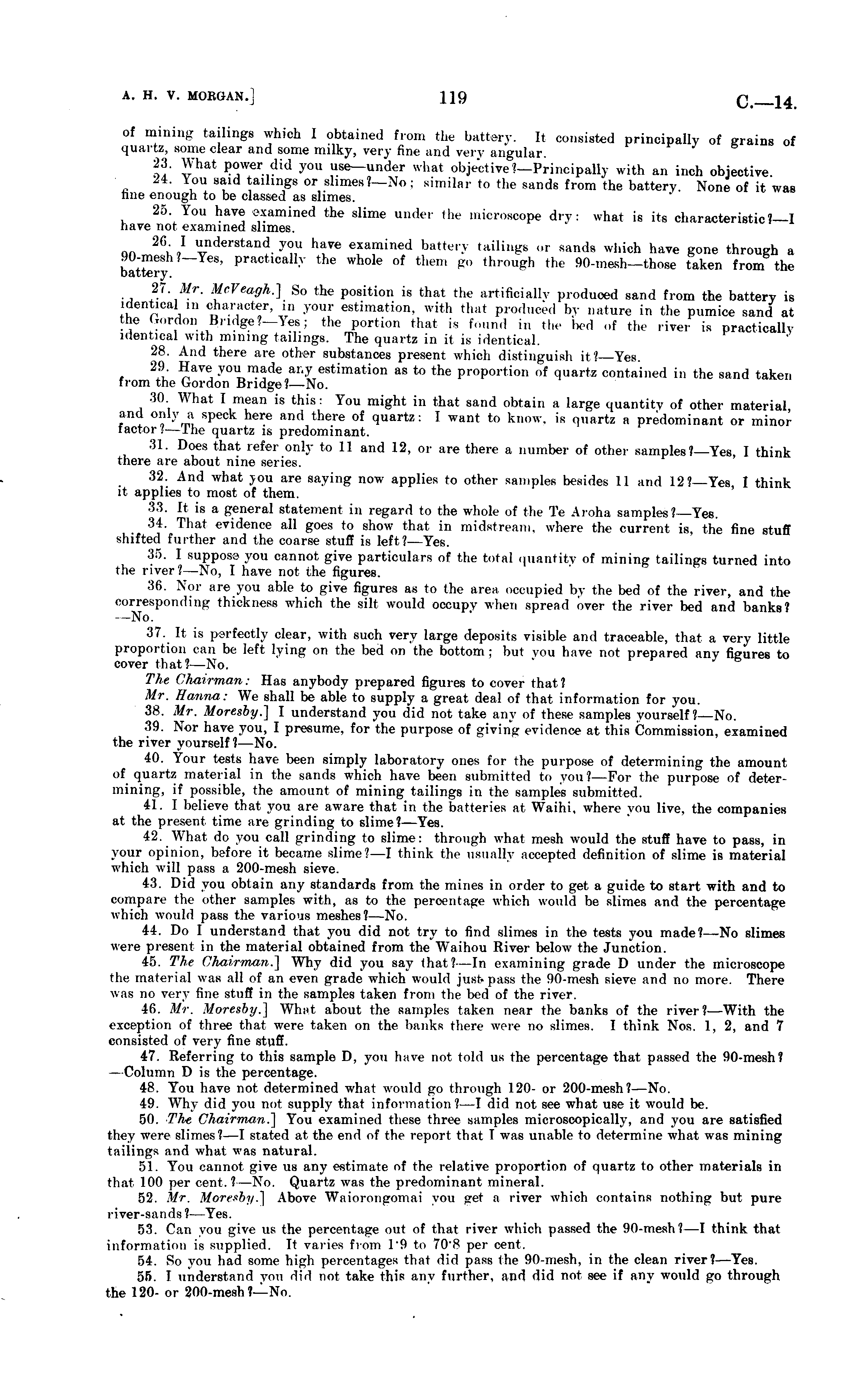 of mining tailings which I obtained from the battery. It consisted principally of grains of quartz, some clear and some milky, very fine and very angular. " 23. What power did you use—under what objective?— Principally with an inch objective 24. You said tailings or slimes?—No; similar to the sands from the battery. None of it was hue enough to be classed as slimes. 25 You have examined the slime under the microscope dry: what is its characteristic?—l have not examined slimes. on 26 e, l " nderstand you hay « examined battery tailings or sands which have gone through a 90-mesh ?—Yes, practically the whole of then, go through the 90-mesh—those taken from the battery. 27. Mr. MeVeagh.] So the position is that the artificially produced sand from the battery is identical in character, in your estimation, with that produced by nature in the pumice sand at the Gordon Bridge?—Yesj the portion that is found in the bed of the river is practically identical with mining tailings. The quartz in it is identical. 28. And there are other substances present which distinguish it?— Yes. 29 Have you made any estimation as to the proportion of quartz contained in the sand taken from the Gordon Bridge?— No. 30 What I mean is this: You might in that sand obtain a large quantity of other material and only a speck here and there of quartz: I want to know, is quartz a predominant or minor factor;—the quartz is predominant. 31. Does that refer only to 11 and 12, or are there a number of other samples ?—Yes, I think there are about nine series. 32. And what you are saying now applies to other samples besides 11 and 12?— Yes, I think it applies to most of them. 33. It is a general statement in regard to the whole of the Te Aroha samples?— Yes. 34. That evidence all goes to show that in midstream, where the current is, the fine stuff shifted further and the coarse stuff is left? —Yes. 35. I suppose you cannot give particulars of the total quantity of mining tailings turned into the river?—No, I have not the figures. 36. Nor are you able to give figures as to the area occupied by the bed of the river, and the corresponding thickness which the silt would occupy when spread over the river bed and banks? —No. 37. It is perfectly clear, with such very large deposits visible and traceable, that a very little proportion can be left lying on the bed on the bottom ; but you have not prepared any figures to cover that?— No. The Chairman: Has anybody prepared figures to cover that? Mr. Hanna: We shall be able to supply a great deal of that information for you. 38. Mr. Moresby.] I understand you did not take any of these samples yourself?— No. 39. Nor have you, I presume, for the purpose of giving evidence at this Commission, examined the river yourself?— No. 40. Your tests have been simply laboratory ones for the purpose of determining the amount of quartz material in the sands which have been submitted to you?— For the purpose of determining, if possible, the amount of mining tailings in the samples submitted. 41. I believe that you are aware that in the batteries at Waihi, where you live, the companies at the present time are grinding to slime?— Yes. 42. What do you call grinding to slime: through what mesh would the stuff have to pass, in your opinion, before it became slime?—l think the usually accepted definition of slime is material which will pass a 200-mesh sieve. 43. Did you obtain any standards from the mines in order to get a guide to start with and to compare the other samples with, as to the percentage which would be slimes and the percentage which would pass the various meshes?— No. 44. Do I understand that you did not try to find slimes in the tests you made?—No slimes were present in the material obtained from the Waihou River below the Junction. 45. The Chairman.] Why did you say that?—ln examining grade D under the microscope the material was all of an even grade which would just- pass the 90-mesh sieve and no more. There was no very fine stuff in the samples taken from the bed of the river. 46. Mr. Moresby.] What about the samples taken near the banks of the river?— With the exception of three that were taken on the banks there were no slimes. I think Nos. 1, 2, and 7 consisted of very fine stuff--47. Referring to this sample D, you have not told us the percentage that passed the 90-mesh? —Column D is the percentage. 48. You have not determined what would go through 120- or 200-mesh?—No. 49. Why did you not supply that information?—l did not see what use it would be. 50. The Chairman.] You examined these three samples microscopically, and you are satisfied they were slimes? —I stated at the end of the report that I was unable to determine what was mining tailings and what was natural. 51. You cannot give us any estimate of the relative proportion of quartz to other materials in that 100 per cent. ?—No. Quartz was the predominant mineral. 52. Mr. Moresby.] Above Waiorongomai you get a river which contains nothing but pure river-sands? —Yes. 53. Can you give us the percentage out of that river which passed the 90-mesh?—l think that information is supplied. It varies from I' 9 to 708 per cent. 54. So you had some high percentages that did pass Ihe 90-mesh, in the clean river? —Yes. 55. T understand yon did not take this any ftirther, and did not see if any would go through the 120- or 200-mesh ?—No.