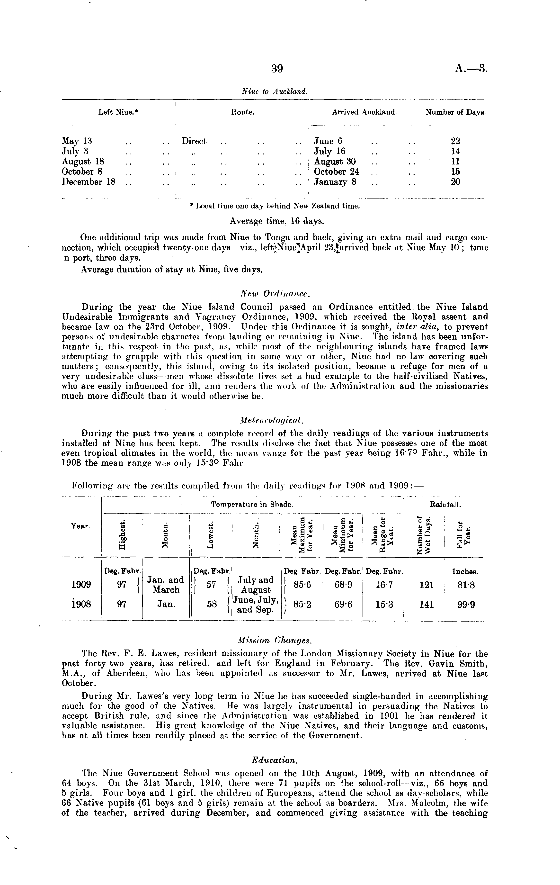 Left Niue.* Route. Arrived Auckland. .Number of Days. _ j May 13 July 3 August 18 October 8 December 18 .. .. Direct .. .. .. June 6 .. 22 .. July 16 14 .. August 30 11 .. I October 24 15 .. January 8 .. .. 20 i * IxKial time one day behind New Zealand time.