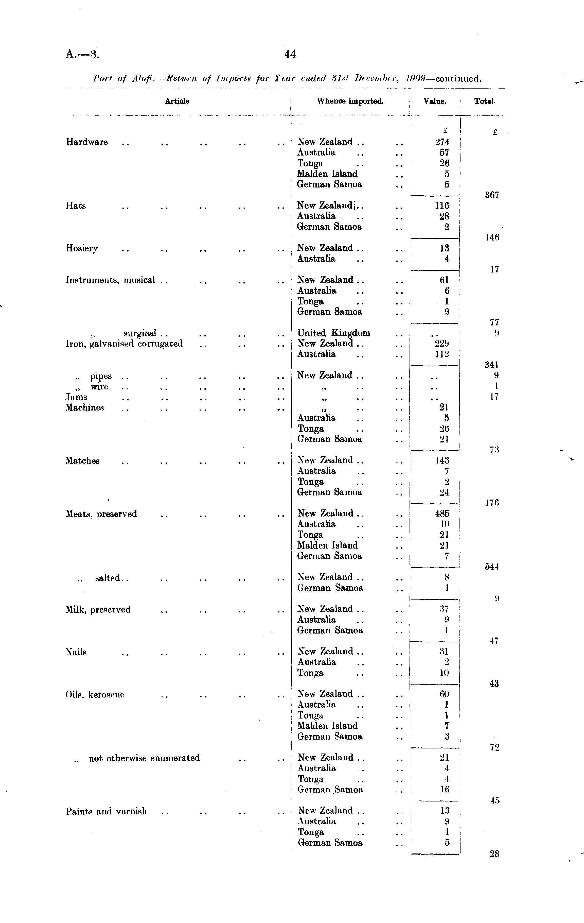 Article Whenoe imported. Value. Total Hardware New Zealand .. Australia Tonga Maiden Island German Samoa £ 274 57 26 5 5 £ 367 Hats New Zealand;.. Australia German Samoa 116 28 2 Hosiery New Zealand .. Australia 13 4 146 13 4 17 Instruments, musical New Zealand .. Australia Tonga German Samoa 61 6 1 .. I 9 77 surgical Iron, galvanised corrugated United, Kingdom New Zealand .. Australia 229 112 '.) pipes . . ,, wire Jn ms Machines New Zealand .. ■ »» • • ,, .. Australia Tonga German Samoa .'. 21 5 26 .. I 21 341 9 I 17 73 Matches New Zealand .. Australia Tonga German Samoa 143 7 2 21 176 Meats, preserved New Zealand .. Australia Tonga Maiden Island German Samoa 485 10 21 21 7 544 ,, salted.. New Zealand .. German Samoa 8 1 9 Milk, preserved New Zealand .. Australia German Samoa 37 9 1 47 Nails New Zealand .. Australia Tonga 31 2 10 43 Oils, kerosene New Zealand .. Australia j Tongs , Maiden Island i German Samoa 60 1 1 7 3 72 „ not otherwise enumerated New Zealand . . Australia Tonga German Samoa 21 4 4 16 45 Paints and varnish New Zealand .. Australia Tonga German Samoa 13 9 1 5 28