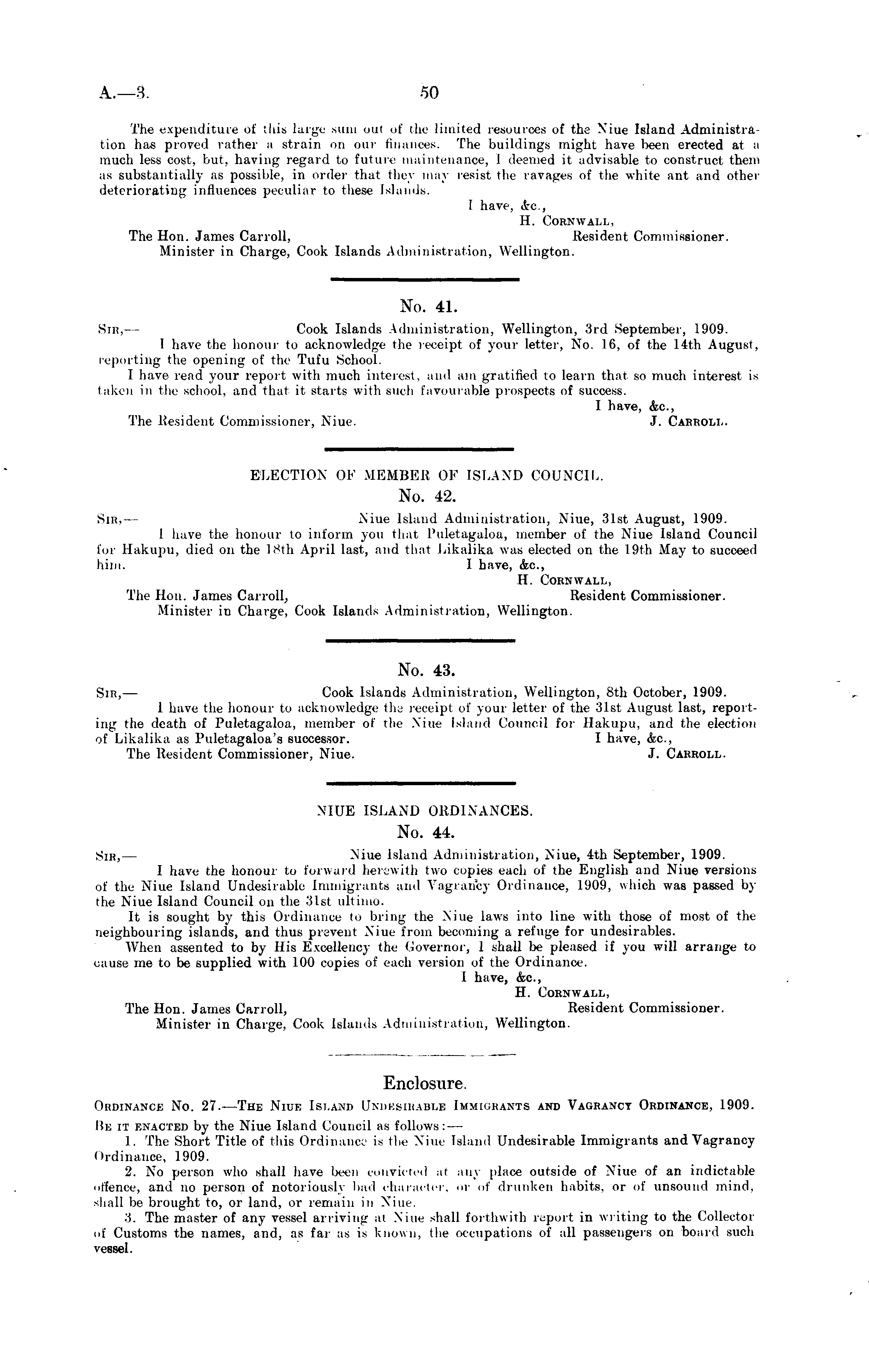 NIUE ISLAND ORDINANCES. No. 44. Sir, — Niue island Administration, Niue, 4th September, 1909. I have the honour to forward herewith two copies each of the English and Niue versions of the Niue Island Undesirable Immigrants and Vagrancy Ordinance, 1909, which was passed by the Niue Island Council on the 31st ultimo. It is sought by this Ordinance to bring the Niue laws into line with those of most of the neighbouring islands, and thus prevent Niue from becoming a refuge for undesirables. When assented to by His Excellency the Governor, 1 shall be pleased if you will arrange to cause me to be supplied with 100 copies of each version of the Ordinance. I have, &c, H. Cornwall, The Hon. James Carroll, Resident Commissioner. Minister in Charge, Cook Islands Administration, Wellington.