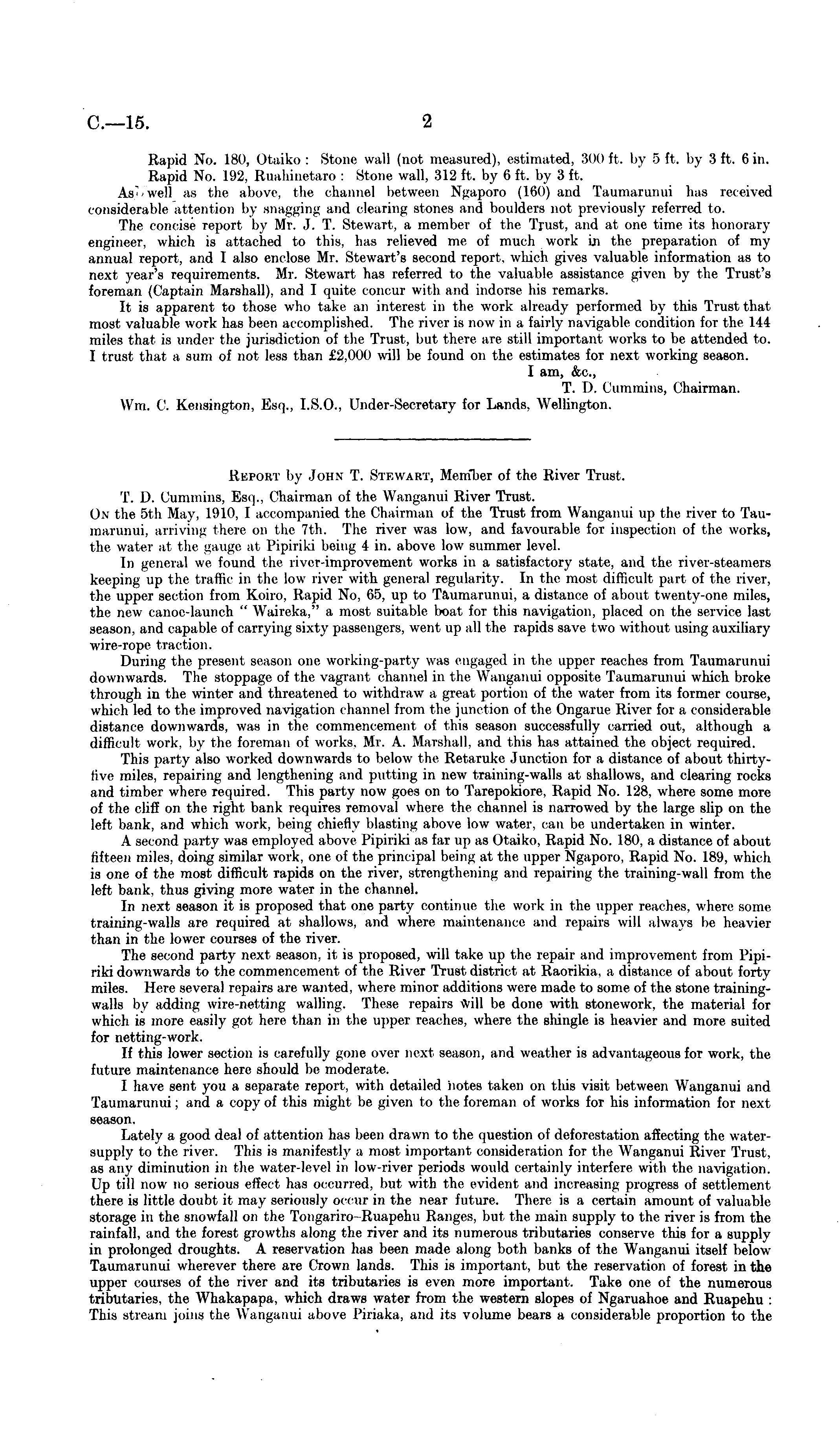 Rapid No. 18<>, Otaiko : Stone wall (not measured), estimated, 300 ft. by 5 ft. by 8 ft. 6 in. Rapid No. 192, Ruahinetaro : Stone wall, 312 ft. by 6 ft. by 3 ft. As-well as the above, the channel between Ngaporo (Hi ,, ) and Tamnarunui lias received considerable attention by snagging and clearing stones and boulders not previously referred to. The concise report by Mr. .). T. Stewart, a member of the Trust, and at one time its honorary engineer, which is attached to this, has relieved me of much work in the preparation of my annual report, and I also enclose Mr. Stewart's second report, which gives valuable information as to next year's requirements. Mr. Stewart has referred to the valuable assistance given by the Trust's foreman (Captain Marshall), and I quite concur will) and indorse his remarks. It is apparent to those who take an interest in the work already performed by this Trust that most valuable work has been accomplished. The river is now in a fairly navigable condition for the 144 miles that is under the jurisdiction of the Trust, but there are still important works to be attended to. I trust that a sum of not less than £2,000 will be found on the estimates for next working season. I am, &c, T. D. Cummins, Chairman. Win. ('. Kensington, Esq., 1.5.0., Under-Secretary for Lands. Wellington.