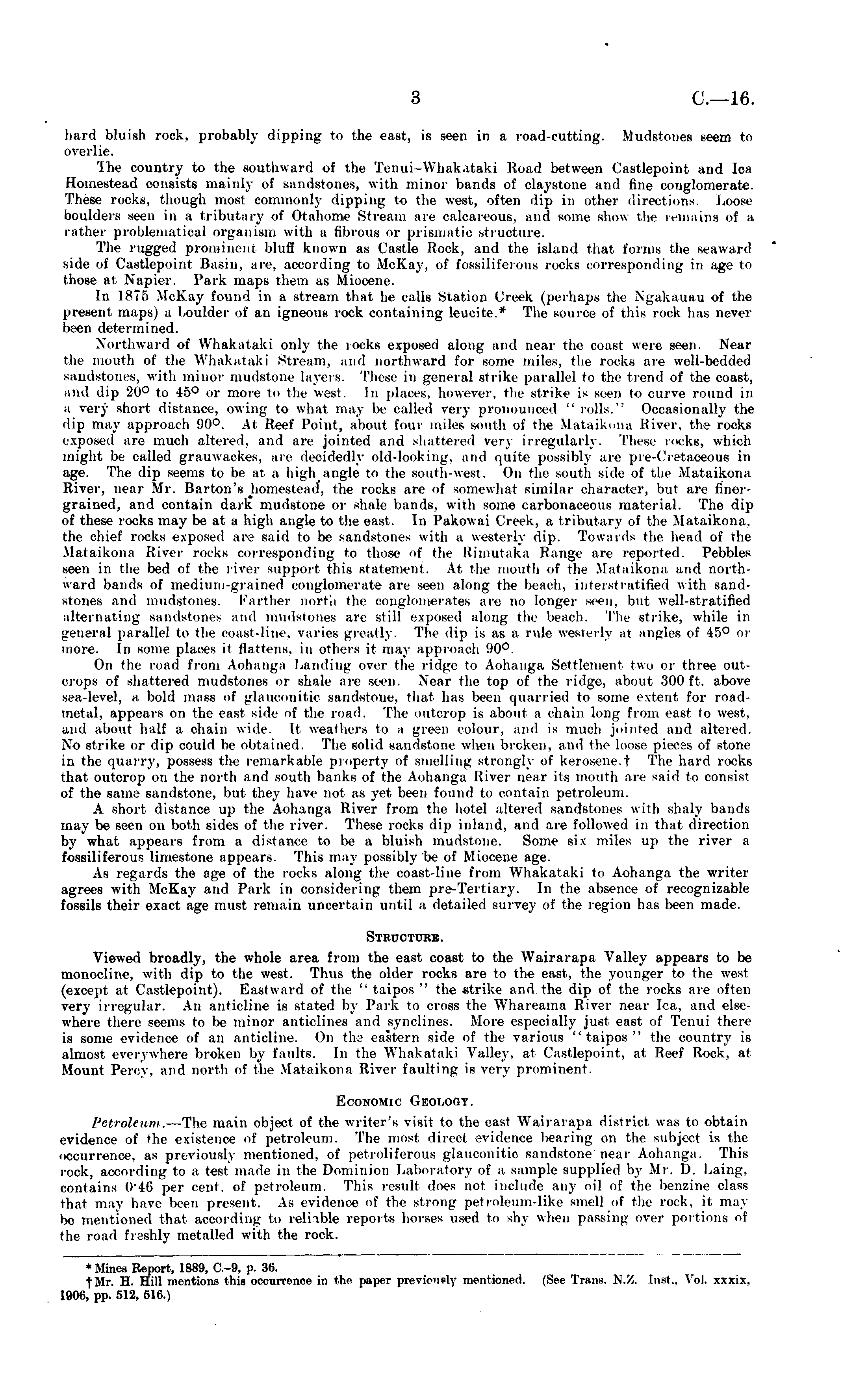 hard bluish rock, probably dipping to the east, is seen in a road-cutting. Mudstones seem to overlie. lhe country to the southward of the Tenui—Whakataki Road between Castlepoint and lea Homestead consists mainly of sandstones, with minor bands of claystone and fine conglomerate. These rocks, though most commonly dipping to the west, often dip in other directions. Loose boulders seen in a tributary of Otahome Stream are calcareous, and some show the remains of a lather problematical organism with a fibrous or prismatic structure. The rugged prominent bluff known as Castle Hock, and the island that forms the seaward side of Castlepoint Basin, arc according to McKay, of fossiliferous rocks corresponding in age to those at Napier. Park maps them as Miocene. In 1875 McKay found in a stream that he calls Station Creek (perhaps the Ngakauau of the present maps) a boulder of an igneous rock containing leucite.* The source of this rock has never been determined. Northward of Whakataki only the i ocks exposed along and near the coast were seen. Near the mouth of the Whakataki Stream, and northward for some miles, the rocks are well-bedded sandstones, with minor mudstone layers. These in general etrike parallel to the trend of the coast, and dip 20° to 45° or more to the west. In places, however, the strike is seen to curve round in a very short distance, owing to what may be called very pronounced " rolls.' . Occasionally the dip may approach 90°. At Reef Point, about four miles south of the Mataikona River, the rocks exposed are much altered, and are jointed and shattered very irregularly. These rocks, which might be called grauwackes, are decidedly old-looking, and i|uite possibly are pre-Cretaoeoue in age. The dip seems to be at a high angle to the south-west. On the south side of the Mataikona River, near Mr. Barton's homestead, the rocks are of somewhat similar character, but are finergrained, and contain dark mudstone or shale bands, with some carbonaceous material. The dip of these rocks may be at a high angle to the east. In Pakowai Creek, a tributary of the Mataikona. the chief rocks exposed are said to be sandstones with a westerly dip. Towards the head of the Mataikona River rocks corresponding to those of the Rimutaka Range are reported. Pebbles seen in the bed of the river support this statement. At the mouth of the Mataikona and northward bands of medium-grained conglomerate are seen along the beach, interstratified with sandstones and mudstones. Farther north the conglomerates are no longer seen, but well-stratified alternating sandstones and mudstones are still exposed along the beach. The strike, while in general parallel to the ooast-line, varies greatly. The dip is as a rule westerly at angles of 45° or more. In some places it flattens, in others it may approach 1)0°. On the road from Aohanga Landing over the ridge to Aohanga Settlement two or three outcrops of shattered mudstones or shale are seen. Near the top of the ridge, about 300 ft. above sea-level, a bold mass of glauconitic sand+itoue, that lias been quarried to some extent for roadmetal, appears on the east side of the road. The outcrop is about a chain long from east to west, and about half a chain wide. It weathers to a green colour, and is much jointed and altered. No strike or dip could be obtained. The solid sandstone when broken, and the loose pieces of stone in the quarry, possess the remarkable property of smelling strongly <>f kerosene, t The hard rocks that outcrop on the north and south banks of the Aohanga River near its mouth are said to consist of the same sandstone, but the} - have not as yet been found to contain petroleum. A short distance up the Aohanga River from the hotel altered sandstones with shaly bands may be seen on both sides of the river. These rocks dip inland, and are followed in that direction by what appears from a distance to be a bluish mudstone. Some six miles up the river a fossiliferous limestone appears. This may possibly be of Miocene age. As regards the age of the rocks along the coast-line from Whakataki to Aohanga the writer agrees with McKay and Park in considering them pre-Tertiary. In the absence of recognizable fossils their exact age must remain uncertain until a detailed survey of the region has been made. Structure. Viewed broadly, the whole area from the east coast to the Wairarapa Valley appears to be monocline, with dip to the west. Thus the older rocks are to the east, the younger to the west (except at Castlepoint). Eastward of the " taipos " the -strike and the dip of the rocks are often very irregular. An anticline is stated by Park to cross the Whareama River near lea, and elsewhere there seems to be minor anticlines and synclines. More especially just east of Tenui there is some evidence of an anticline. On the eastern side of the various "taipos " the country is almost everywhere broken by faults. In the Whakataki Valley, at Castlepoint, at Reef Rock, at Mount Percy, and north of the Mataikona River faulting is very prominent. Economic Geology. Petroleum. —The main object of the writer's visit to the east Wairarapa district was to obtain evidence of the existence of petroleum. The most direct evidence bearing on the subject is the occurrence, as previously mentioned, of petroliferous glauconitic sandstone near Aohanga. This rock, according to a test made in the Dominion Laboratory of a sample supplied by Mr. D. Laing, contains ()'4(! per cent, of petroleum. This result does not include any oil of the benzine class that may have been present. As evidence of the strong petroleum-like smell of the rock, it may be mentioned that according In reliable reports horses used to shy when passing over portions of the road freshly metalled with the rock.