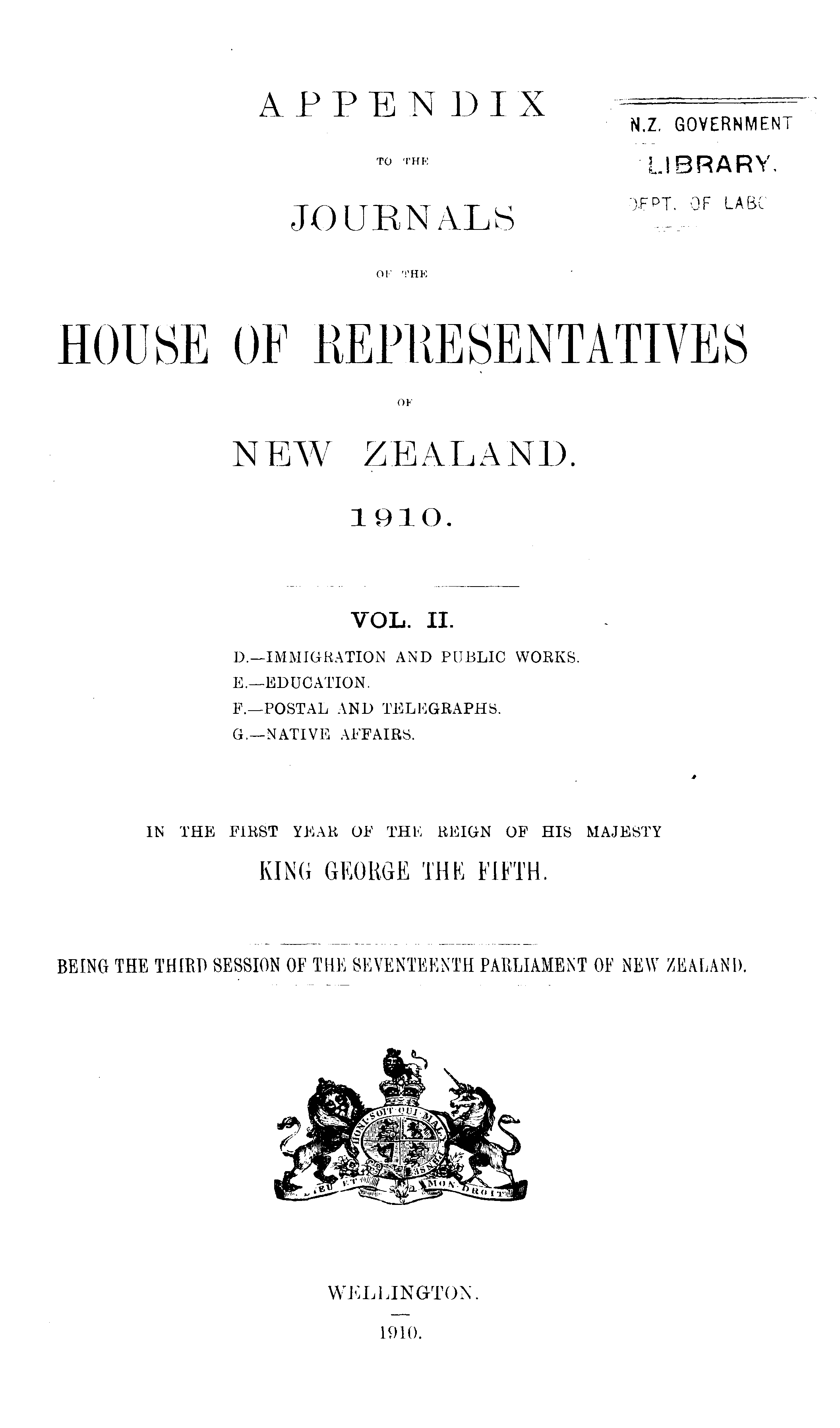 VOL. 11. D.—IMMIGRATION AND PUBLIC WOKKS. E.—EDUCATION. F.—POSTAL AND TELEGBAPHS. G.—NATIVE AFFAIRS. * IN THE FiKST YEAR OF THE REIGN OF HIS MAJESTY KING GEORGE THE FIFTH.