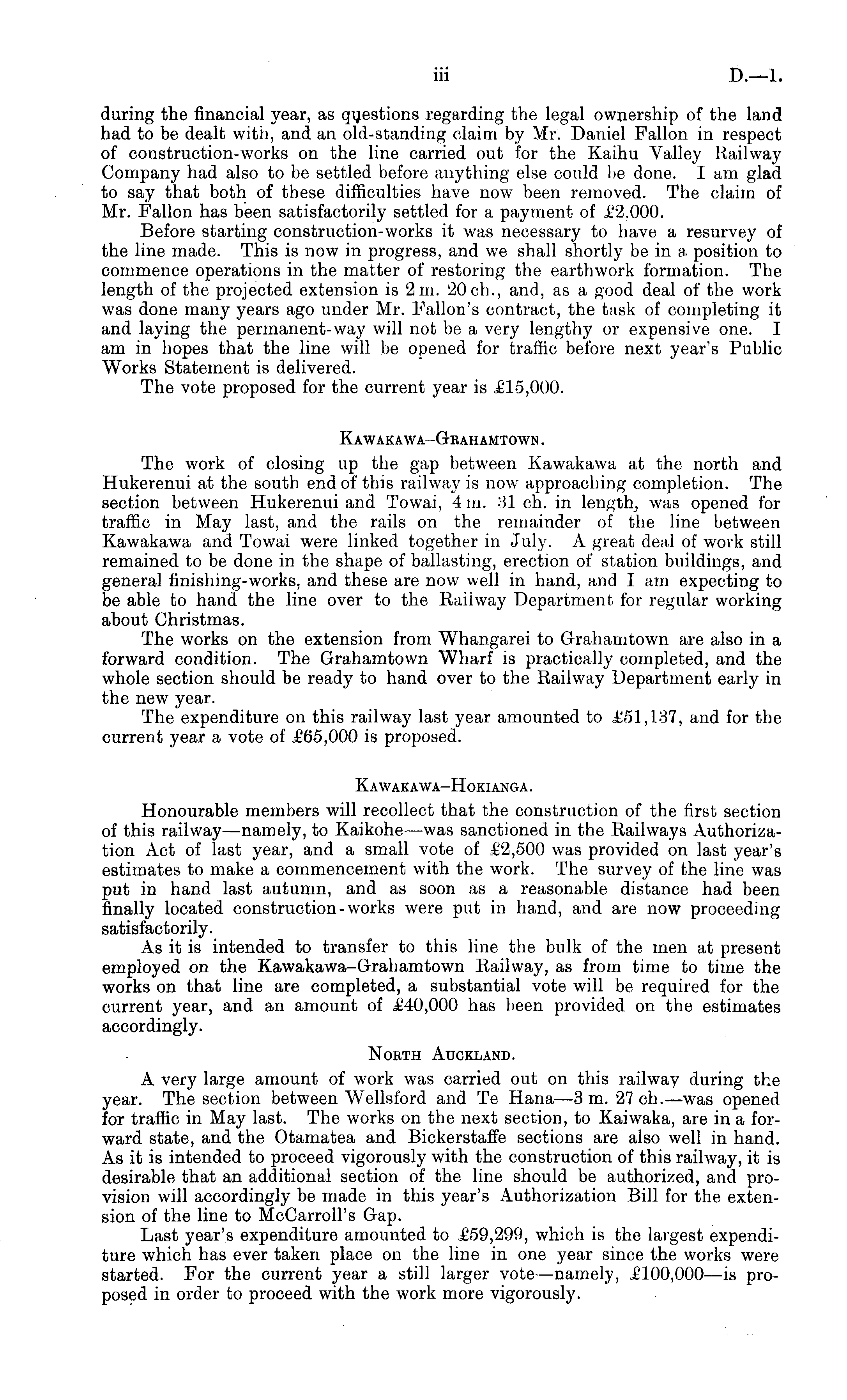 during the financial year, as questions regarding the legal ownership of the land had to be dealt with, and an old-standing claim by Mr. Daniel Fallon in respect of construction-works on the line carried out for the Kaihu Valley Railway Company had also to be settled before anything else could be done. lam glad to say that both of these difficulties have now been removed. The claim of Mr. Fallon has been satisfactorily settled for a payment of £2.000. Before starting construction-works it was necessary to have a resurvey of the line made. This is now in progress, and we shall shortly be in a position to commence operations in the matter of restoring the earthwork formation. The length of the projected extension is 2m. 20 eh., and, as a good deal of the work was done many years ago under Mr. Fallon's contract, the task of completing it and laying the permanent-way will not be a very lengthy or expensive one. I am in hopes that the line will be opened for traffic before next year's Public Works Statement is delivered. The vote proposed for the current year is £15,000. Kawakawa-Grahamtown . The work of closing up the gap between Kawakawa at the north and Hukerenui at the south end of this railway is now approaching completion. The section between Hukerenui and Towai, 4m. 31 eh. in length, was opened for traffic in May last, and the rails on the remainder of the line between Kawakawa and Towai were linked together in July. A great deal of work still remained to be done in the shape of ballasting, erection of station buildings, and general finishing-works, and these are now well in hand, and I am expecting to be able to hand the line over to the Railway Department for regular working about Christmas. The works on the extension from Whangarei to Grahamtown are also in a forward condition. The Grahamtown Wharf is practically completed, and the whole section should be ready to hand over to the Railway Department early in the new year. The expenditure on this railway last year amounted to £51,137, and for the current year a vote of £65,000 is proposed. Kawakawa-Hokianga. Honourable members will recollect that the construction of the first section of this railway—namely, to Kaikohe—was sanctioned in the Railways Authorization Act of last year, and a small vote of £2,500 was provided on last year's estimates to make a commencement with the work. The survey of the line was put in hand last autumn, and as soon as a reasonable distance had been finally located construction - works were put in hand, and are now proceeding satisfactorily. As it is intended to transfer to this line the bulk of the men at present employed on the Kawakawa-Grahamtown Railway, as from time to time the works on that line are completed, a substantial vote will be required for the current year, and an amount of £40,000 has been provided on the estimates accordingly. North Auckland. A very large amount of work was carried out on this railway during the year. The section between Wellsford and Te Hana—3 m. 27 eh.—was opened for traffic in May last. The works on the next section, to Kaiwaka, are in a forward state, and the Otamatea and Bickerstaffe sections are also well in hand. As it is intended to proceed vigorously with the construction of this railway, it is desirable that an additional section of the line should be authorized, and provision will accordingly be made in this year's Authorization Bill for the extension of the line to McCarroll's Gap. Last year's expenditure amounted to £59,299, which is the largest expenditure which has ever taken place on the line in one year since the works were started. For the current year a still larger vote —namely, £100,000 —is proposed in order to proceed with the work more vigorously.