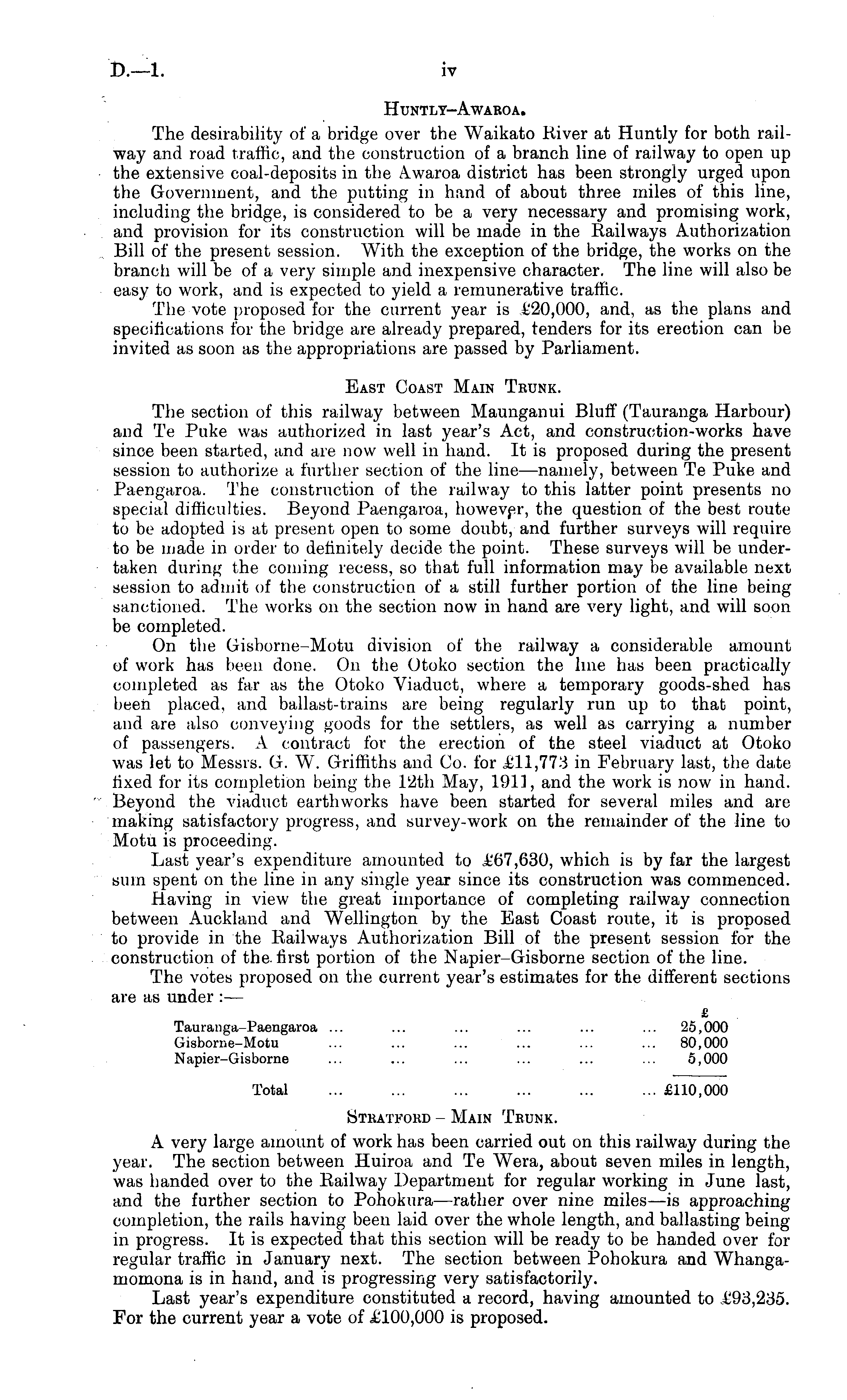 HUNTLY-AWAROA. The desirability of a bridge over the Waikato River at Huntly for both railway and road traffic, and the construction of a branch line of railway to open up the extensive coal-deposits in the Awaroa district has been strongly urged upon the Government, and the putting in hand of about three miles of this line, including the bridge, is considered to be a very necessary and promising work, and provision for its construction will be made in the Railways Authorization Bill of the present session. With the exception of the bridge, the works on the branch will be of a very simple and inexpensive character. The line will also be easy to work, and is expected to yield a remunerative traffic. The vote proposed for the current year is £20,000, and, as the plans and specifications for the bridge are already prepared, tenders for its erection can be invited as soon as the appropriations are passed by Parliament. East Coast Main Trunk. The section of this railway between Maunganui Bluff (Tauranga Harbour) and Te Puke was authorized in last year's Act, and construction-works have since been started, and are now well in hand. It is proposed during the present session to authorize a further section of the line—namely, between Te Puke and Paengaroa. The construction of the railway to this latter point presents no special difficulties. Beyond Paengaroa, however, the question of the best route to be adopted is at present open to some doubt, and further surveys will require to be made in order to definitely decide the point. These surveys will be undertaken during the coining recess, so that full information may be available next session to admit of the construction of a still further portion of the line being sanctioned. The works on the section now in hand are very light, and will soon be completed. On the Gisborne Motu division of the railway a considerable amount of work has been done. On the Otoko section the line has been practically completed as far as the Otoko Viaduct, where a temporary goods-shed has been placed, and ballast-trains are being regularly run up to that point, and are also conveying goods for the settlers, as well as carrying a number of passengers. A contract for the erection of the steel viaduct at Otoko was let to Messrs. G. W. Griffiths and Co. for £11,773 in February last, the date fixed for its completion being the 12th May, 191], and the work is now in hand. Beyond the viaduct earthworks have been started for several miles and are making satisfactory progress, and survey-work on the remainder of the line to Motu is proceeding. Last year's expenditure amounted to £67,630, which is by far the largest sum spent on the line in any single year since its construction was commenced. Having in view the great importance of completing railway connection between Auckland and Wellington by the East Coast route, it is proposed to provide in the Railways Authorization Bill of the present session for the construction of the. first portion of the Napier-Gisborne section of the line. The votes proposed on the current year's estimates for the different sections are as under :— £ Tauranga-Paengaroa ... ... ... ... ... ... 25,000 Gisborne-Motu ... ... ... ... ... ... 80,000 Napier-Gisborne ... ... ... ... ... ... 5,000 Total £110,000 Stratford - Main Trunk. A very large amount of work has been carried out on this railway during the year. The section between Huiroa and Te Wera, about seven miles in length, was handed over to the Railway Department for regular working in June last, and the further section to Pohokura—rather over nine miles—is approaching completion, the rails having been laid over the whole length, and ballasting being in progress. It is expected that this section will be ready to be handed over for regular traffic in January next. The section between Pohokura and Whangamomona is in hand, and is progressing very satisfactorily. Last year's expenditure constituted a record, having amounted to £93,235. For the current year a vote of £100,000 is proposed.