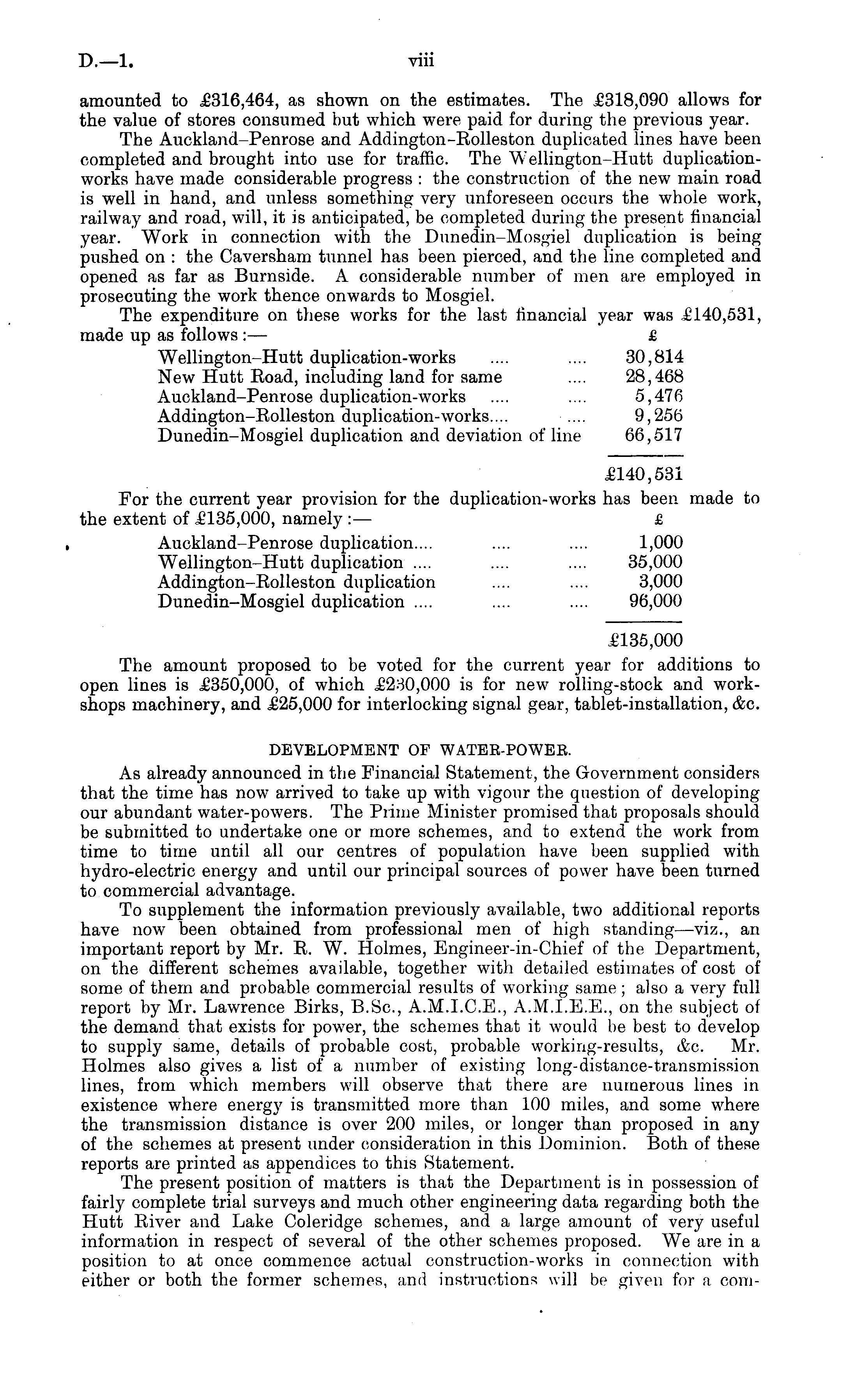 amounted to £316,464, as shown on the estimates. The £318,090 allows for the value of stores consumed but which were paid for during the previous year. The Auckland-Penrose and Addington-Eolleston duplicated lines have been completed and brought into use for traffic. The Wellington-Hutt duplicationworks have made considerable progress : the construction of the new main road is well in hand, and unless something very unforeseen occurs the whole work, railway and road, will, it is anticipated, be completed during the present financial year. Work in connection with the Dunedin-Mosgiel duplication is being pushed on : the Caversham tunnel has been pierced, and the line completed and opened as far as Burnside. A considerable number of men are employed in prosecuting the work thence onwards to Mosgiel. The expenditure on these works for the last financial year was £140,531, made up as follows : — £ Wellington-Hutt duplication-works .... .... 30,814 New Hutt Eoad, including land for same .... 28,468 Auckland-Penrose duplication-works .... .... 5,476 Addington-Kolleston duplication-works.... .... 9,256 Dunedin-Mosgiel duplication and deviation of line 66,517 £140,531 For the current year provision for the duplication-works has been made to the extent of £135,000, namely : — £ , Auckland-Penrose duplication.... .... .... 1,000 Wellington-Hutt duplication .... .... .... 35,000 Addington-Kolleston duplication .... .... 3,000 Dunedin-Mosgiel duplication .... .... .... 96,000 £135,000 The amount proposed to be voted for the current year for additions to open lines is £350,000, of which £230,000 is for new rolling-stock and workshops machinery, and £25,000 for interlocking signal gear, tablet-installation, &c. DEVELOPMENT OF WATER-POWER. As already announced in the Financial Statement, the Government considers that the time has now arrived to take up with vigour the question of developing our abundant water-powers. The Prime Minister promised that proposals should be submitted to undertake one or more schemes, and to extend the work from time to time until all our centres of population have been supplied with hydro-electric energy and until our principal sources of power have been turned to commercial advantage. To supplement the information previously available, two additional reports have now been obtained from professional men of high standing—viz., an important report by Mr. K. W. Holmes, Engineer-in-Chief of the Department, on the different schemes available, together with detailed estimates of cost of some of them and probable commercial results of working same; also a very full report by Mr. Lawrence Birks, B.Sc, A.M.1.C.E., A.M.1.E.E., on the subject of the demand that exists for power, the schemes that it would be best to develop to supply same, details of probable cost, probable working-results, &c. Mr. Holmes also gives a list of a number of existing long-distance-transmission lines, from which members will observe that there are numerous lines in existence where energy is transmitted more than 100 miles, and some where the transmission distance is over 200 miles, or longer than proposed in any of the schemes at present under consideration in this Dominion. Both of these reports are printed as appendices to this Statement. The present position of matters is that the Department is in possession of fairly complete trial surveys and much other engineering data regarding both the Hutt Kiver and Lake Coleridge schemes, and a large amount of very useful information in respect of several of the other schemes proposed. We are in a position to at once commence actual construction-works in connection with either or both the former schemes, and instructions will be given for a com-