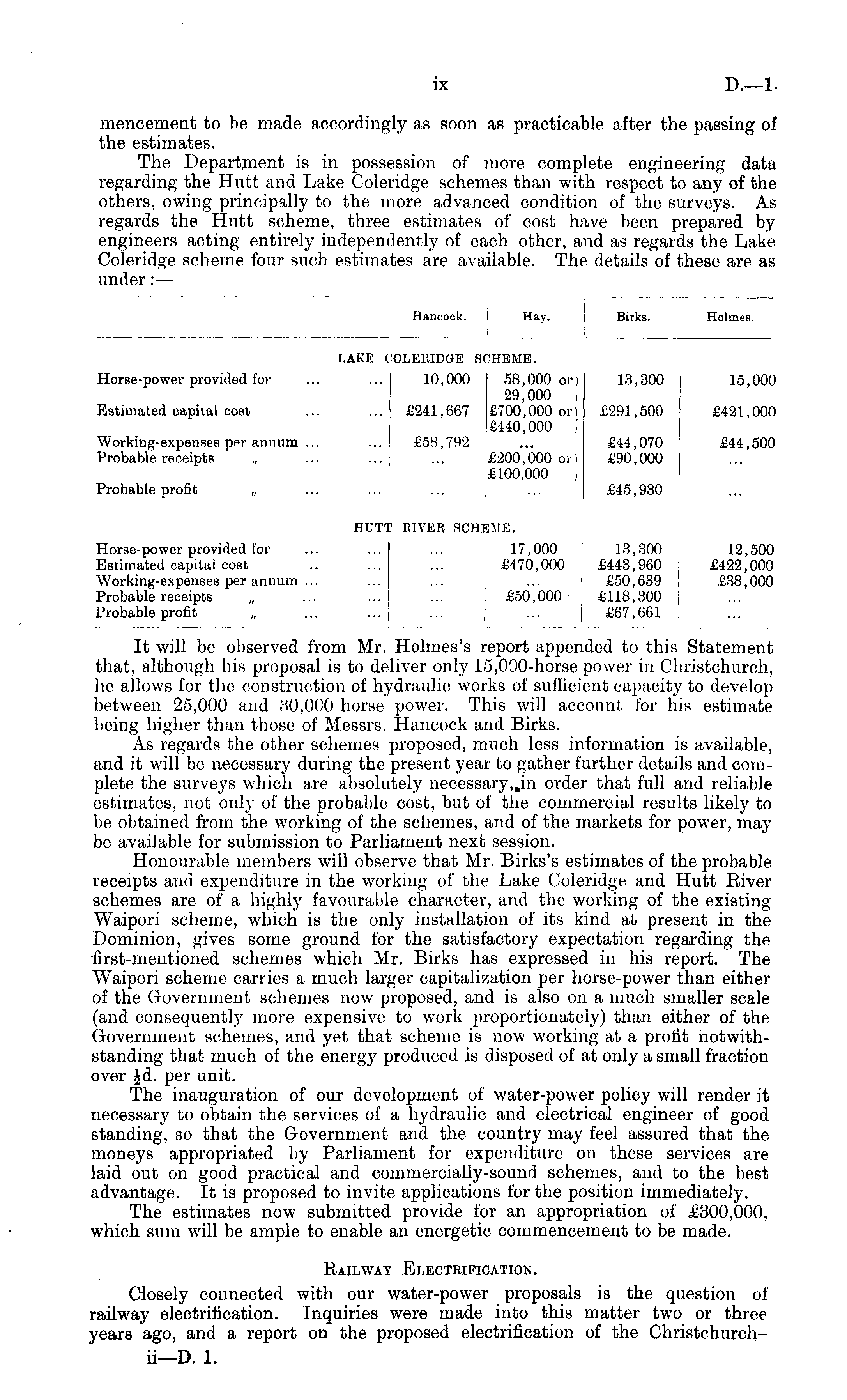 Hancock. Hay. Birks. Holmes. LAKE COLERIDGE SCHEME. Horse-power provided for Estimated capital cost Working-expenses per annum ... Probable receipts „ 10,000 58,000 on 29,000 i ... £241,667 £700,000 oil €440,000 | £58,792 £200,000 or) £100,000 I 13,300 £291,500 £44,070 £90,000 15,000 £421,000 £44,500 Probable profit „ .£45,9,30 HUTT RIVER SCHEME. Horse-power provided for Estimated capital cost Working-expenses per annum ... Probable receipts „ Probable profit „ 17,000 £470,000 £50,000 j 13,300 £443,960 £50,639 £118,300 £67,661 | 12,500 £422,000 £38,000