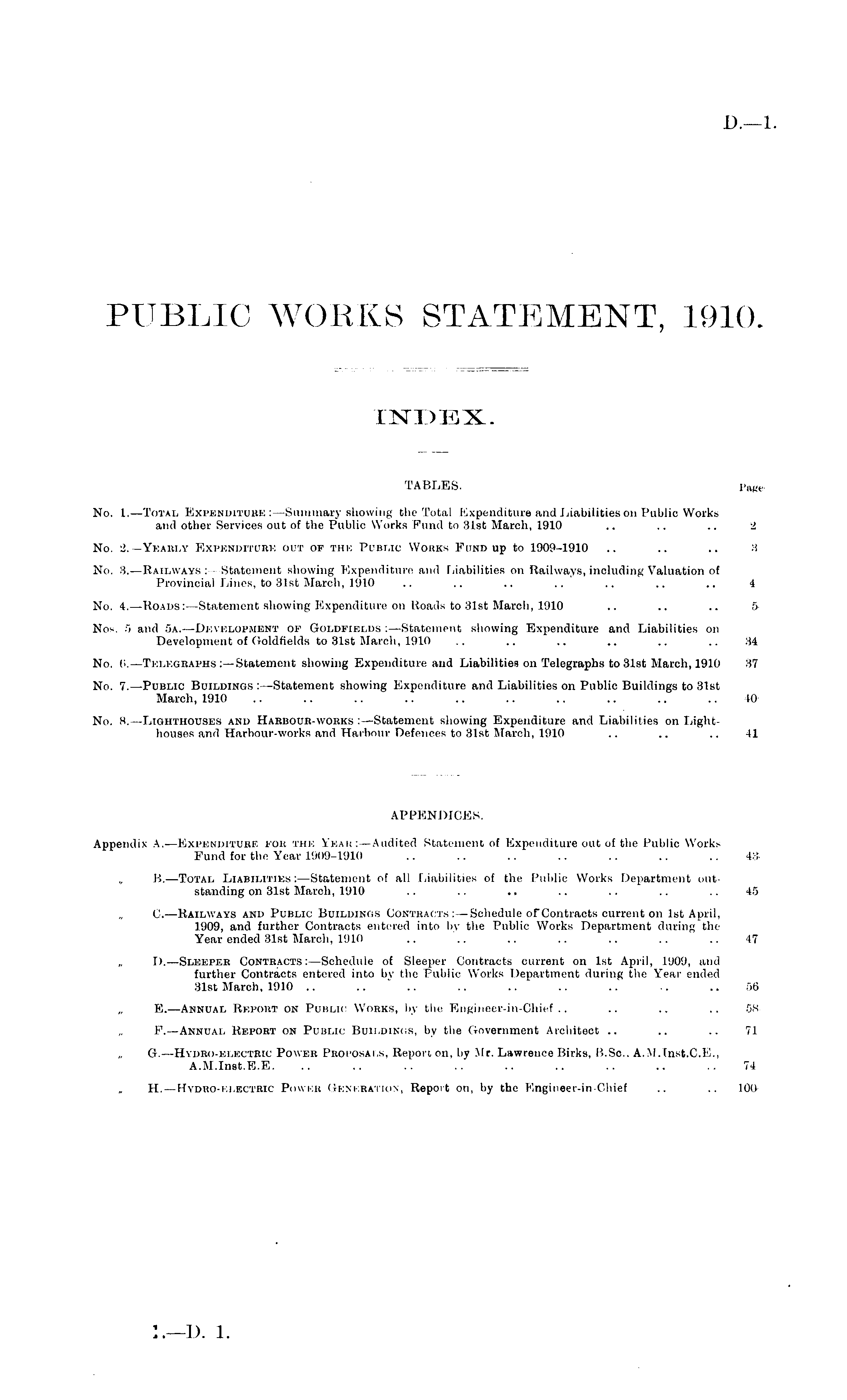 PUBLIC WORKS STATEMENT, 1910. INDEX. TABLES. i>^ No. I.—Total Expenditure :—Summary showing the Total Expenditure and Liabilities on Public Works and other Services out of the Public Works Fund to 81st March, 1910 .. .. .. 2 No. 2.—Yearly Expenditure out of the Public Wokks Fund up to 1909-1910 .. .. .. 8 No. 3.—Railways: Statement showing Expenditure and Liabilities on Railways, including Valuation of Provincial Lines, to 81st March, 1910 .. .. .. .. .. .. .. 4 No. 4.—Roads: —Statement showing Expenditure on lioads to 31st March, 1910 .. .. .. 5Nos. 5 and sa.—Development op Goldfields : —Statement showing Expenditure and Liabilities on Development of (loldfields to 31st March, 1910 .. .. .. .. .. .. 34 No. 6.—Telegraphs:—Statement showing Expenditure and Liabilities on Telegraphs to 31st March, 1910 37 No. 7. —Public Buildings:—Statement showing Expenditure and Liabilities on Public Buildings to 31st March, 1910 .. .. .. .. .. .. .. .. .. .. 40 No. H.—Lighthouses and Harbour-works : —Statement showing Expenditure and Liabilities on Lighthouses and Harbour-works and Harbour Defences to 31st March, 1910 .. .. .. 41 APPENDICES, Appendix A.—Expenditure eoic the Yew;:—Audited Statement of Expenditure out of the Public Works Fund for the Year 1909-1910 .. .. .. .. .. .. .. 18 B. —Total Liabilities : —Statement of all Inabilities of the Public Works Department outstanding on 31st March, 1910 .. .. .. .. .. .. .. 45 C.—Railways and Public Buildings Contracts: —Schedule ofContracts current on let April, 1909, and further Contracts entered into by the Public Works Department during the Year ended 31st March, 1!) in .. '.. .. .. .. .. .. 47 D. —Sleeper Contracts: —Schedule of Sleeper Contracts current on Ist April, 1909, and further Contracts entered into by the Public Works Department during the Year ended 31st March, 1910 .. .. .. .. .. .. .. .. .. 56 E.—Annual Report on Public Works, by the Engineer-in-Ohief .. .. .. .. 58 P. —Annual Report on Public Buildings, by the Government Architect .. .. .. 71 G. —Hydro-electric Power Proposals, Report on, by Mr. Lawreuce Birks, 8.50., A.M. tnst.C.E., A.M.Inat.E.E. .. .. .. .. .. .. .. .. .. 74 H. — Hydro-electric Poweb Generation, Report on, by the Engineer-in-Chief .. .. 100-