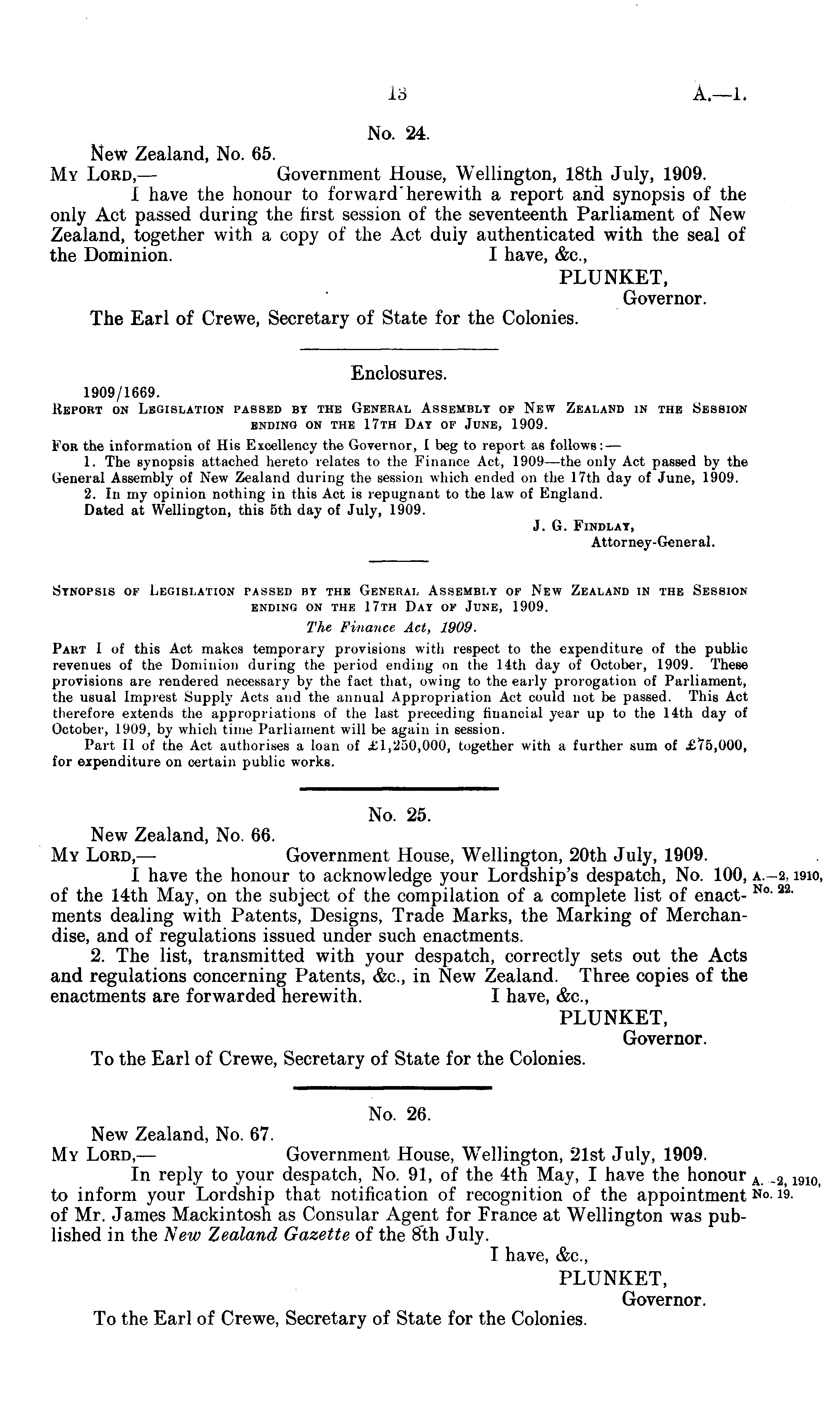 No. 24. New Zealand, No. 65. My Lord, — Government House, Wellington, 18th July, 1909. 1 have the honour to forward herewith a report and synopsis of the only Act passed during the first session of the seventeenth Parliament of New Zealand, together with a copy of the Act duly authenticated with the seal of the Dominion. I have, &c, PLUNKET, Governor. The Earl of Crewe, Secretary of State for the Colonies.