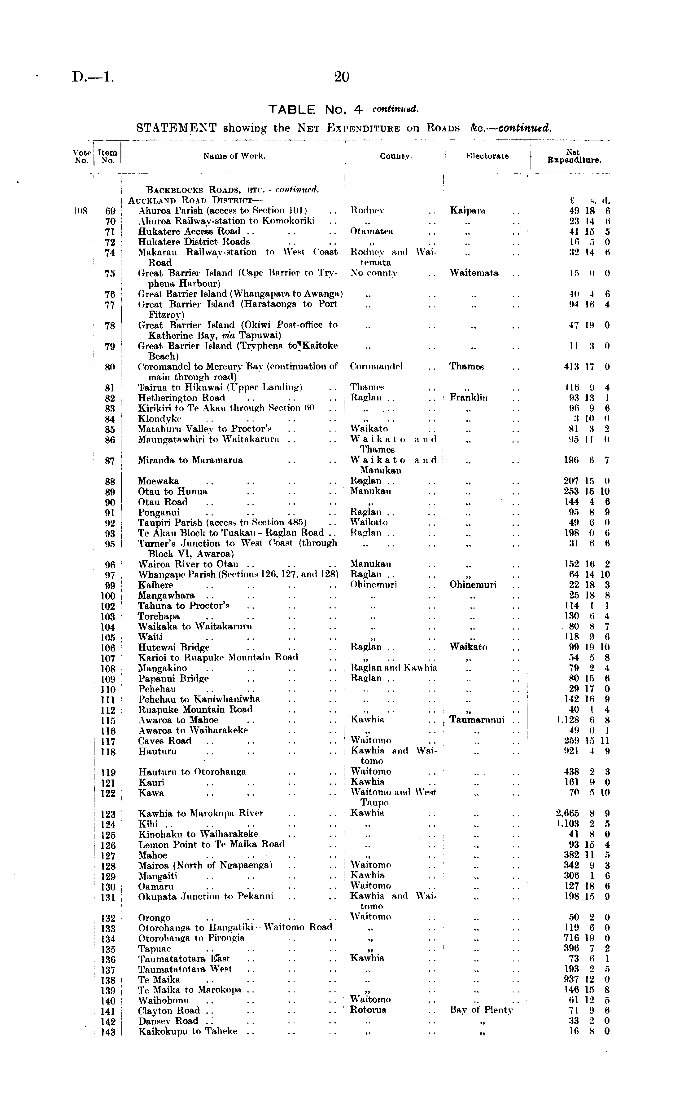 Vote Item No. No. IOS 69 70 71 72 71 75 76 77 „ 80 81 82 83 84 85 86 S7 88 89 90 91 92 93 96 96 97 99 100 102 103 104 106 106 107 108 109 110 111 112 115 116 117 118 119 121 122 123 124 125 126 127 128 129 130 131 132 133 134 135 136 137 1.38 139 140 141 j 142 | 143 ! Vote Item No. No. i Name of Work. County. Klectorate Expenditure '! ' Backblocks Roads, utc. continued. Auckland Road District — E s. d. Ahuroa Parish (access to Section 101) .. Rodney .. Kaipara .. 49 18 6 Ahuroa Railway-station to Komokoriki .. .. .. .. 23 14 6 Hukatere Access Road .. .. .. Otamatea .. .. .. 41 16 5 Hukatere District Roads .. .. .. .. .. 16 5 0 Makarau Railway-station to West Coast Rodney and Wai- .. .. 32 14 6 Road teniata Great Barrier Island (Cape Barrier to Try- \'o county .. Waitemata .. 15 (I 0 phena Harbour) (Iroat Barrier Tsland (Whangapara to Awanga) .. .. .. .. 10 I 6 Great Barrier Island (Harataonga to Port .. .. .. 91 16 4 Fitzroy) Creat Barrier Island (Okiwi Post-office to .. .. .. .. 47 19 0 Katherine Bay, via Tapuwai) Great Barrier Island (Tryphena .. .. .. 113 0 Beach) Coromandel to Mercury Bay (continuation of Coromandel .. Thames .. 413 17 0 main through road) Taints to Hikuwai (Upper Landing) .. Thames .. „ .. 116 9 4 Hetherington Road .. ..I Raglan .. Franklin .. 93 13 I Kirikiri to Te Akau through Section 60 ..I ..... .. .. .. 96 9 6 Klondyke .. .. .. .. .. .. 3 10 0 Matahuru Valley to Proctor's .. Waikato ., 81 3 2 Maungatawhiri to Waitakaruru .. ..[Waikato and .. .. 96 11 o 'Thames Miranda to Mara mama .. .. Waikato and .. .. 196 6 7 Manukau Moewaka .. Raglan . . .. 207 15 0 Otau to Hiinua .. .. Manukau .. .. 253 15 10 Otau Road .. .. .. .. .. ' .. 144 4 6 Ponganui .. . . .. .. Raglan .. .. .. . . 95 8 9 Taupiri Parish (access to Section 486) .. Waikato .. .. .. 19 6 o Te Akau Block to Tuakau -Raglan Road .. Raglan.. .. .. .. 198 0 6 'Turner's .Junction to West Coast (through .... .. .. .. 31 ti 6 Block VI, Awaroa) Wairoa River to Otau .. .. .. Manukau ,. .. 152 16 2 Whangape Parish (Sections 126,127, and 128) Raglan.. .. .. .. 64 14 10 Kaiherc .. .. .. Ohinemuri Ohinemuri .. 22 18 3 Mangawhara .. .. .. 25 18 8 Tahuna to Proctor's .. .. .. .. 114 1 1 Torehapa .. .. .. .. .. 130 6 4 Waikaka to Waitakaruru .. .. .. .. ,. .. 8(1 S 7 W'niti .. .. .. .. .. .. .. 118 9 6 Hutewai Bridge .. Raglan .. Waikato .. 99 19 10 Karioi to Ruapuke Mountain Road .. ,. .. .. 54 5 8 Mangakino .. .. .. .. , Raglan and Kawhia .. 79 2 4 Papanui Bridge .. .. .. Raglan .. .. .. so 15 6 Pehchau .. .. 29 17 0 Pehehau to Kaniwhaniwha .. .... .. 142 16 9 Ruapuke Mountain Road .. .... „ .. 4(1 I 4 Awaroa to Mahoe .. .. .. Kawhia Taumarunui .. 1.123 6 8 Awaroa to Waiharakeke .. . . , .. .. 19 0 1 Caves Road .. .. .. .. Waitomo .. .. 259 15 II Hauturu .. .. .. Kawhia and Wai- 921 4 9 tomo Hauturu to Otorohanga .. .. Waitomo .. 138 2 3 Kauri .. .. Kawhia 161 9 0 Kawa .. .. .. .. Waitomo and West .. 70 5 10 Taupo Kawhia to Marokopa River .. .. Kawhia .. 2,665 8 9 Kihi .. .. .. .. .. .. j .. 1.103 2 5 Kinohaku to Waiharakeke .. .. .. ., 41 8 0 Lemon Point to'Te Maika Road .. .. .. 93 15 4 Mahoe .. .... ., .. 382 11 5 Mairoa (North of Naapaenga) .. Waitomo .. 342 9 3 Mangaiti .. .. .. .. Kawhia .. 306 1 6 Oamaru .. .. .. .. Waitomo .. 127 18 6 Okupata Junction to Pekanui .. .. Kawhia and Wai- ,. .. 198 15 9 tomo Orongo .. .. .. .. Waitomo .. 50 2 0 Otorohanga to Hangatiki Waitomo Roa.l „ .. .. .. 119 6 0 Otorohanga to Pirongia .. .. „ .. .. 716 19 0 Tapuae .. .. .. .. „ .. 396 7 2 'Taumatatotara East .. .. .. Kawhia .. .. 73 6 I Taumatatotara West .. .. .. .. 193 2 5 Te Maika .. .. .. 937 12 0 'Te Maika to Marokopa .. .. .. „ .. .. 146 15 8 Waihohonu .. .. .. Waitomo .. 61 12 5 Clayton Road .. .. .. Rotorua .. Bay of Plentv 71 9 6 Dansev Road .. .. .. .. .. ,. 33 2 0 Kaikokupu to Taheke .. .. .. „ „ 16 s 0