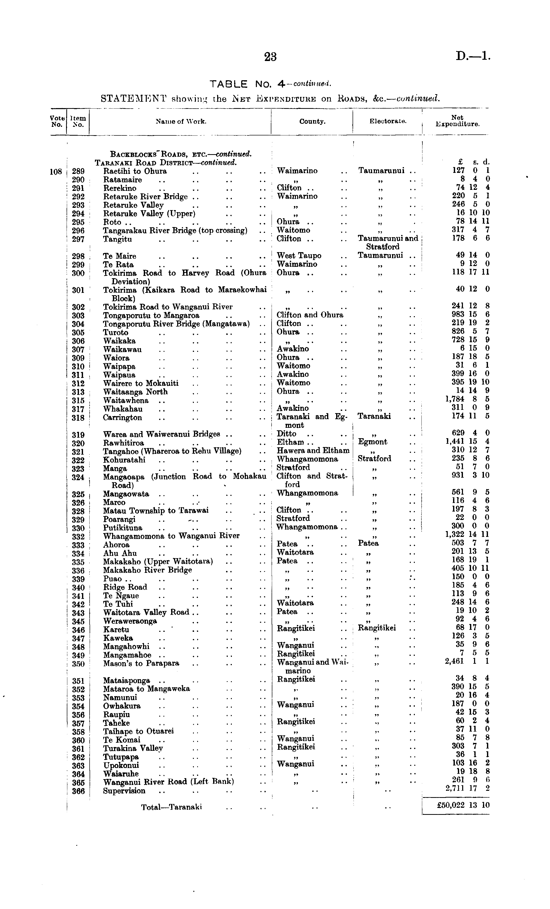 Vote No. Item No. Item No. Name of Work. County. Electorate. County. Net Expenditure. 08 289 290 291 292 293 294 295 296 297 298 299 300 301 302 303 304 305 306 307 309 310 311 312 313 315 317 : 318 319 320 321 322 323 324 . 325 326 328 329 330 332 333 334 335 336 339 340 341 I 342 ! 343 345 346 347 348 349 3.50 351 352 353 354 356 357 358 360 361 362 363 364 365 366 Backblocks" Roads, etc. — continued. Taranaki Road District — continued. Raetihi to Ohura .. .. Waimarino .. Taumarunui .. Ratamaire .. .. .. .. „ .. „ Rerekino .. .. .. .. Clifton .. .. „ Retaruke River Bridge .. .. .. Waimarino .. „ Retaruke Valley .. .. .. „ .. „ Retaruke Valley (Upper) .. .. „ .. „ Roto .. .. .. .. .. j Ohura .. .. „ Tangarakau River Bridge (top crossing) .. Waitomo .. „ Tangitu .. .. .. .. Clifton .. .. Taumarunui and Stratford Te Maire .. .. .. .. West Taupo .. Taumarunui .. Te Rata .. .. .. .. Waimarino .. „ Tokirima Road to Harvey Road (Ohura Ohura .. .. „ Deviation) Tokirima (Kaikara Road to Maraekowhai „ .. .. „ Block) Tokirima Road to Wanganui River .. „ .. .. „ Tongaporutu to Mangaroa .. .. Clifton and Ohura „ 'Tongaporutu River Bridge (Mangatawa) .. Clifton .. .. „ Turoto .. .. .. .. Ohura .. .. „ Waikaka .. .. .. .. „ .. .. ,, Waikawau .. . . .. Awakino .. „ Waiora .. .. .. .. Ohura .. .. „ Waipapa .. .. .. .. Waitomo .. ,, Waipaua .. .. Awakino .. „ Wairere to Mokauiti Waitomo .. „ Waitaanga North .. .. Ohura .. .. „ Waitawhena .. .. .. .. I ,, .. .. ,, Whakahau .. .. .. Awakino .. „ Carrington .. .. .. Taranaki and Eg- Taranaki .. > mont Warea and Waiweranui Bridges .. .. Ditto .. .. „ Rawhitiroa .. .. .. .. Eltham .. Egmont Tangahoe (Whareroa to Rehu Village) .. Hawera and Eltham „ Kohuratahi .. .. .. .. Whangamomona Stratford Manga .. .. .. .. I Stratford . . „ Mangaoapa (Junction Road to Mohakau Clifton and Strat- „ Road) • ford Mangaowata .. .. .. Whangamomona „ Marco ..- • . „ >> Matau Township to Tarawai .. .. Clifton .. .. „ Poarangi .. -.. .. Stratford .. „ Putikituna .. .. .. Whangamomona . . „ Whangamomona to Wanganui River .. I „ .. „ Ahoroa .. .. .. .. Patea .. .. Patea Ahu Ahu .. .. .. .. Waitotara .. „ Makakaho (Upper Waitotara) .. .. Patea .. „ Makakaho River Bridge .. .. I „ .. „ Puao .. .. .. .. » • • • • » Ridge Road .. .. .. .. „ .. • ■ „ Te Ngaue .. .. .. .. „ • • • • » Te Tuhi .. .. .. .. Waitotara .. „ Waitotara Valley Road .. .. .. Patea Weraweraonga .. .. .. „ ■ • • • „ Karetu .. ' .. • • • • Rangitikei .. Rangitikei Kaweka .. .. • • • • „ „ Mangahowhi .. .. .. .. Wanganui Mangamahoe .. •. .. • • Rangitikei „ Mason's to Parapara .. .. .. Wanganui and Wai- „ marino Mataiaponga .. .. .. .. Rangitikei Mataroa to Mangaweka .. .. ,, „ Namunui .. . . • • • • ,. » Owhakura .. .. .. Wanganui Raupiu .. • • ■ • „ • • n Taheke .. . • • • • • Rangitikei Taihape to Otuarei .. .. .. „ Te Komai .. .. .. Wanganui Turakina Valley .. Rangitikei Tutupapa .. • ■ . • „ • • •< Upokonui .. . • • • Wanganui Waiaruhe .. .. „ • • >■ Wanganui River Road (Left Bank) .. „ „ Supervision £ s. d. 127 0 1 8 4 0 74 12 4 220 5 1 246 5 0 16 10 10 78 14 11 317 4 7 178 6 6 49 14 0 9 12 0 118 17 11 40 12 0 241 12 8 983 15 6 219 19 2 826 5 7 728 15 9 6 15 0 187 18 6 31 6 1 399 16 0 395 19 10 14 14 9 1,784 8 5 311 0 9 174 11 5 629 4 0 1,441 15 4 310 12 7 235 8 6 51 7 0 931 3 10 561 9 5 116 4 6 197 8 3 22 0 0 300 0 0 1,322 14 11 503 7 7 201 13 5 168 19 1 405 10 11 150 0 0 185 4 6 113 9 6 248 14 6 19 10 2 92 4 6 68 17 0 126 3 5 35 9 6 7 5 6 2,461 1 1 34 8 4 390 15 5 20 16 4 187 0 0 42 15 3 60 2 4 37 11 0 85 7 8 303 7 1 36 1 1 103 16 2 19 18 8 261 9 6 2,711 17 2 'Total—'Taranaki £50,022 13 10