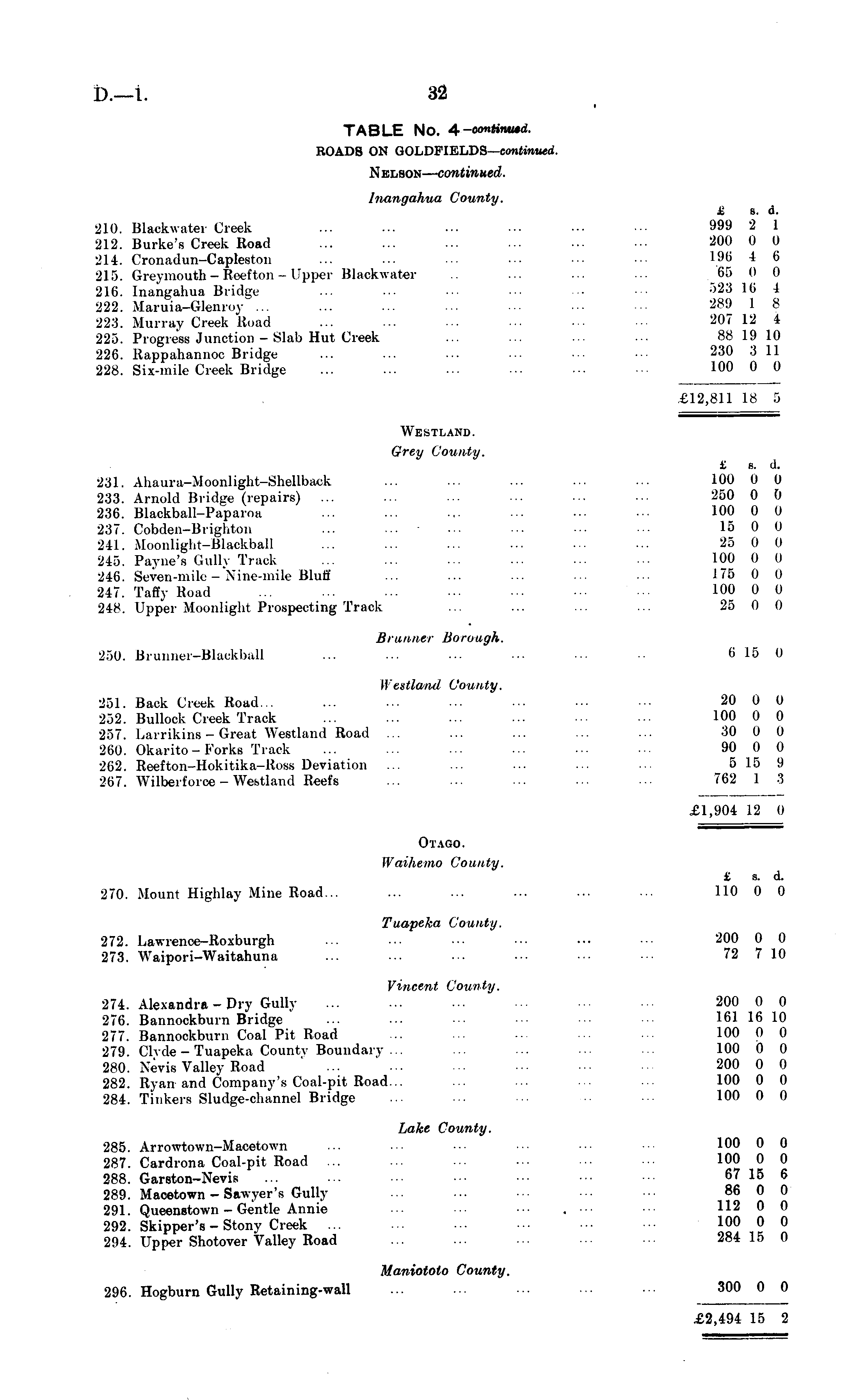 TABLE NO. 4 -continued. ROADS ON GOLDFlELDS— continued. Nelson— continued. hiangahua County. £, s. d. ■210. Blackwater Creek ... ... ... ••■ ■•■ ••• 999 2 1 212. Burkes Creek Road ... ... ... ... ••■ ••• 200 0 0 214. Cronndun-Capleston ... ... ... ... ... ... 190 4 6 215. Grcymouth - Reefton - Upper Blackwater .. ... ... ... 66 0 0 216. Inangahna Bridge ' ... ■•• •■■ ■■■ ■•■ •■■ :,2;5 1G 4 222. Maruia-Glenroy ... ... ... ... ... ... ... 289 1 8 223. Murray Creek Road •■■ ••• ■•• ■•• •■• ••■ 207 12 4 225. Progress Junction - Slab Hut Creek ... ... ... ... 88 19 10 226. Rappahaniioc Bridge ... ... ... ... ■■- •■■ 230 3 11 228. Six-mile Creek Bridge ... ... ... ■•• ■•■ 100 0 0 £12,811 18 5 Westland. Grey County. i. s. d. 231. Ahaura-Moonlight-Shellbaok ... ... ... ... ... 100 0 0 233. Arnold Bridge (repairs) ... ... ■■■ ■•• ■ •• •■■ 250 0 0 236. Blackball-Paparoa ... ... ... ... ••• ••• 100 0 0 237. Cobden-Brighton ... ... ■•■ ... ••• ••• 15 0 0 241. Moonlight-Blackball ... ... ... ... ... ... 25 0 0 245. Payne's Gully Track ... ... ... ... ... ... 100 0 0 246. Seven-mile - Nine-mile Bluff ... ... ... ... ... 175 0 0 247. Taffy Road ... ... ... ... •■• ■■■ 100 0 0 248. Upper Moonlight Prospecting Track ... ... ... ... 25 0 0 Brainier Borough. 250. Brunner-Blaokball ... ... ... ■•• ... •• 6 15 0 Westland County. 251. Back Creek Road... ... ... ... •■• ••• ••• 20 0 0 252. Bullock Creek Track ... ... ... ... ■■ ■•■ 100 0 0 257. Larrikins - Great Westland Road ... ... ... ... ... 30 0 0 260. Okarito-Forks Track ... ... ... •■■ •■■ ••■ 90 0 0 262. Reefton-Hokitika-Ross Deviation ... ... ... ... ■ ■■ 5 15 9 267. Wilberforce - Westland Reefs ... ... ... •■• ■•■ 762 1 3 £1,904 12 0 Otago. Waihemo County. £ s. d. 270. Mount Highlay Mine Road... ... ... ... ... ... 110 0 0 Tuapeka County. 272. Lawrence-Roxburgh ... •■■ ■•■ ••• ••• ••■ 200 0 0 273. Waipori-Waitahuna ... ... ... ••• ■■• ••■ 72 7 10 Vincent County. 274. Alexandra - Dry Gully ... ... ■■• ■■ 200 0 0 276. Bannockburn Bridge ... ... ■ ■ •■■ 161 16 10 277. Bannockburn Coal Pit Road ... ... ■■■ ... 100 0 0 279. Clyde-Tuapeka County Boundary ... ... ... ... 100 0 0 280. Nevis Valley Road ... ... ... ■•• 200 0 0 282. Ryan and Company's Coal-pit Road... ... ... ... 100 0 0 284. Tinkers Sludge-channel Bridge ... ... ••■ •■• 100 0 0 Lake County. 285. Arrowtown-Macetown ... ■•■ ■■■ •■■ •■■ 100 0 0 287. Cardrona Coal-pit Road ... ... ... ■■• ■■■ ■■ 100 0 0 288. Garston-Nevis ... ... ••• ••• ••• •■• •■■ 67 15 6 289. Macetown - Sawyer's Gully ... • • ■•■ 86 0 0 291. Queenstown - Gentle Annie ■■■ ■■■ ••• . •■■ •■■ 112 0 0 292. Skippers-Stony Creek ... •■• ••• ••• ••• 100 0 0 294. Upper Shotover Valley Road ... ... •■■ ••• ••• 284 15 0 Maniotolo County. 296. Hogburn Gully Retaining-wall ... ... ■ • ••• ■■■ 300 0 0 £2,494 15 2