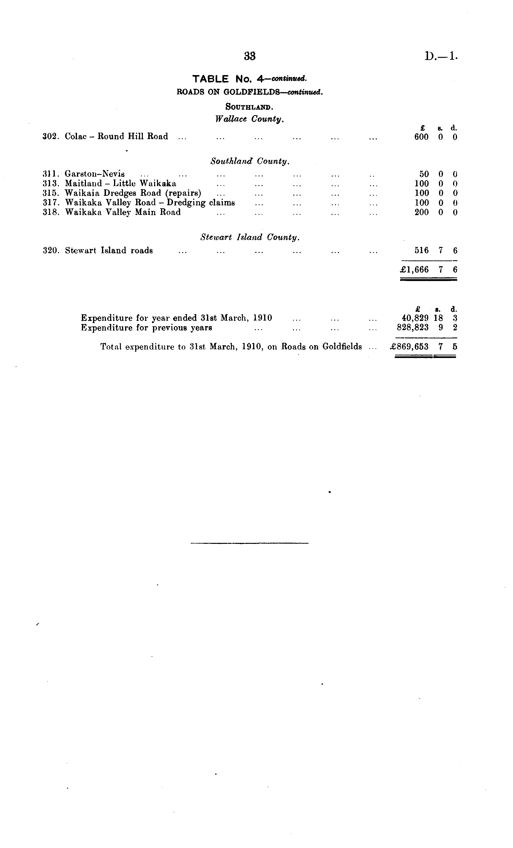 TABLE No. A — continued. ROADS ON GOLDPlBLDS— continued. Southland. Wallace County. £ s. d. 302. Colac - Round Hill Road ... ... ... ... ... ... 600 0 0 Southland County. 311. Gareton-Nevis ... ... ... ... ... ... .. .30 0 0 313. Maitland - Little Waikaka ... ... ... ... ... 100 0 0 315. Waikaia Dredges Road (repairs) ... ... ... ... ... 100 0 0 317. Waikaka Valley Road - Dredging claims ... ... ... ... 100 0 0 318. Waikaka Valley Main Road ... ... ... ... ... 200 0 0 Stewart Island County. 320. Stewart Island roads ... ... ... ... ... ... 516 7 6 £1,666 7 6 £ b. d. Expenditure for year ended 31st March, 1910 ... ... ... 40,829 18 3 Expenditure for previous years ... ... ... ... 828,823 9 2 Total expenditure to 31st March, 1910, on Roads on Goldfields ... £869,653 7 5