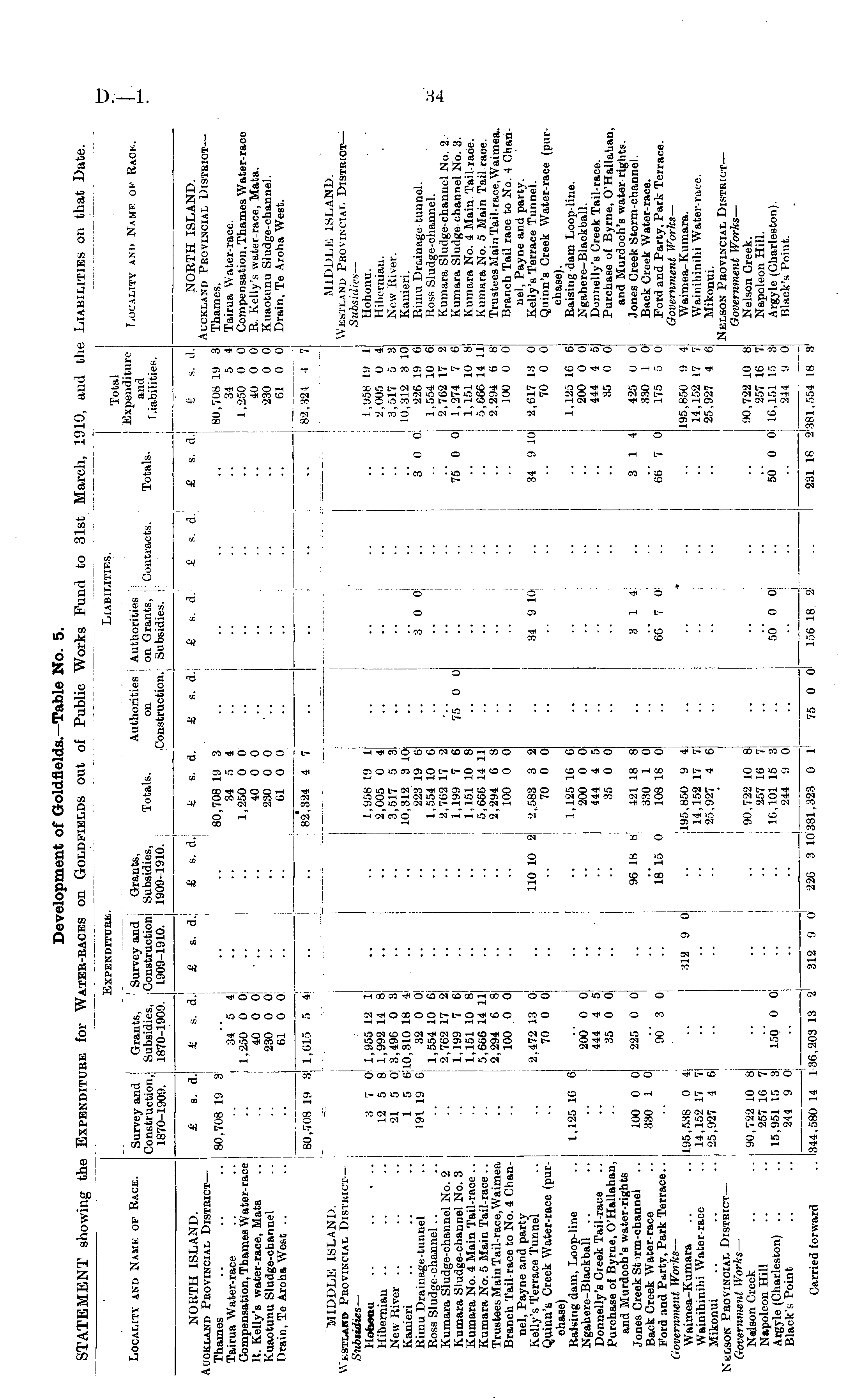 Development of Goldfields.— Table No. 5. STATEMENT showing the Expenditure for Water-races on Goldfields out of Public Works Fund to 31st March, 1910, and the Liabilities on that Date.