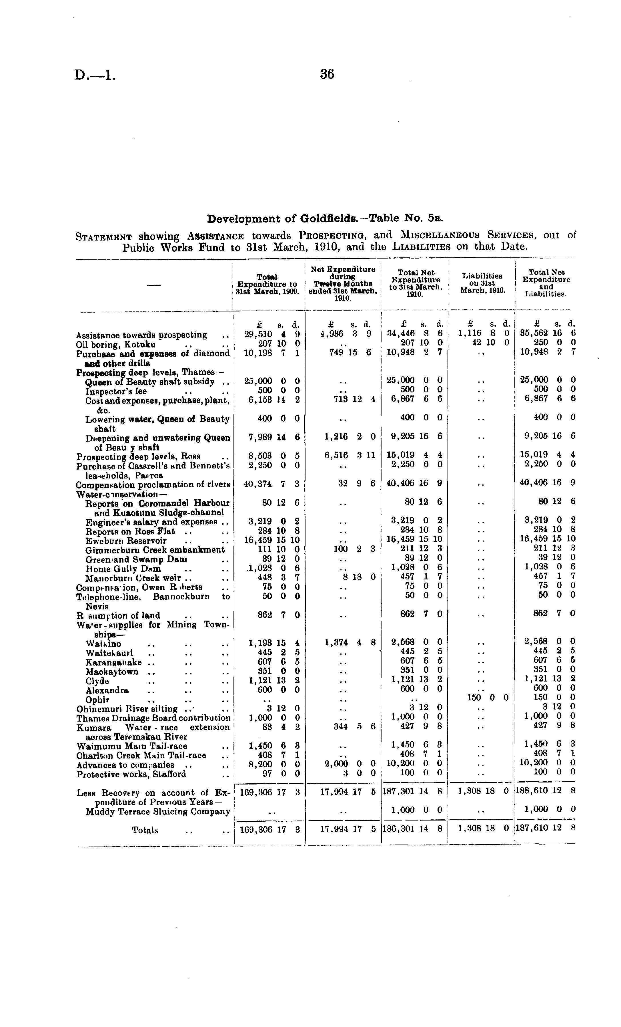 Development of Goldfields.-Table No. 5a. Statement showing Assistance towards Prospecting, and Miscellaneous Services, out of Public Works Fund to 31st March, 1910, and the Liabilities on that Date.